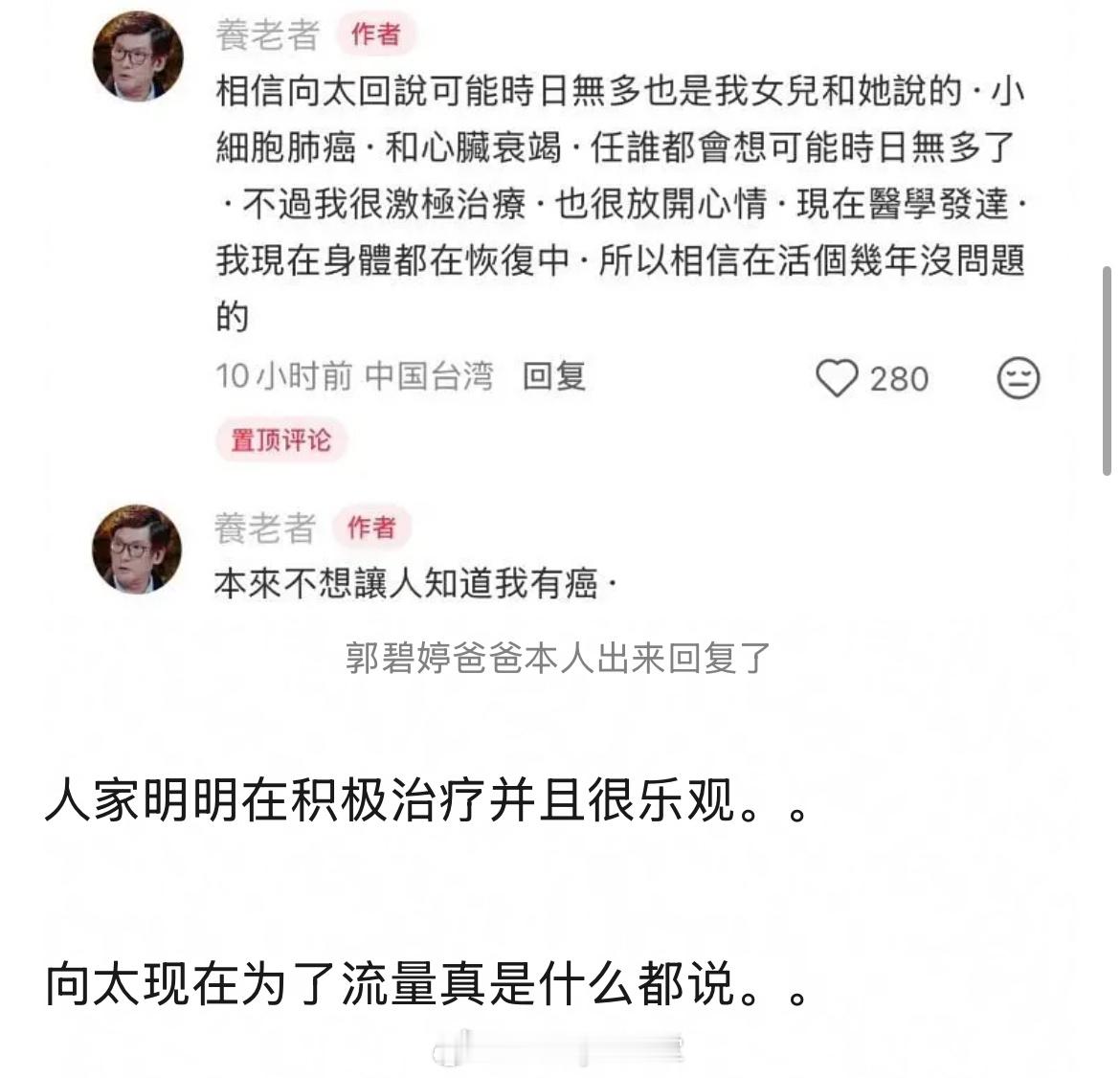 向太在节目上说郭碧婷爸爸生病,不知道会不会好,也有可能是最后的日子……然后郭碧婷爸爸亲自出来回应了,说自己有在积极治疗,也不想让人知道这件事,没想到向太就这么说出来了,好过分啊……