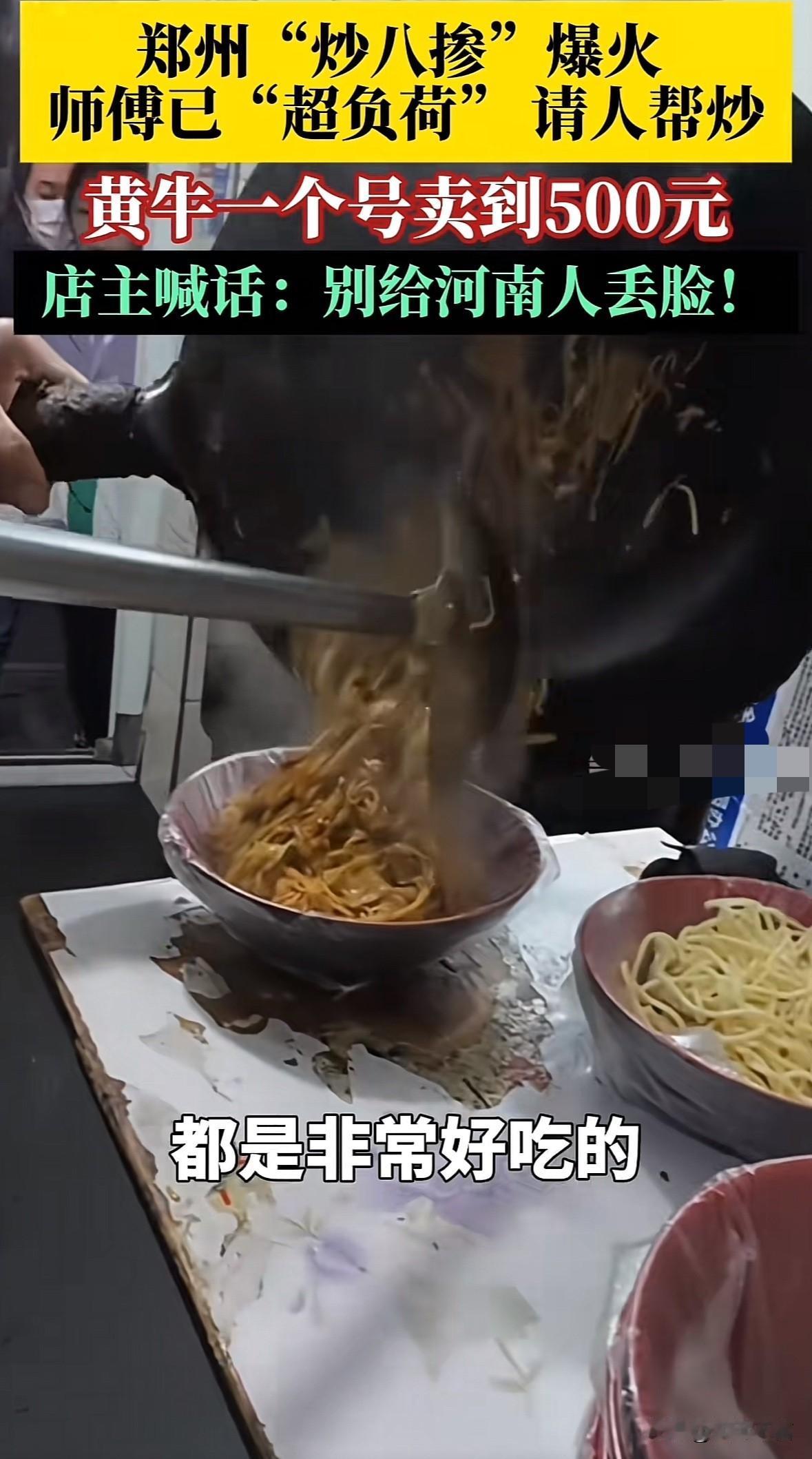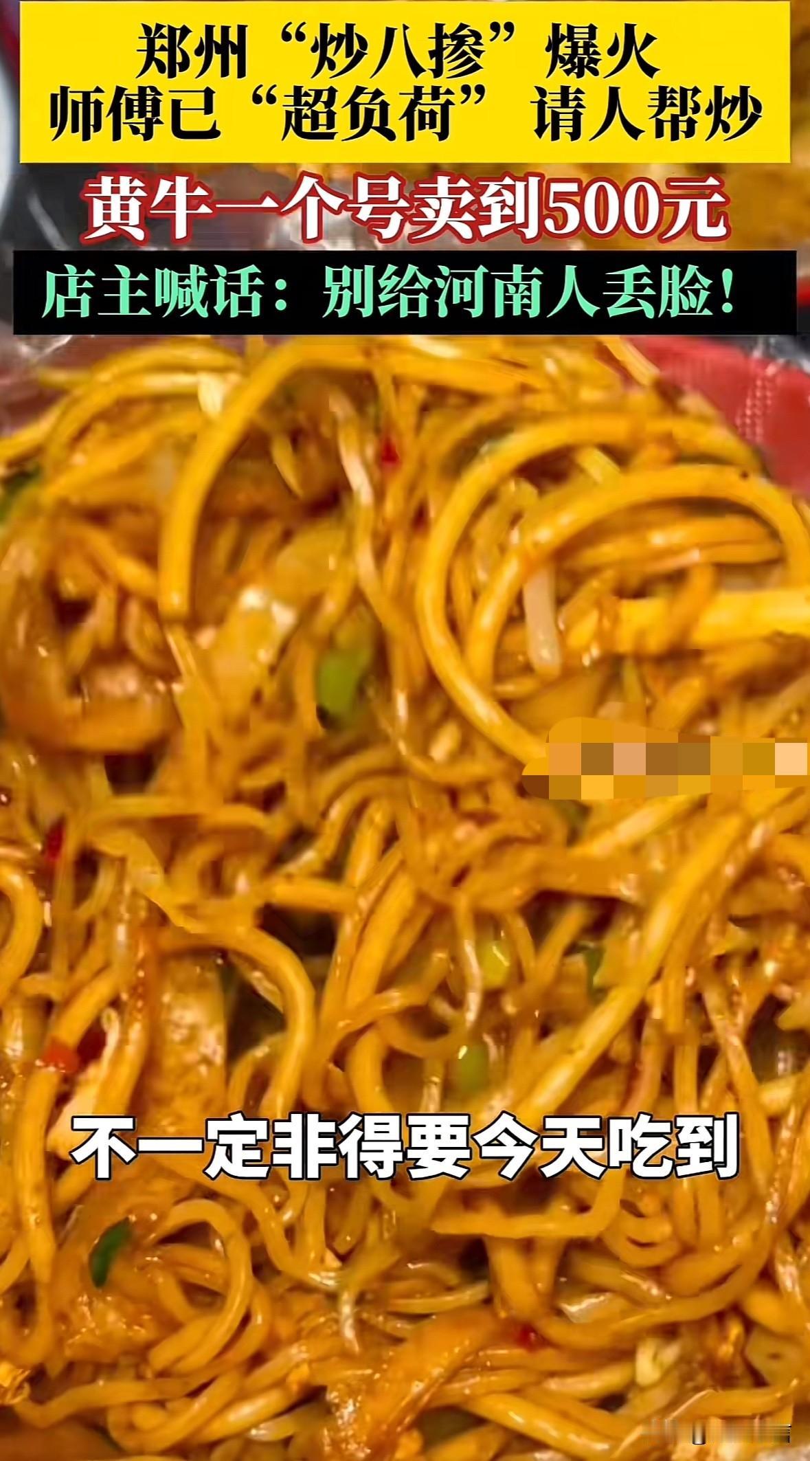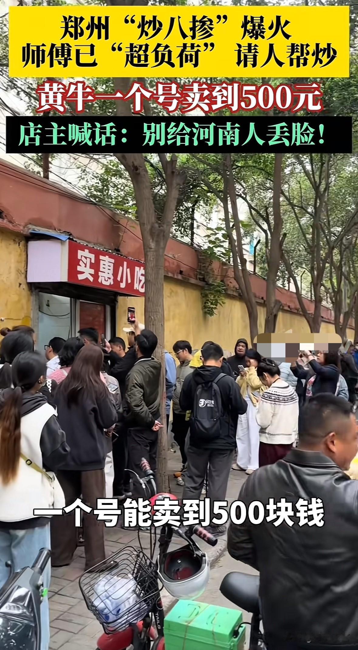 不敢相信,为了吃一碗郑州“炒八掺”,有“黄牛”排队一个号卖500元,店主拿喇叭喊话“不要给河南人丢脸” 现在真不知道啥时候、什么东西就突然火了,像前段时间的景德镇“鸡排哥”,就卖个鸡排直播每天好几万人在线看 如今这个大杂烩“炒面”居然也红了,很多人从外地开车来排队吃,而且有人打起了排队的主意,诞生了排队挣钱的“黄牛”,一个号能卖到500元,简直不可思议 一碗面才12元,花500买个号再去吃面,这个账怎么算都是不划算的 来个郑州本地人说说,这个“炒八掺”好吃吗?如果是你会排队去买吗?
