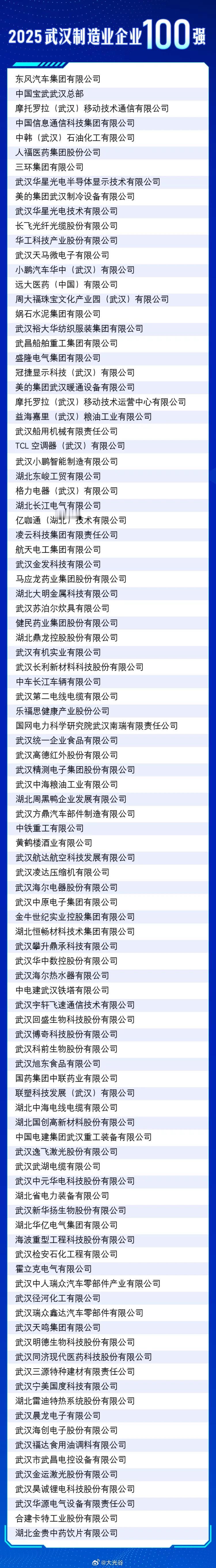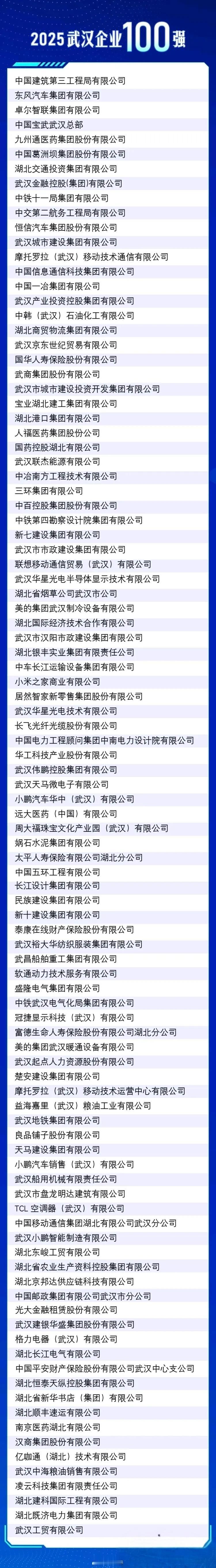 2025武汉企业100强发布! 10月17日,武汉企业联合会、武汉企业家协会、武汉发展战略研究院联合发布《2025武汉企业100强、制造业企业100强、服务业企业100强分析报告》