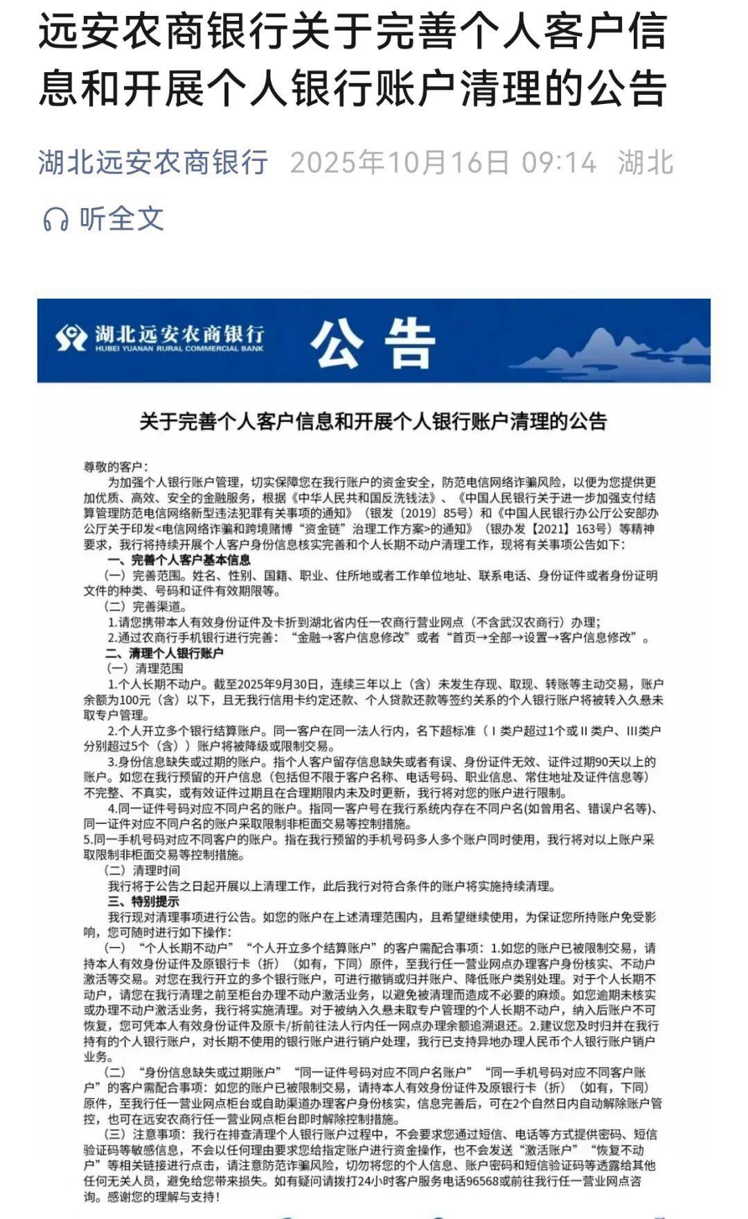 银行卡里的“沉睡资金”要遭殃?多家银行清理长期不动户,你中招了吗? “我那张存了几十块钱、好几年没用的银行卡,居然要被银行清理了?”近期,多家银行发布的一则公告,让不少人慌了神。 从10月15日起,兴业银行等多家银行开始对“长期不动户”开展管控或清理。不同银行认定标准不一,有的规定“6个月无交易、余额低于100元”即为不动户,有的则将“余额10元以下、连续一年无交易”的账户纳入管理(社保卡、公积金卡除外)。 银行说这是为了防范洗钱、电诈风险,可对于普通储户来说,突然得知自己的闲置账户要被处理,多少有些猝不及防。 如果你也有长期没用的银行账户,赶紧去查查!别等账户被管控了,才想起里面还有自己的“血汗钱”。