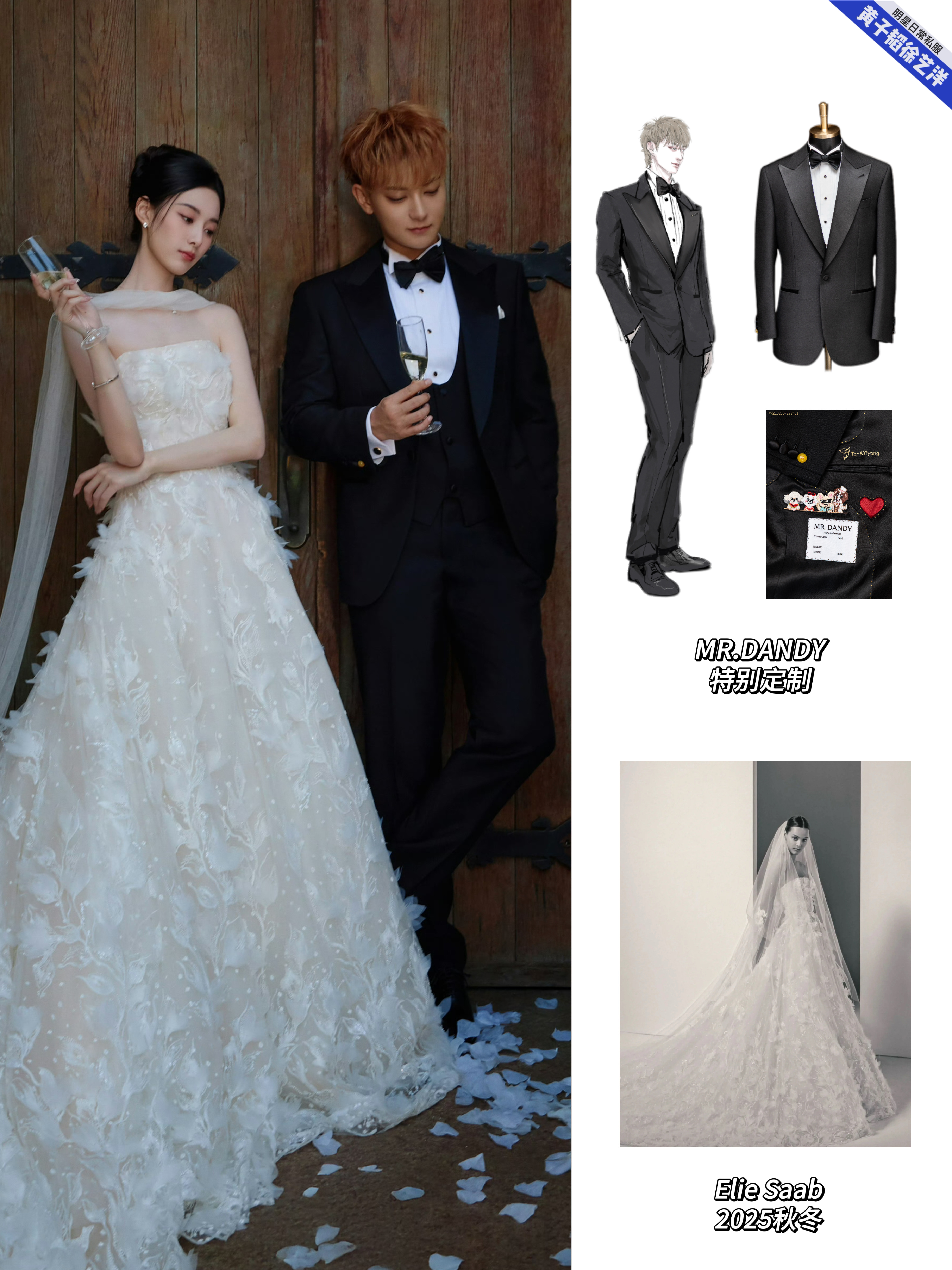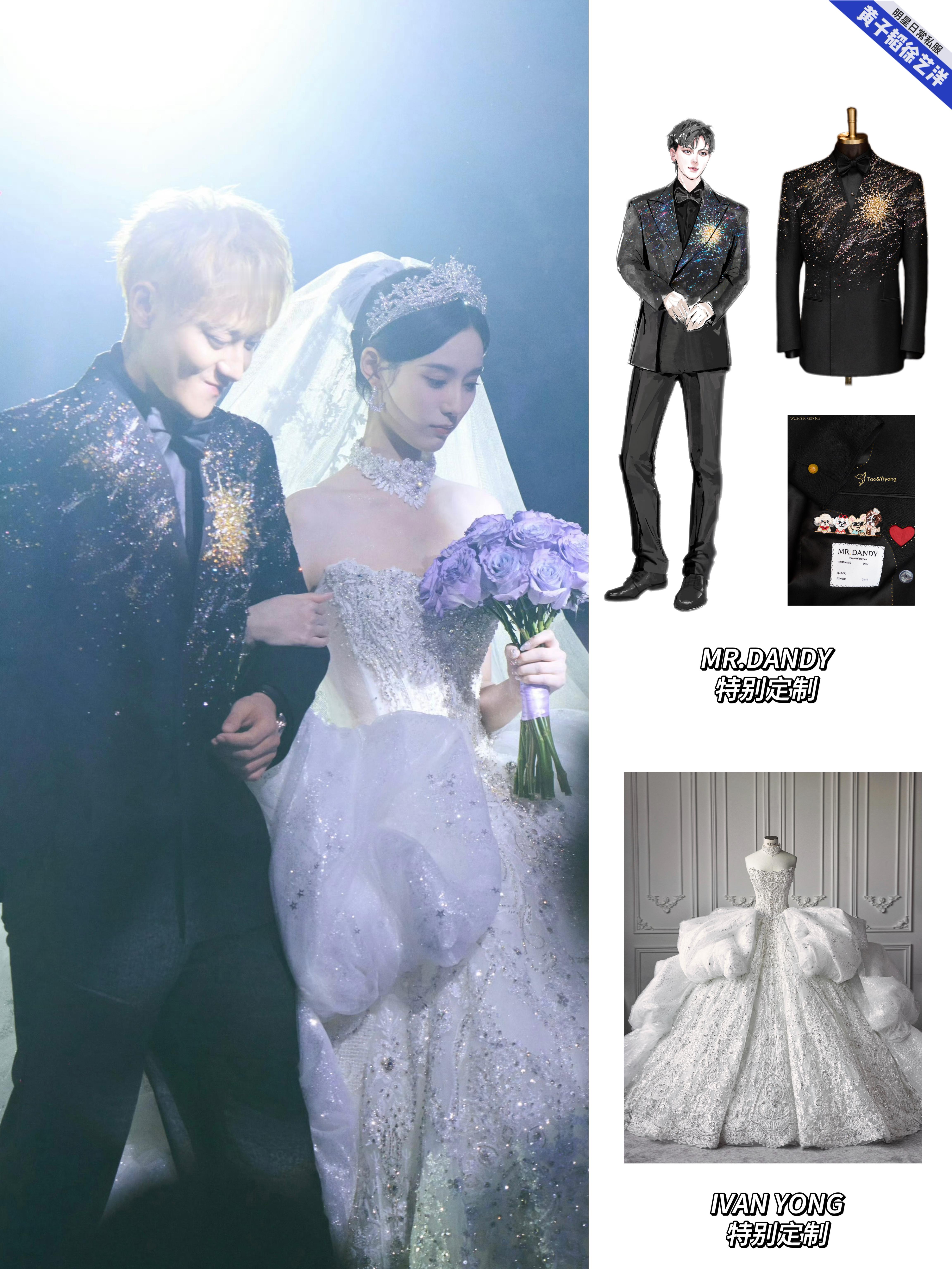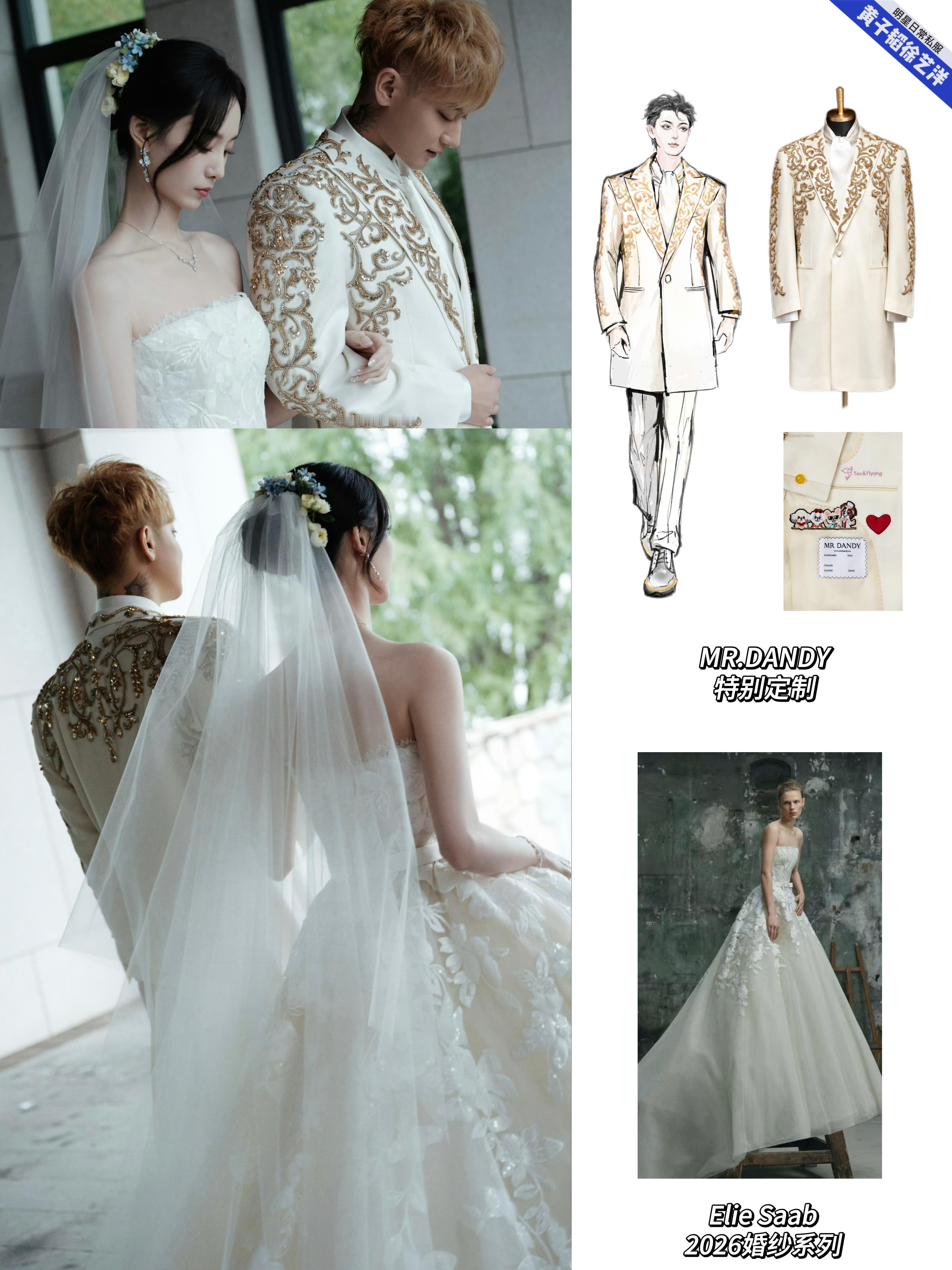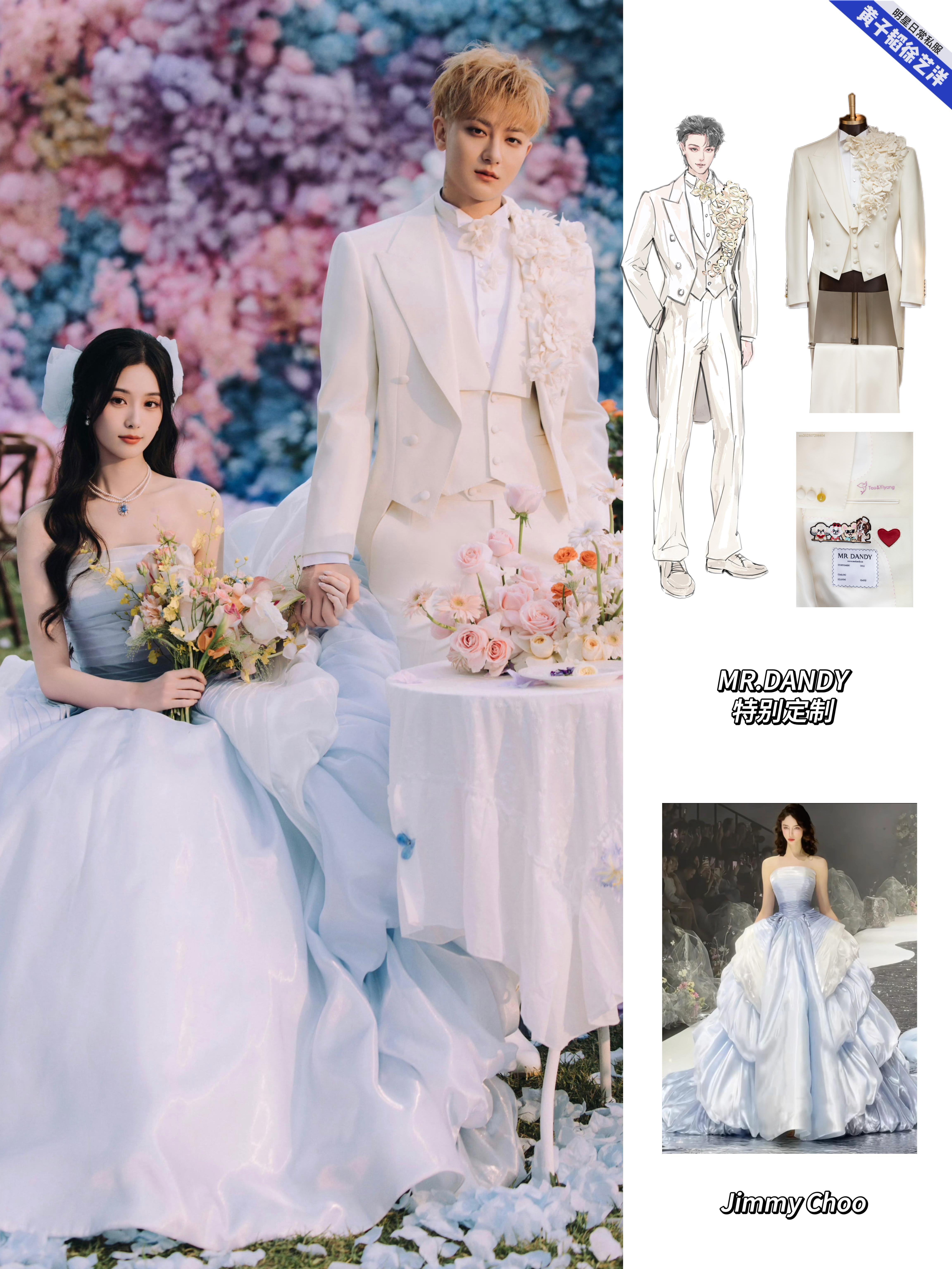 黄子韬徐艺洋大婚的婚礼现场照和婚纱照中的婚服盘点,黄子韬婚礼的盘龙在天新中式青年装、梦幻童话立体花朵燕尾服、黄金铠甲白色重工刺绣礼服、星河宇宙黑色重工刺绣礼服以及婚纱照的礼服全部来自MR.DANDY特别定制,每一套无论从礼服名字到现场效果,都能感受到是王子和公主的浪漫爱情故事!而且每一套都藏着这些爱的细节:袖口的龙珠扣子,Tao&Yiyang刺绣,还有他们的爱宠!