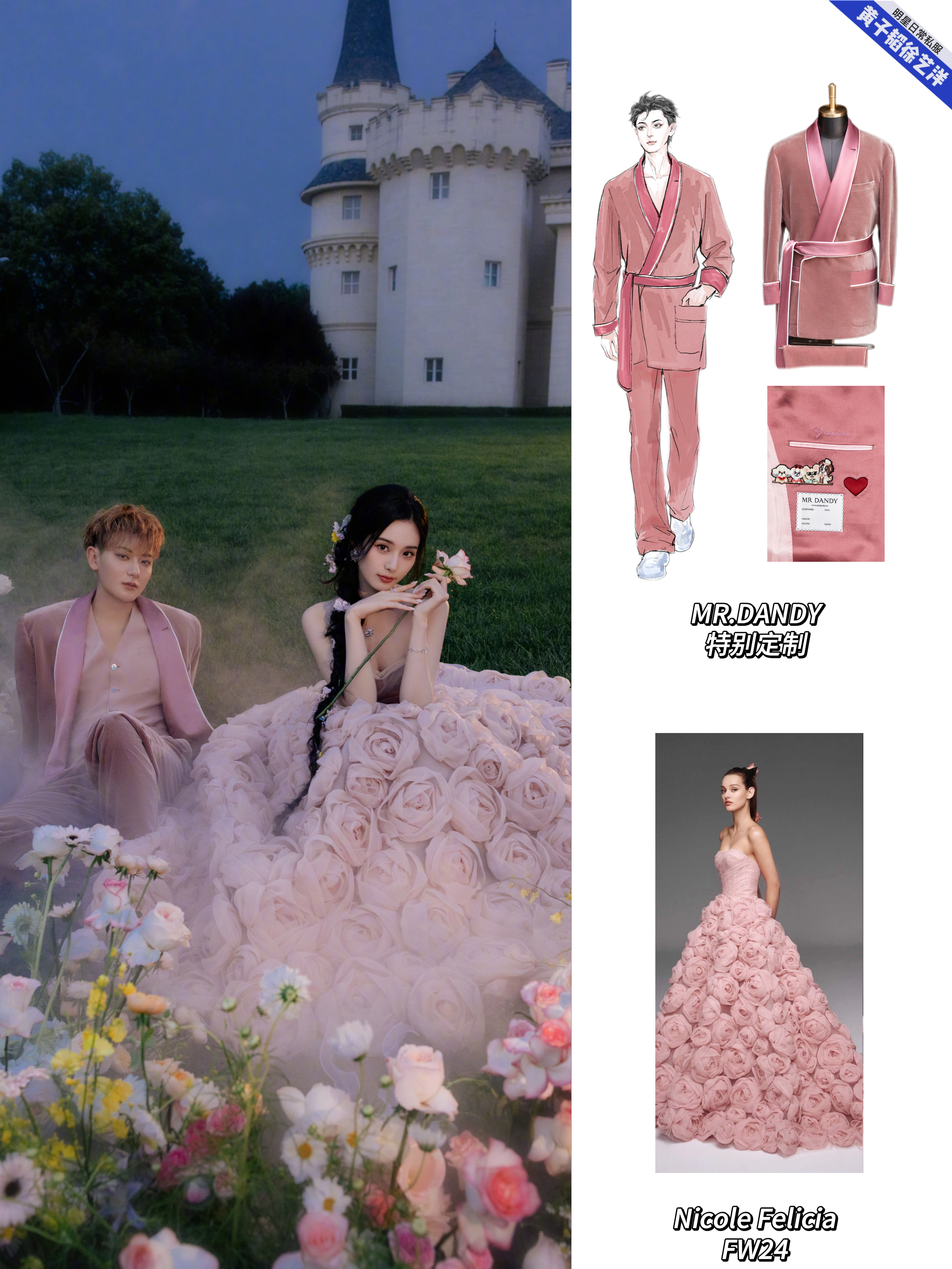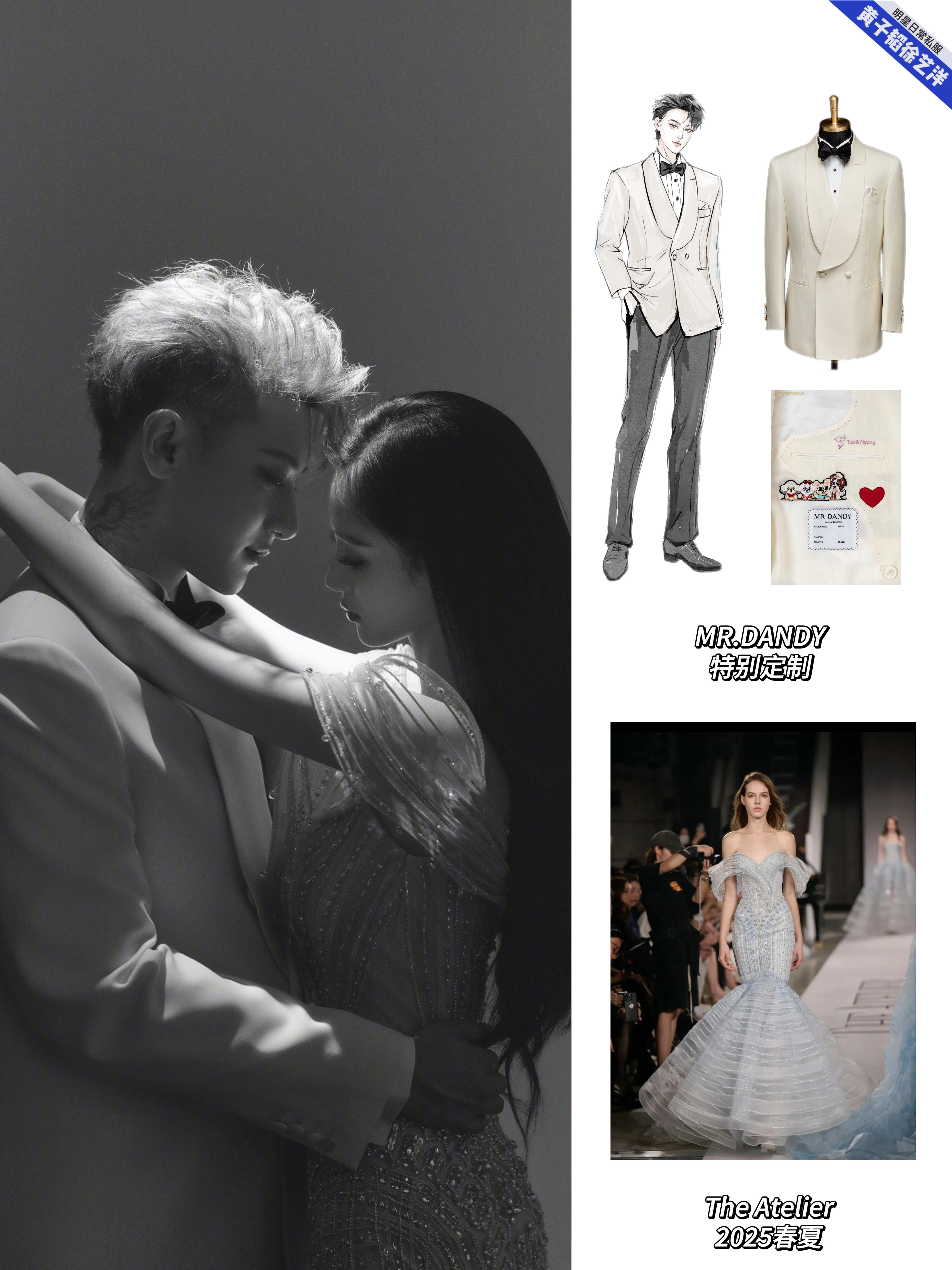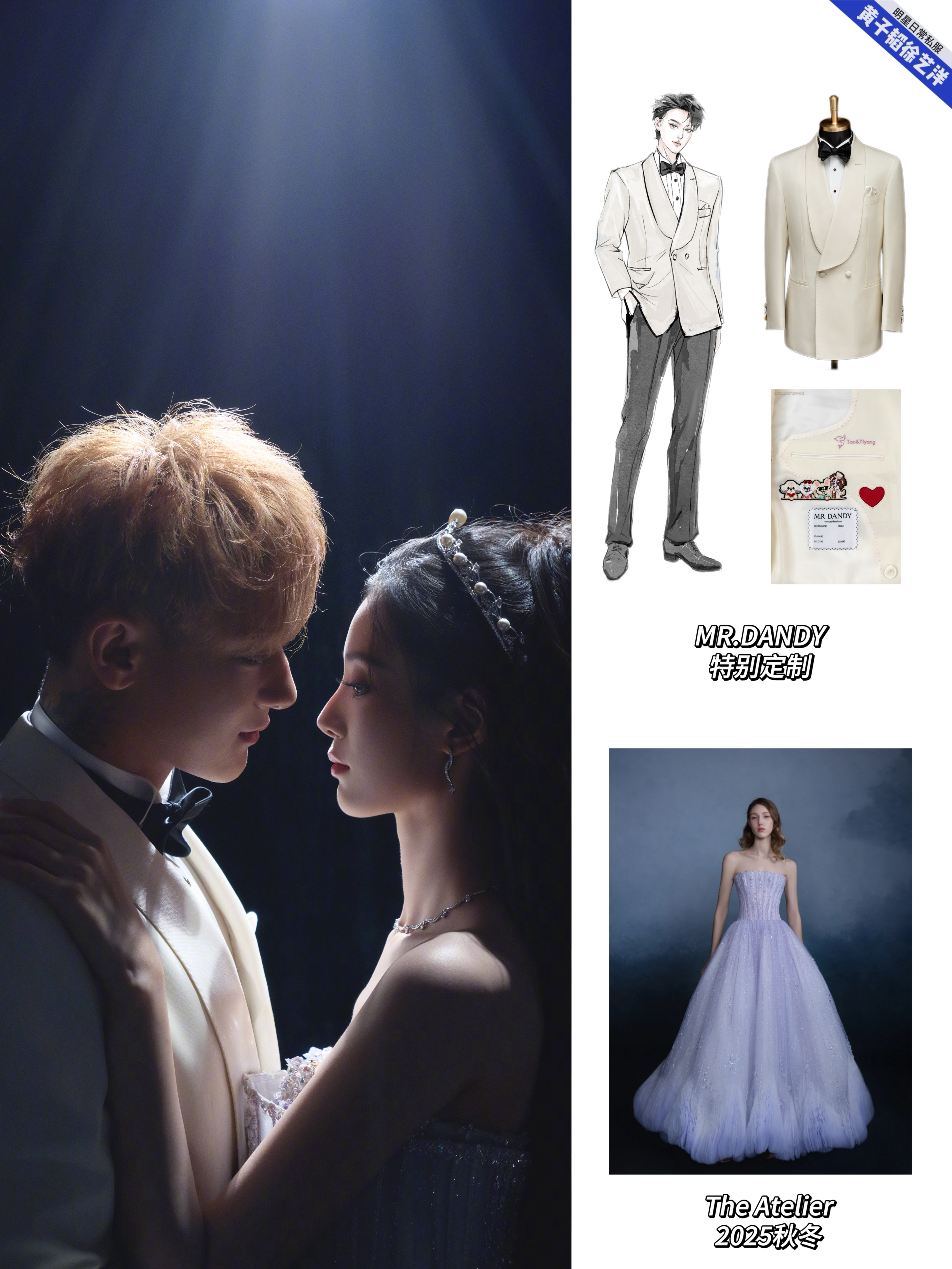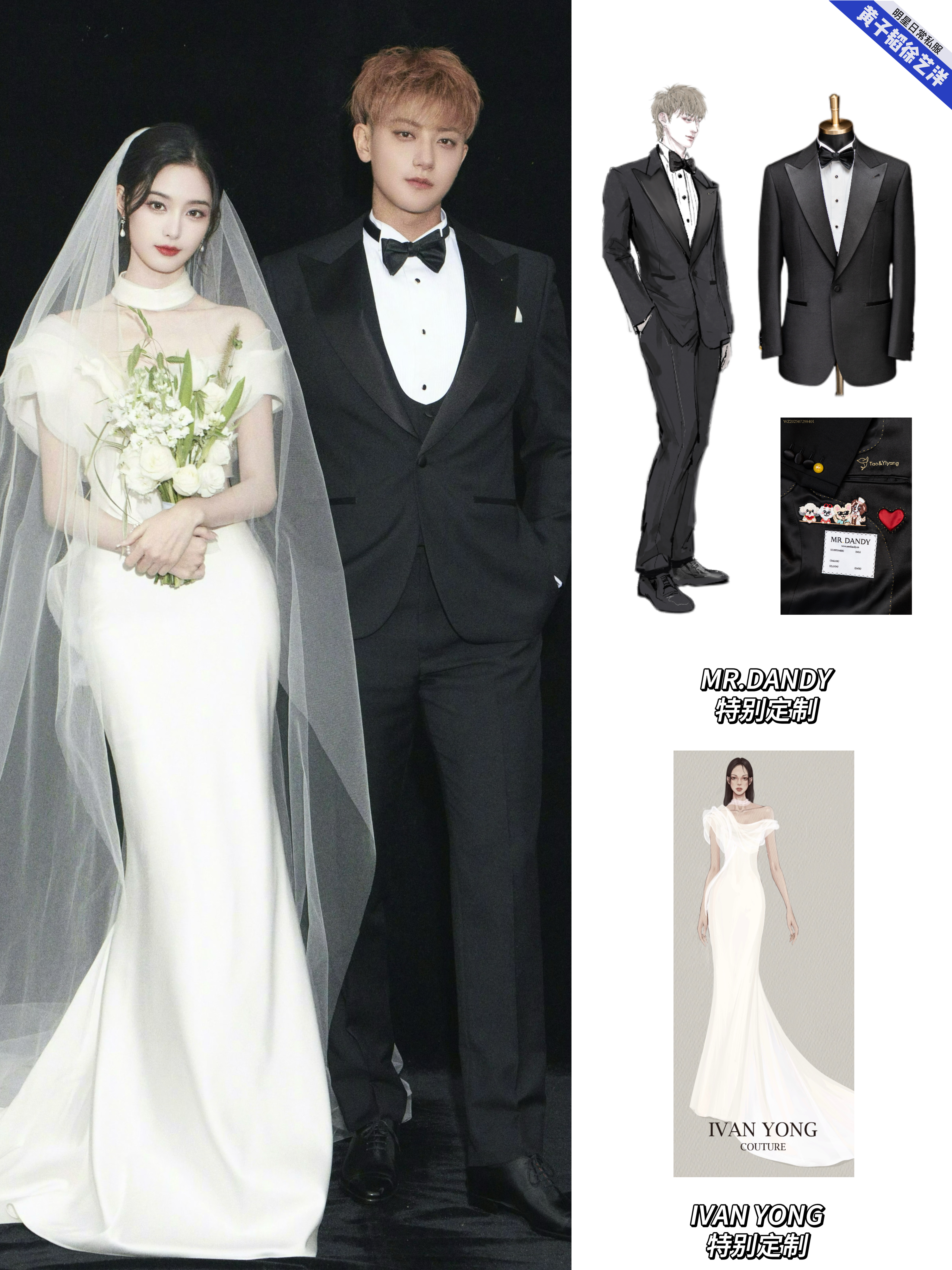 黄子韬徐艺洋大婚的婚礼现场照和婚纱照中的婚服盘点,黄子韬婚礼的盘龙在天新中式青年装、梦幻童话立体花朵燕尾服、黄金铠甲白色重工刺绣礼服、星河宇宙黑色重工刺绣礼服以及婚纱照的礼服全部来自MR.DANDY特别定制,每一套无论从礼服名字到现场效果,都能感受到是王子和公主的浪漫爱情故事!而且每一套都藏着这些爱的细节:袖口的龙珠扣子,Tao&Yiyang刺绣,还有他们的爱宠!