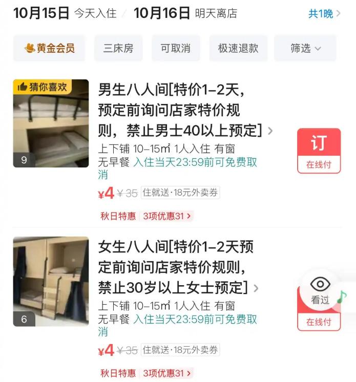 岁被拒 8 元青旅?成都商家设年龄门槛,美团装傻太气人 刷到条离谱新闻:成都网友想订美团上 4 元一晚的青旅,结果系统直接弹警告 ——“女士 30 岁以上禁订”,男士的年龄线更是卡在 40 岁。这哪是订房,分明是给年龄贴标签! 记者一查才发现,这种怪事还不少。好几家青旅的 8 人间特价房都挂着类似限制,价格低到 4-12 元,比路边摊早餐还便宜。可等打电话问店家,又改口说 “线下不强制”,还暴露了隐形规则:得帮着冲销量、写好评、下载 APP,光操作就得十几二十分钟,还得交 30 块押金。 老板们倒有 “理由”,虎溪民宿的陈女士说之前年长住客早睡,年轻人熬夜,吵到报警;还有人嫌老人打鼾,闹得不可开交。合着为了省麻烦,就把 30+、40 + 的人全划进 “麻烦户”? 更气人的是平台的态度。美团客服先说这是 “商家特定优惠”,被问 “禁止” 俩字违规不,才支吾着说 “没注意细节”,只承诺反馈评估,连个处理准信都没有。可国家早就明确平台不能放任商家搞不合理限制,这审核怕是睁只眼闭只眼。 律师直接戳破猫腻:这就是年龄加性别的双重歧视!北京市中闻律师事务所的谭敏涛说了,“怕麻烦” 太主观,根本不是正当理由,违反了消保法,市场监管部门能罚钱整改的。要是真被拒了,保留截图打 12315 就能举报。 其实这套路不新鲜,跟那些 “百元低价游逼你花几万购物” 的坑一个路数 —— 先拿低价勾着,再玩各种猫腻。就因为违法成本低,平台又爱甩锅,才让这些商家有恃无恐。 30 岁想省点钱有错?40 岁想体验青旅不行?商家真怕冲突,不会按作息分房、备点防打鼾耳塞?平台真负责任,不会让歧视标语挂半天。 年龄从来不是被拒绝的理由。你遇过这种隐形歧视吗?要是被青旅拒了,会较真维权不?评论区聊聊,别让公平被低价套路欺负了!