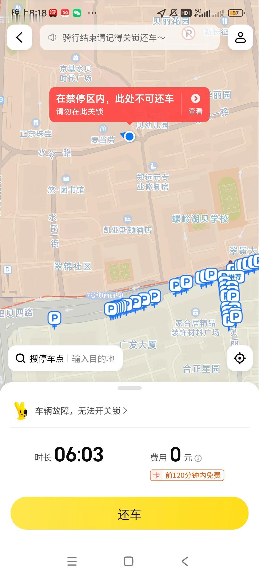 这个美团单车,骑行方便,扫一扫,可以到处走,,可是到了水贝这里,还车是个大麻烦,很多地方禁止停车,不按要求停车,罚款10元,,,[捂脸][捂脸], 我找了好多地方,还不了车,要去几百米外才能还车。太麻烦了,,又不是小汽车,体积大,乱停影响交通,一个自行车,停哪里影响也不大,,,后来,又个小伙子想骑车,我干脆不还了,让小伙子骑走,我远程还车,,,二个小时内是免费的,,