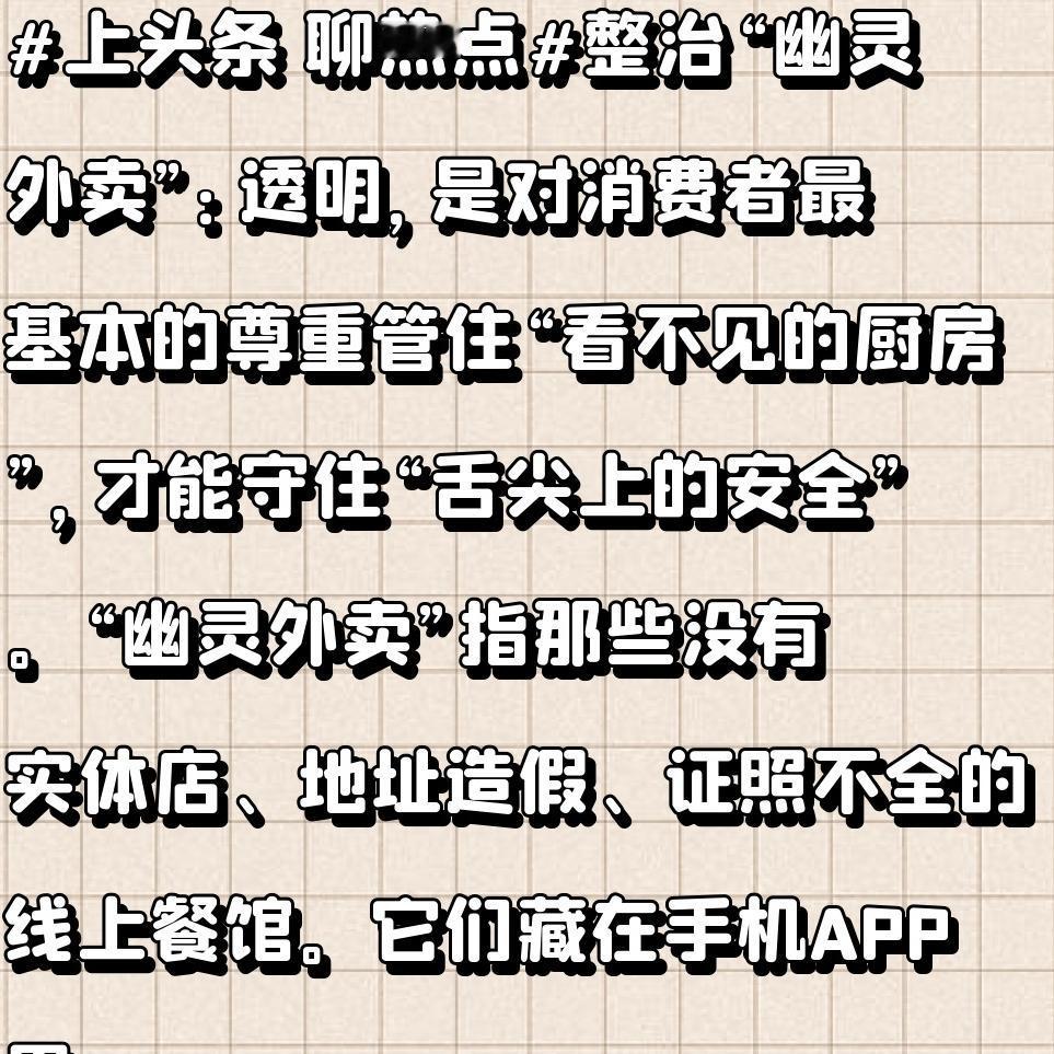 整治“幽灵外卖”:透明,是对消费者最基本的尊重 管住“看不见的厨房”,才能守住“舌尖上的安全”。 “幽灵外卖”指那些没有实体店、地址造假、证照不全的线上餐馆。它们藏在手机APP里,厨房可能藏在车库或出租屋,卫生状况全凭想象。市场监管总局新规的出台,正是要把这些“幽灵”揪到阳光下。安全不是凭空喊的,是靠实打实的资质、透明的信息、严格的监管堆出来的。平台不能只顾抽成,不管风险;商家不能只赚快钱,不顾责任。 小王的“麻辣香锅”,吃出了现实版“惊悚片”。 我的同事小李,上周点了一家评分4.8的“川味麻辣香锅”。菜品诱人,评价一片好评。送到后,他却吃出了橡皮筋。气不过,按地址找过去,发现根本是个修车铺!老板懵了:“我这儿只修轮胎,不炒菜啊!”后来才知道,那家店盗用了别家资质,照片是假的,地址是编的,所谓的“厨房”可能连自来水都没有。小李的遭遇不是个例——“幽灵外卖”就像开盲盒,你永远不知道吃进嘴里的,是美味还是隐患。 让“阳光”照进外卖的每个角落,需要规则,更需要行动。 新规要求平台对“无堂食”商家加注标识,严格审核资质,推动“互联网+明厨亮灶”。这些举措,是把选择权还给了消费者。监管是底线,平台是关口,而每一个用“点击”投票的我们,才是最终的守护者。别再让“方便”成了“随便”,别等吃出问题才后悔。从现在起,点外卖前多看两眼资质,多查一眼标识——你的谨慎,是对无良商家最有力的回击。 毕竟,吃饭不是冒险。安全,才是美食的第一味。