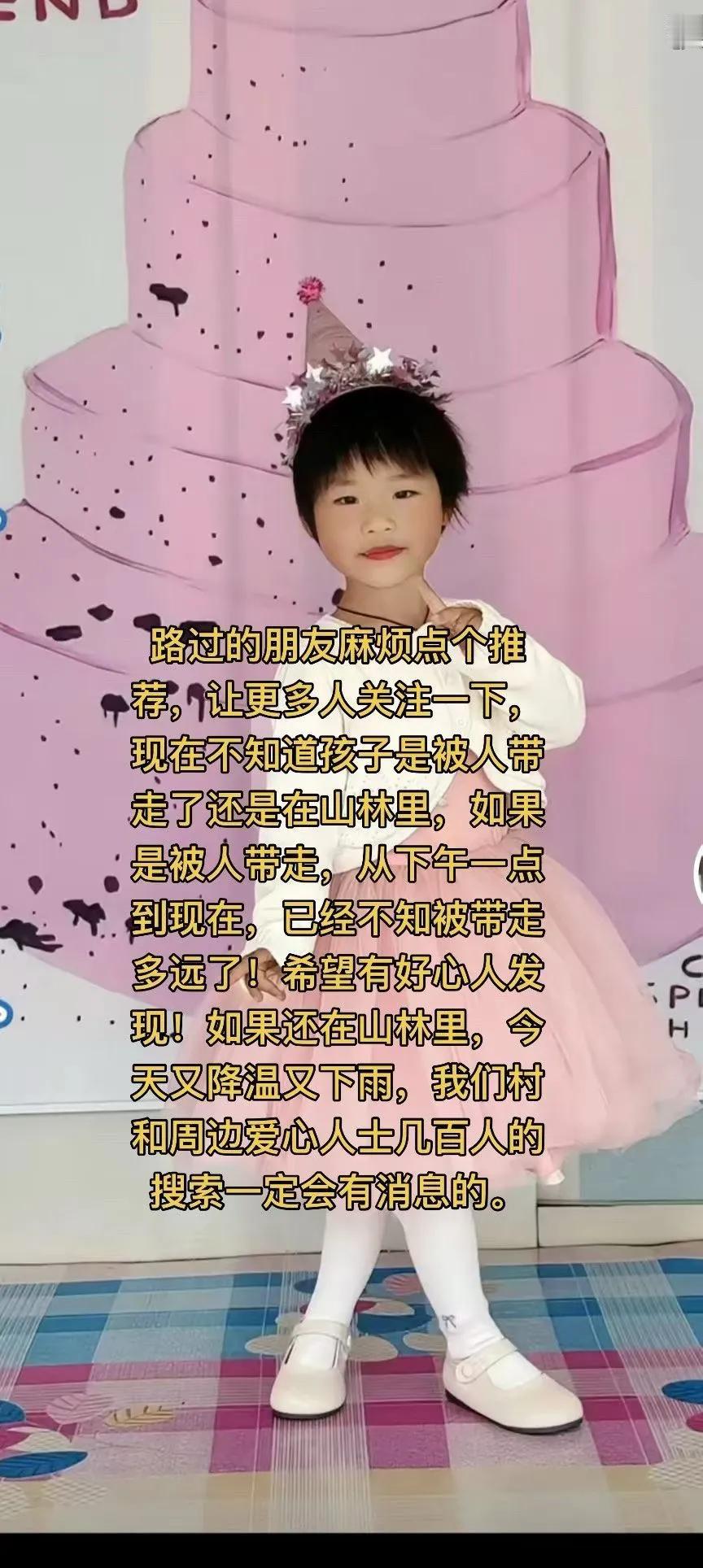 心急火燎寻找一个丢失4岁小女孩! 辽宁省朝阳市建平县黑水镇四分地村丢失一个4岁小女孩,名字叫丁一,身穿图片中的红色上衣,10月15日下午一点半左右孩子不见了,到现在没找到,村民,民警直升机,警犬,都在搜查,各路口已经封锁排查,有看见的请马上联系黑水派出所民警,18842188837!爷爷丁海涛,奶奶肖桂华,爸爸丁一斐! 事情经过是,爷爷是村里种田大户,就这个小孙女,15日下午13点左右爷爷奶奶,爷爷开面包车去地里看庄稼收割,就是最后收割尾声。这之前去地里也经常带着孙女。 地里旁边一条乡道,平时也没有多少外地车辆通行。地里不远就是山,山上有一片松树林,林中也没有大型野生动物。 俩老人下车把4岁孙女放面包车里,孙女睡觉状态,爷爷把车门锁上了,担心有人进入,也担心孙女睡醒了跑出去,但是,爷爷把车窗放下了,怕空气不流通,憋着孩子。 只是半个多小时功夫,爷爷奶奶回来,发现孩子不见面。 孩子亲人万分感谢建平警方,武警。动用上千警力,军犬,在附近山林连同无人机搜索一天一夜,未见孩子下落。 家属表示,无论相关人以何种心态方式,把孩子转移到另一个地方,只要保证孩子安全,把孩子交给他们,不声不响也行,孩子爷爷都不追究任何责任,并且给现金重谢! 希望知道孩子下落的人士,从可怜一个四岁孩子生命为重,从善良出发,让孩子早日回家。 您的举动会得到所有人谅解,甚至得到重金奖励!