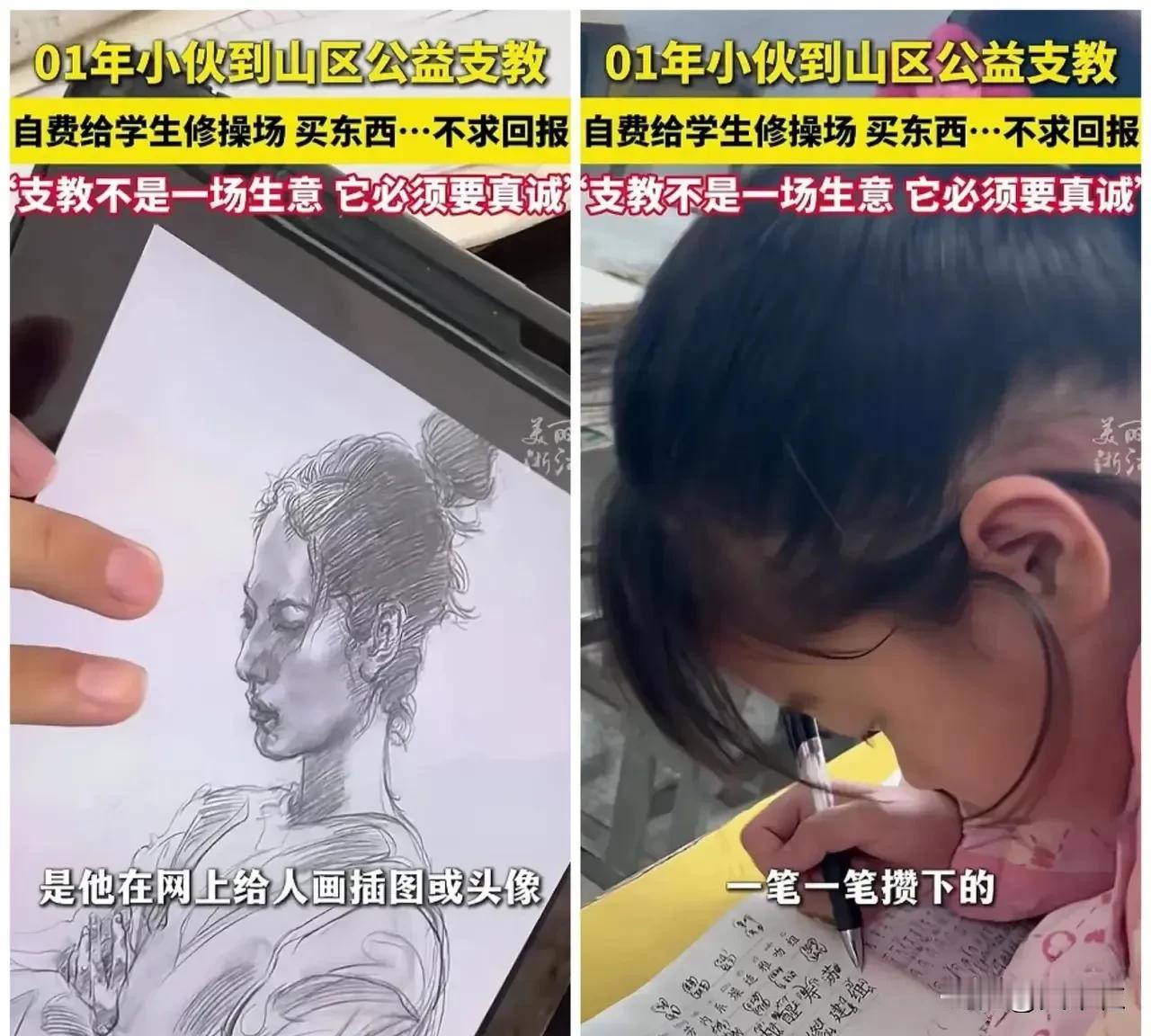 01年小伙在乡村公益支教打脸了多少“名媛”!他说“支教不是一场生意,它必须要真诚!”曾自费2万元给学校修操场,网友觉得他人傻钱多,而我愿称之为“先生”大义! 近日,有媒体曝光了这位01后的乡村支教老师,他今年才23岁,但是已经在山区公益支教了几年! 所谓的公益支教说白了就是免费的“劳动力”,在这里没有工资,没有绩效,也没有奖金,一切都是心甘情愿的付出。 公益支教的这条路很难走,但却很容易收获人心,收获流量,所以之前就有很多“名媛”盯上了这条流量大道! 只不过有很多“名媛”都是去拍照,打卡,直播,她们把这当做是流量变现池,利用它做生意,赚了钱,但却伤害了学生的感情! 小伙子和她们不一样,他说“支教不是做生意,他必须要真诚!” 他刚来学校发现操场很破旧,整个学校只有38个学生,他们没地方玩,他就自费2万帮学校修好了操场,还购置了健身器材,让学生有运动的地方。 他还给这些生活贫困的学生买了很多东西,花了很多钱,不求回报的付出! 有人好奇他才23岁,他的钱从哪来,学校又不给他发工资。 后来人们才知道,他白天上课,晚上就利用空余时间画画,他画画很厉害,就把这些画发到网上卖钱! 有人觉得他画的很好,还出钱请他帮画头像或者插图,靠着这些“兼职”维持自己的生活。多余的钱,他全部花在了学生的身上! 有媒体问他“为什么要这样做!” 他说“这些事总得有人做!” 是啊,有些事总得有人做,但只是靠一个人,能做得了多少呢? 他的事迹引发了网友们的讨论! 有网友说,先生大义,他不求回报的付出打脸了多少人?支教已经是公益免费了,还要自掏腰包改善学校环境?当地政府脸红吗? 还有网友说,那些打着支教名义去直播赚流量的网红们好好学学吧!看看什么才叫支教! [个人感受] 我希望公益支教的人越来越多,但像小伙这样的人越来越少! 他们已经为教育奉献了自己的青春,不应该在花费自己的钱了! 他的事迹令人感动!这样的乡村支教老师值得大家的赞誉和尊重!