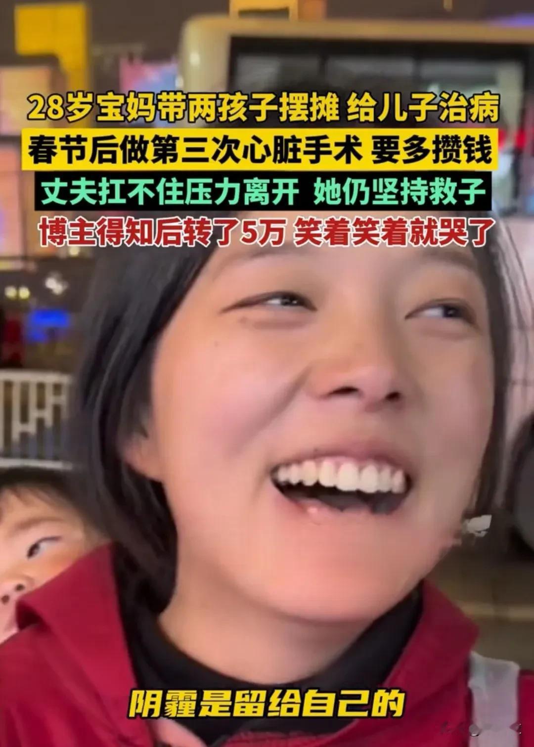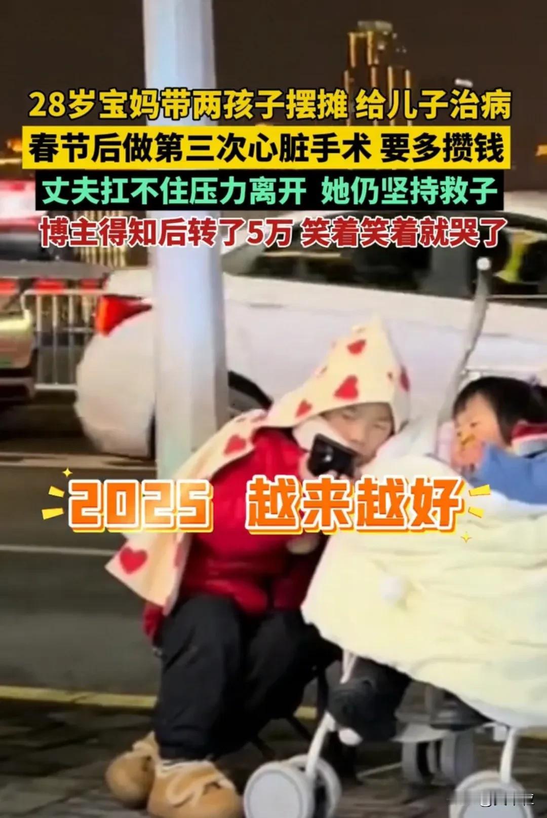 看哭了!重庆的深夜,女子带着一对儿女在路边摆摊卖豆干,男子厚着脸皮上前问女子能不能免费请他吃一份!女子愣了一下,但还是笑着答应了!可谁知道男子吃完后却给她转了 5 万块钱,说想给女子和孩子一点帮助! 原来,女子背后的故事令人泪目! 重庆的街头,女子像往常一样,带着两个孩子在路边摆摊。 她身上背着小女儿,大儿子则安静的坐在一旁等她们,大儿子很懂事,也不乱跑,偶尔还会帮她的忙。 随着现在天气越来越冷,街道上人也不多,女子的生意越来越不好。 正当她准备收摊回家时,一个男子过来却厚着脸皮过来,问女子能不能给他免费送一份! 女子愣了一下,以为男子遇到困难,随时爽朗的笑着说“没问题”。 在这等待的时间,男子主动跟女子聊了起来,他说“天气那么冷,你为什么还带两个孩子出来摆摊呀?还背着一个,不辛苦吗?” 女子则有点心酸的回答说“没人带呀!” 男子又说“那你老公和公公婆婆呢?” 女子听闻有点难过,她说她今年28岁,10年前第一次结婚有了大儿子,但大儿子先天性心脏病,要做手术才可能恢复,大儿子的爸爸受不住压力,选择了自尽离开了。 她独自一个人抚养大儿子长大。 在这期间,遇到了前夫,她带着大儿子嫁过去以后,又给前夫生了个女儿,但是前夫一家嫌弃她,最终因为家庭矛盾,也分开了。 她离婚后独自带着女儿离开了。 如今28岁的她带着一儿一女相依为命,平常靠摆摊挣钱,现在正在筹钱过完春节以后带大儿子去做第三次的手术。 听完女子的经历,男子有点不好意思,其实他不是没有钱,只是故意这么说而已,女子生活如此不容易,还要免费请自己吃,真是善良啊! 男子不禁对着女子问道:“经历这么多,生活这么难,你为什么还那么乐观和善良?” 女子笑笑说“阴霾是留给自己的,不阳光是改变不了现状的”! 女子的话让男子十分感动,随即他就跟女子表明了身份,男子解释说:“姐,我是做自媒体的,实话跟你说,我刷到你的视频特地来找你的!我不知道你还差多少钱,我给你转5万块钱,希望可以帮助到你”。 女子听完瞪大瞳孔,十分震惊“多少?不不不,这个钱我不能要!” 男子还是坚持说“”这 5 万块钱对于手术来说可能杯水车薪,但我希望还能有更多的人帮助到你,而且新的一年就要到了,早点带孩子回家休息吧,给孩子们买些好吃的!” 而女子的眼泪止不住下流…… 此事引发了热议,有网友说,这个是真的,她是小林妈妈林静,关注她很久了,一个女人真的不容易,希望有更多人关注到她! 也有网友说, 50000块钱,对一个无依无靠,起早贪黑,寒冬露宿,独自带着一儿一女,平常摆摊只计三块,五块的艰辛女人来说,能不激动落泪吗? “阴霾是留给自己的,不阳光是改变不了现状的”,这应该是我进入2025年为止听到的,情感,思想和感受等各种元素包含最多也最至简但却最鼓舞人心的一句话…… 这个世界上,最不缺的就是伟大的母亲了! 母爱真的很伟大,男子也很大爱,毕竟不是谁都能随随便便给陌生人转5万块钱的,这个世界破破烂烂,但总有人在缝缝补补! 穷则独善其身,达则兼济天下,希望有能力的大家都献出一点爱心,帮帮这位年轻妈妈……