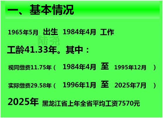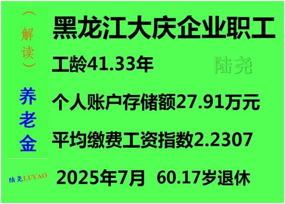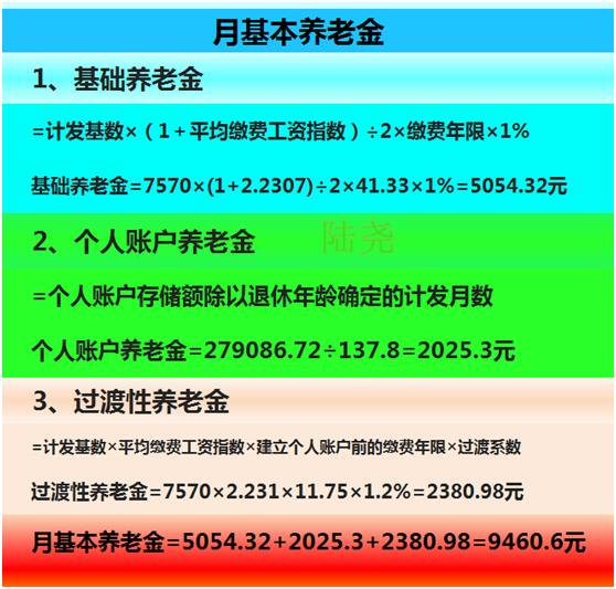 大庆的工人不一般,社保存储27.91万,他退休养老金会是什么水平? (解读)黑龙江大庆企业职工2025年7月60.17岁退休养老金 工龄41.33年。 个人账户存储额27.91万元。 平均缴费工资指数2.2307。 一、基本情况 1965年5月出生,1984年4月工作。 工龄41.33年。其中:视同缴费11.75年(1984年4月至1995年12月)、实际缴费29.58年(1996年1月至2025年7月)。 2025年黑龙江省上年全省平均工资7570元。 二、月基本养老金 1、基础养老金 =计发基数×(1+平均缴费工资指数)÷2×缴费年限×1% 基础养老金=7570×(1+2.2307)÷2×41.33×1%=5054.32元 2、个人账户养老金 个人账户累计储存额÷计发月数(60.17岁退休计发月数为137.8) 个人账户养老金=279086.72÷137.8=2025.3元 3、过渡性养老金 =计发基数×平均缴费工资指数×建立个人账户前的缴费年限×过渡系数(过渡系数为百分之一点二) 过渡性养老金=7570×2.2307×11.75×1.2%=2380.98元 月基本养老金=基础养老金5054.32元+个人账户养老金2025.3元+过渡性养老金2380.98元=9460.6元 工作41.33年,核发退休养老金为9460.6元,折合每年228.88元。 祝退休朋友,安康快乐!
