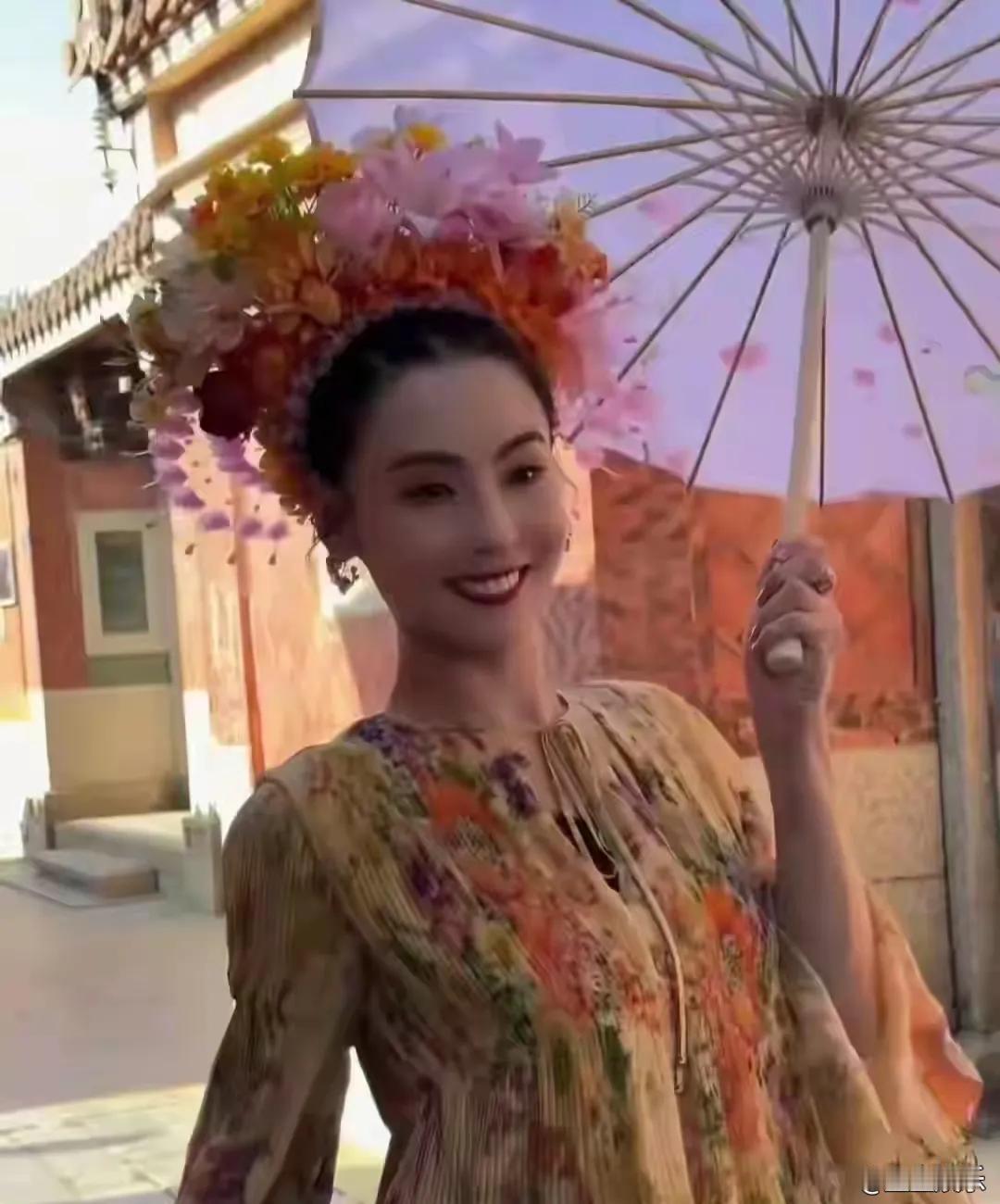 张柏芝在泉州录制综艺时,头戴国家级非遗“蟳埔女簪花围”,明艳繁花簇拥鬓间,宛如“