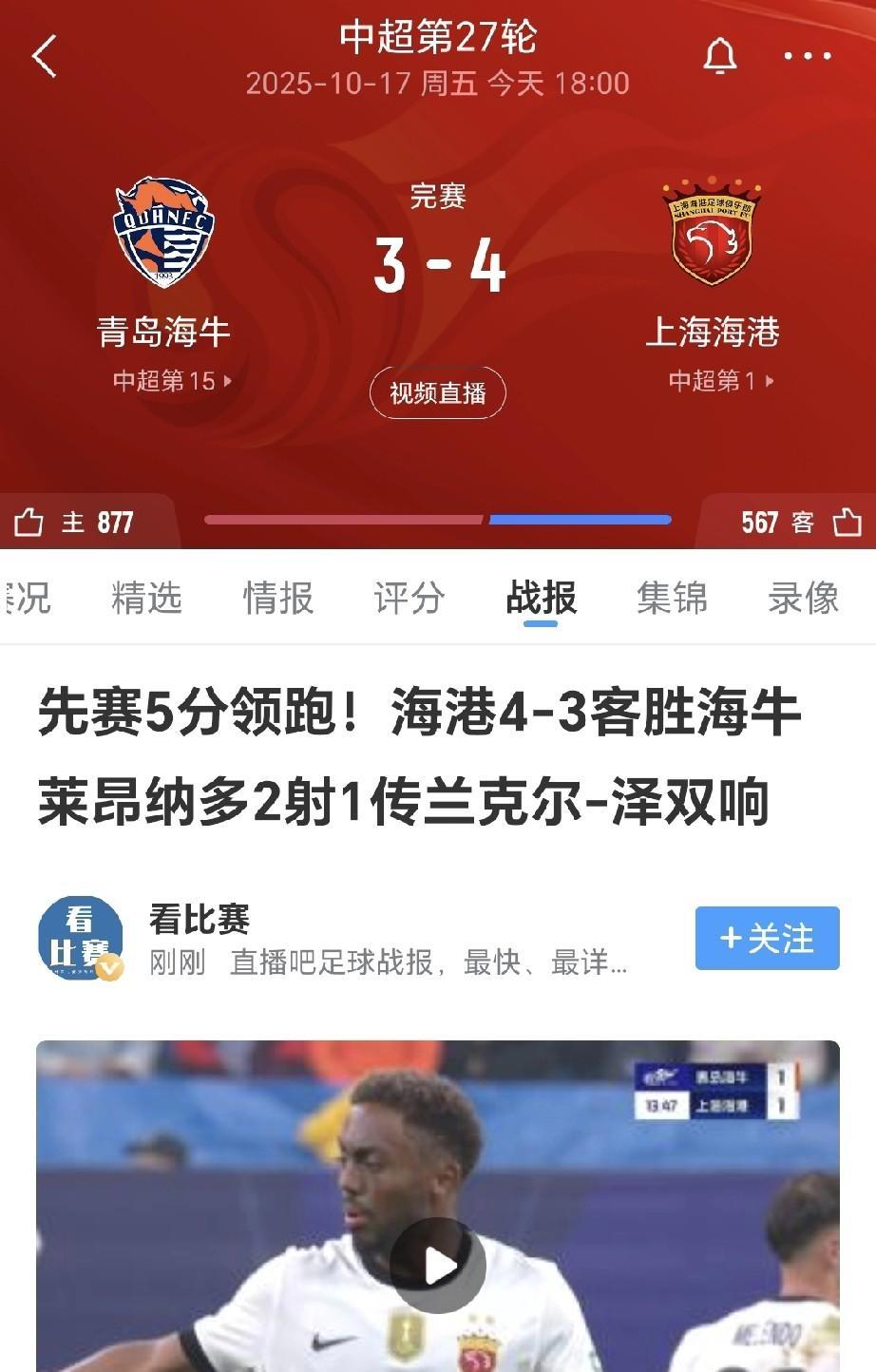 功亏一篑,青岛海牛降级概率达到80%。中超联赛第27轮,先进一球的青岛海牛主场3:4输给上海海港,进一步掉入降级深渊,上海海港逃过一劫,卫冕冠军希望进一步增加。 有一说一,上海海港被保级球队打进三球,想要卫冕还需要提升防守硬度。莱昂纳多两传一射,是上海海港获胜的功臣。青岛海牛状态出来晚了,他们在前面发挥不好,今天面对争冠队伍上海海港发挥不错,但是无力回天。 不得不说小伙子李新翔太帅了,扣球过人和射门一气呵成,是中国足球未来的希望。 那么问题来了,您认为上海海港能够夺冠吗?青岛海牛保级还有没有机会?#中国足球#