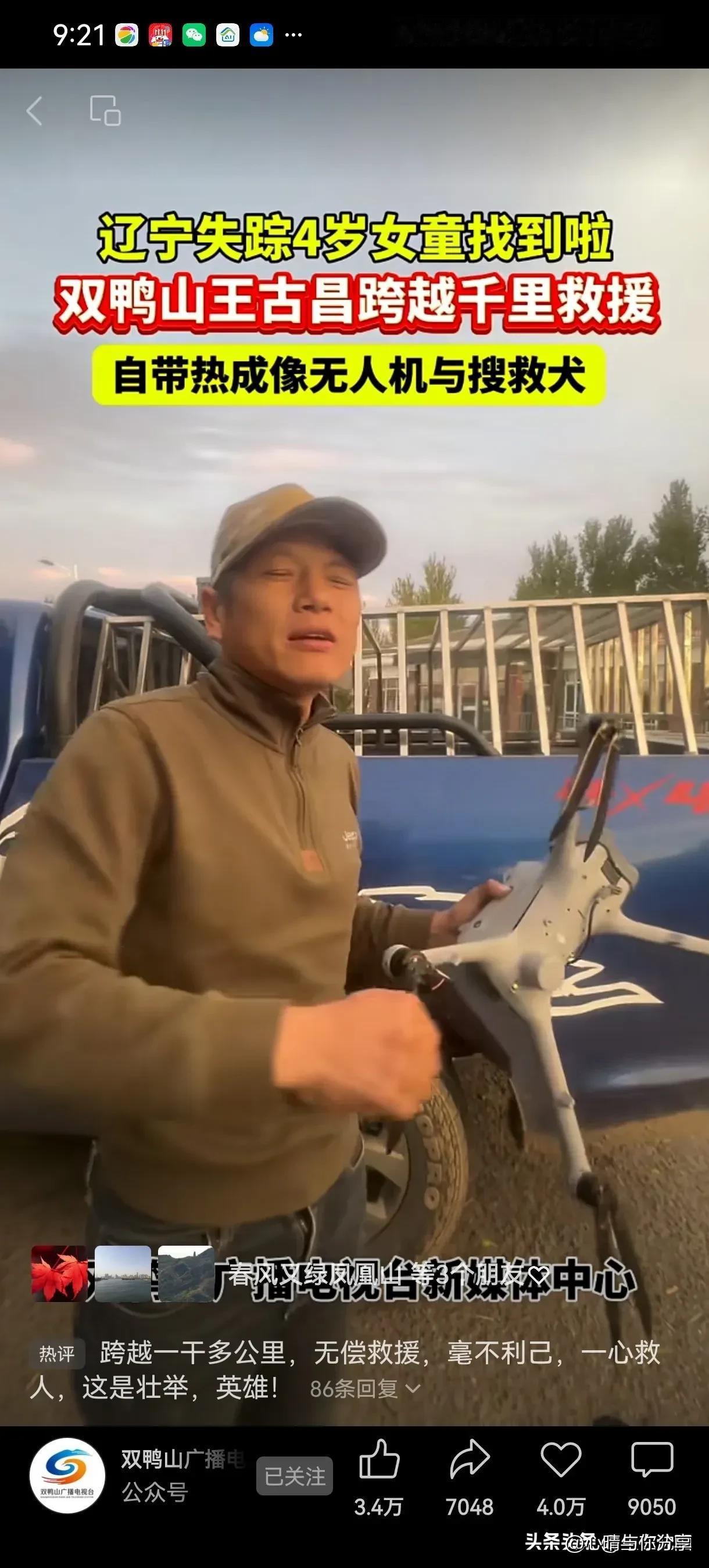 现在全网最值得被感谢的, 不是那位派出所所长,而是这位叫王骨昌的黑龙江双鸭山男人! 在得知四岁女童小丁一走失的信息后,他开车12小时,跨越1400公里从双鸭山赶到辽宁朝阳,自带3架热成像无人机和搜救犬投入到搜救工作中。最终飞了4块电池后,于一处山沟精准定位到了失踪的女童丁一。 距离小丁一走失,已经过去了四十个小时,如果再没有找到,估计小丁一将面临生命危险!因为这两天开始辽宁那边晚上的气温已经很低了,在没吃没喝的前提下,小丁一是很容易失温的! 万幸,这位热心的平民英雄,跨越千里,自带高科技设备和搜救犬,只为贡献自己的一份力量!最终,努力没有白费,成功找到四岁走失的小丁一! 东北人都是“活雷锋”这话一点都不假! 大家觉得呢?
