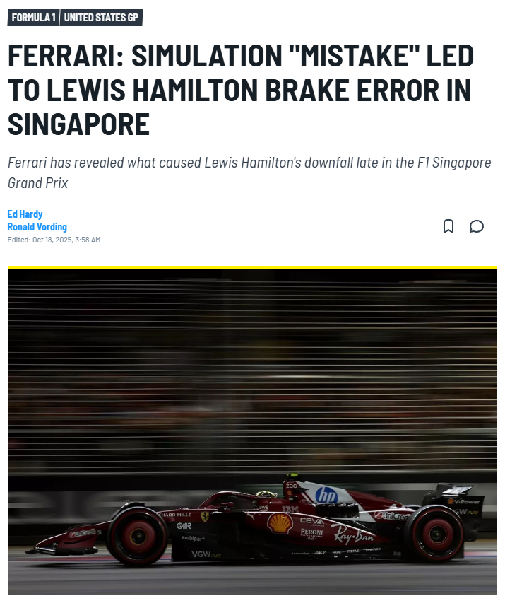 法拉利车队承认,由于模拟数据存在失误,导致了汉密尔顿在F1新加坡大奖赛尾声遭遇刹车耗尽问题。