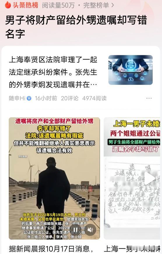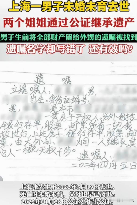 上海,张先生一生未婚无子,离世后留下的房产股票等财产,张先生的大姐和二姐先公证了部分财产,二姐的儿子李炯整理遗物时发现遗嘱,财产归大外孙李烔(实为李炯,因字写错了)继承,大姨对这份遗嘱不认可,认为错别字多,落款日期也有问题,李炯有60天内接受遗赠记录。审理认定遗嘱有效,判决李炯继承,张大姐上诉被驳回。 本内容信息来源于:、闽南网、深圳新闻网 据悉,张先生一辈子没结婚,也没孩子,父母走得早,就剩他孤零零一个人。 2022年5月19号那天,张先生突然走了,没留下啥话,就剩下一套房子,还有股票、银行存单啥的,加一起值不少钱呢。 他大姐和二姐赶紧凑一块商量,这遗产咋分啊?俩人一合计,先去做了个公证,把部分财产给分了,想着这事就算完了。 可谁知道,这事远没完呢。 2023年3月11号那天,二姐的儿子李炯,在整理张先生遗物的时候,翻出个遗嘱来。 遗嘱上写着,所有财产都归大外孙李烔继承。李炯一看,这李烔不就是自己嘛,名字写错了而已。 他赶紧通过文字聊天跟母亲说了这事,母亲又跟大姐说了。大姐一听,心里头不平衡,凭啥?我们辛辛苦苦分的财产,你一份遗嘱就给搅和了? 大姐仔细看了看遗嘱,说这遗嘱有问题,错别字太多,外甥写成外孙,李炯写成李烔,落款日期也不对。还说李炯没在60天内表示接受遗产,这遗嘱不能算数。 李炯一听急了,赶紧翻出聊天记录,证明自己在60天内就接受了遗赠。俩人就这么杠上了,谁也不让谁。 这事越闹越大,最后闹上了法庭。 大姐那是一肚子委屈,说这遗嘱肯定是假的,要不咋这么多错别字呢?还有那落款日期,明显有问题嘛。 李炯也是一肚子苦水,说这遗嘱肯定是张先生写的,虽然名字写错了,但肯定是他老人家的意思。 他还说,张先生一辈子没外孙,就自己这么一个外甥,这遗嘱里的大外孙李烔,肯定就是自己。 这事,说白了就是一份错别字连篇的遗嘱,把一家人搅和得鸡飞狗跳。那么,以法律的角度该怎么看这事呢? 1,大姐说遗嘱错别字太多,外甥写成外孙,李炯写成李烔,落款日期也不对,这遗嘱能算数吗? 据《民法典》第1134条写得很清楚,自书遗嘱只要写明日期,签名,内容清楚就行。 张先生文化不高,把外甥写成外孙,李炯写成李烔,这算啥大事? 审理发现,张先生确实没外孙,遗嘱里的大外孙李烔,除了李炯还能有谁? 这就好比你爸写你名字写错了,但家里就你一个孩子,那肯定是你哈。 2,大姐说李炯没在60天内表示接受,这遗嘱不能算数。 民法典第一千一百二十四条规定,受遗赠人得在知道受遗赠后60天内,明确表示接受。 李炯当天就通过文字聊天跟母亲说了,母亲又跟大姐说了,这聊天记录就是证据。 应该认定李炯在法定期限内接受了遗赠,这是没毛病的。 3,那这份遗嘱到底有没有法律效力? 《民法典》第1143条规定,遗嘱人得有完全民事行为能力,意思得真实,内容不能违法。 张先生立遗嘱时脑子清楚,没人逼他,内容也没违法,虽然名字写错了,但不影响整体意思。 认定遗嘱有效,这合情合理。 审理时,也是仔细琢磨了这事,考虑到张先生受教育程度不高,沪语和普通话发音又有差异,写错个名字啥的,也在情理之中。 再说,张先生确实没有外孙,这遗嘱里的大外孙李烔,除了李炯,还能有谁? 最终,法 院 认为:这遗嘱应该是真的,判决李炯继承遗嘱里说的那些遗产。 大姐一听判决结果,是死活不服,大姐觉得遗嘱是假的,错别字多,日期有问题,就上诉了。 可二审,还是维持了原判,说这遗嘱有效,李炯就是合法继承人。 张先生一辈子没结婚没孩子,父母早逝,就剩俩姐姐和外甥,他立遗嘱把财产给外甥,也是人之常情。 大姐虽然不服,但法律讲究证据和事实,不是谁闹得凶就听谁的。 亲情和利益,有时候就是难两全,大姐和李炯,本来都是一家人,就为了这点财产,闹得这么不可开交呢? 大姐和李炯为了财产闹上法庭,值得吗?钱没了能再赚,亲情断了可就难补了。 有时候,人就是这么奇怪,为了点利益,啥都能干出来。 可话说回来,这亲情,才是最宝贵的。 别为了点财产,就把亲情给丢了,那可就得不偿失了。 写遗嘱的时候,可得仔细点,别写错了名字啥的,到时候引起不必要的麻烦。 你对这事有啥看法呢?