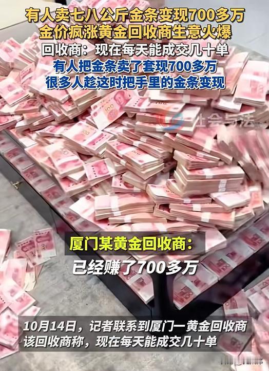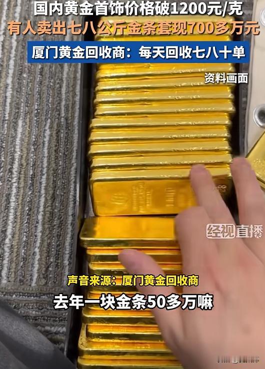 净赚300多万!10月14日报道,福建厦门,一男子看到金价疯涨,一狠心,竟然将手里的七八公斤金条全部卖了,直接套现700多万,这些金条都是他去年3月买的,去年金条50多万,今年已经100多万了。仅仅1年时间,直接财富翻倍!黄金回收商称:金价疯涨,今年生意火爆,每天能成交几十单! 10月14日海报新闻报道,厦门一位投资者的操作让不少人看得眼红心跳,去年3月份,这位男子豪掷400多万买下七八公斤金条,当时金价每克530元左右,今年金价飙升到900多元每克,他果断出手,700多万落袋为安,净赚300多万。 男子的这波操作确实够狠,要知道去年3月份,国际局势本就不太平,金价已经处于相对高位,很多人都在观望,但这位投资者却逆势而上,一口气砸下重金,现在看来他的判断相当精准。 最近黄金回收市场忙得不可开交,厦门一家黄金回收店的老板透露,以前一天能有三五单就不错了,现在每天几十单是常态。来卖金的客户络绎不绝,有的是去年低价囤的金条,有的是前几年买的金饰,都想趁着高价变现。 昨天有个阿姨,拿着十几年前的金项链来卖,当时买的时候200多一克,现在900多每克,她高兴得合不拢嘴。 金价这一年的走势确实让人意外,2024年初金价还在每克500元左右徘徊,到了年底已经突破700元,进入2025年,更是一路高歌猛进,最高时甚至触及1000多元大关。 背后的原因并不简单,美联储的货币政策、中东地区的紧张局势、全球经济的不确定性,这些因素交织在一起,推动着金价节节攀升,特别是今年以来各国央行纷纷增持黄金储备,更是给金价添了一把火。 不过金价涨得快风险也不小,上海一位资深黄金分析师指出,目前金价已经处于历史高位,继续上涨的空间有限,黄金毕竟不产生利息,纯粹靠价差赚钱,一旦市场风向变了下跌起来也很快。 普通投资者该怎么看待黄金投资,专业人士建议,黄金可以作为资产配置的一部分,但比例不宜过高,一般建议占总资产的10%到20%,这样既能起到避险作用,又不会因为价格波动影响生活。 更重要的是投资要量力而行,那位厦门男子能拿出400万买金条,说明他本身就有相当的经济实力,普通工薪阶层如果盲目跟风,很可能成为高位接盘侠。 有个细节值得注意,这位投资者选择的是金条而不是金饰,金条的投资属性更纯粹,买卖价差小变现也方便,而金饰除了金价,还包含了工艺费、品牌溢价等,投资价值相对较低。 当然如果是自用或送礼,金饰还是不错的选择,毕竟黄金保值,又有纪念意义,只是别把它当成纯粹的投资品就好。 市场永远充满变数,就在大家都觉得金价会一直涨的时候,最近已经出现了小幅回调,有些着急变现的投资者,反而没能卖在最高点。 投资这件事时机很重要,但更重要的是理性,看到别人赚钱眼红很正常,但要清楚自己的风险承受能力,那位厦门男子的成功,除了眼光,更多的是实力和胆识,普通人与其羡慕,不如踏踏实实做好自己的理财规划。 麻烦看官老爷们右上角点击一下“关注”,既方便您进行讨论和分享,又能给您带来不一样的参与感,感谢您的支持!