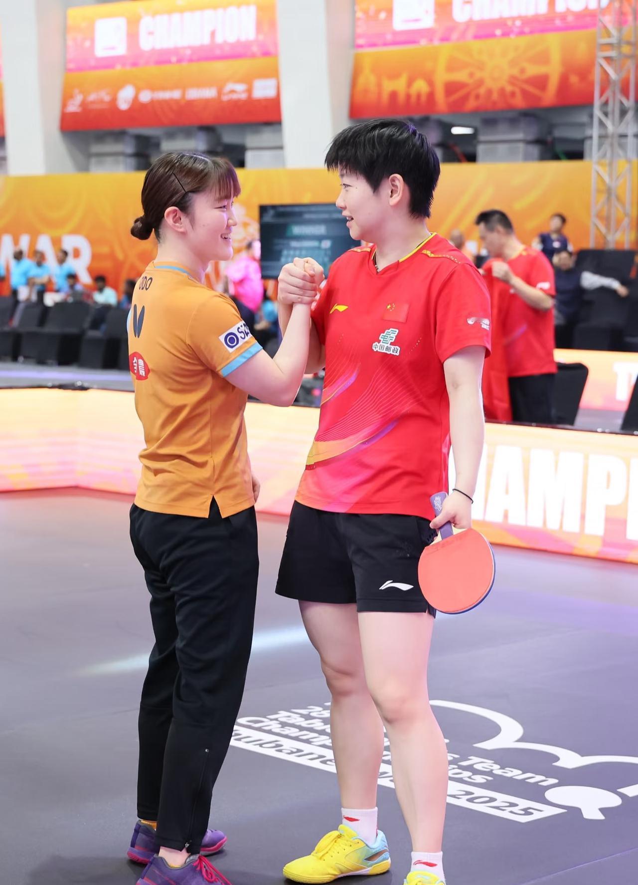 亚锦赛女团决赛刚落幕,孙颖莎和大藤沙月互换花束的画面,成了赛场外最暖的注脚。国