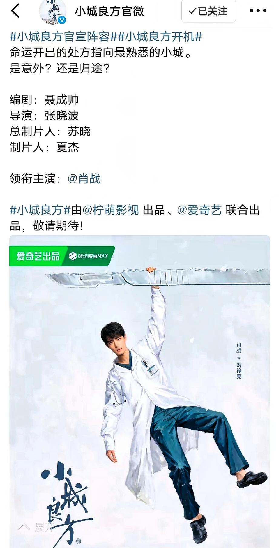 恭喜肖战!新剧《小城良方》正式官宣,这次他饰演的刘峥亮,海报设计真的绝了——一把手术刀上,他站在刀锋摇摇欲坠,这不仅是角色处境的隐喻,更是当下医生群体的真实写照。 我喜欢这种不靠噱头、用创意说话的官宣方式。它不仅展现了剧集的深度,也让观众提前感受到故事的张力。肖战这次又是单独官宣,大男主排面拉满,但我更在意的是,他是否能通过这个角色,打破大家对他的固有印象。 演员的价值,不在于频繁出镜,而在于每次出现都能带来新鲜感。我期待看到他在医疗题材中的突破,也希望这部剧能让更多人关注医生群体的不易。 你觉得,这个海报设计背后还隐藏着哪些深意?