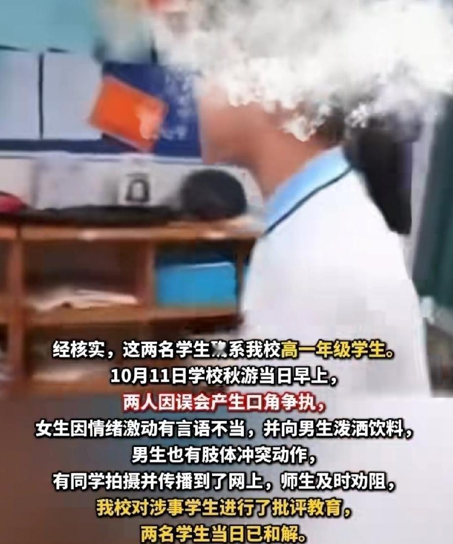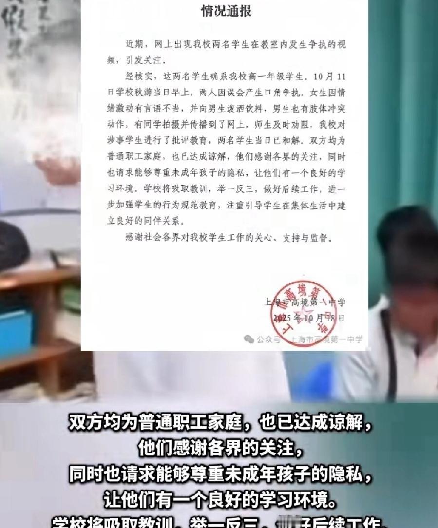 近日,上海一中学准备去秋游,当日早上高一班的一名女生和一名男生在教室里发生争吵。女生表现很强势,情绪激动。高声喊叫:“你知道我爸是干什么的吗”,“你有资格和我说话吗”。说完向坐在椅子上的男生身上泼洒两瓶饮料。 男生跳起来,对女生采取肢体冲突动作。现场的师生及时劝阻。 有同学拍摄吵架并传到网上,引起了社会关注。 10月18日校方发布情况通报,指出两名学生因误会产生口角争执,家庭均为普通职工,当日已经达成和解。 被误会,这种痛苦的感受确实难以言表。女生像是被误会了,让它失去理智,试图高调压制对方,结果适得其反。 越是被误会,越要保持冷静,应当寻找适当机会消除误会。 上海一中学通报两名学生在教室争执误会