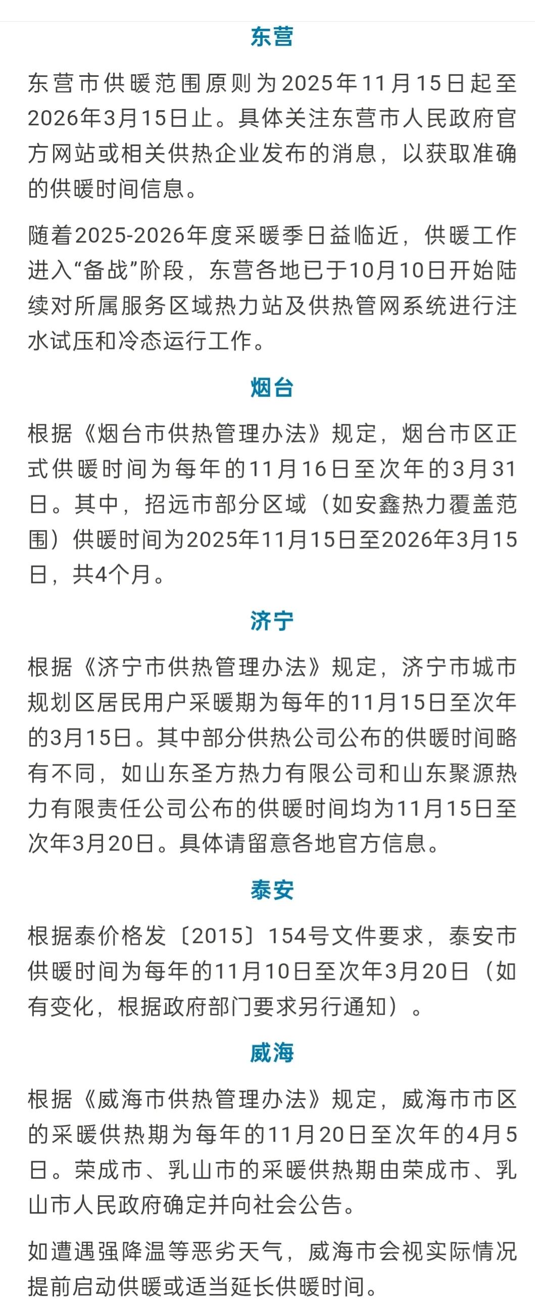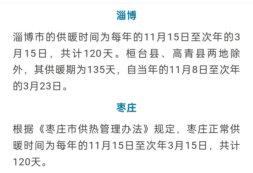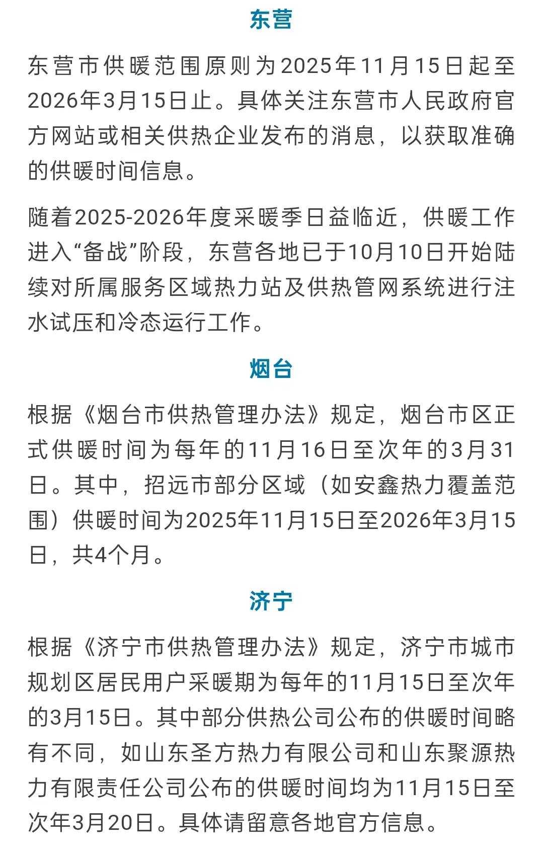 山东省16市2025~2026年度供暖时间