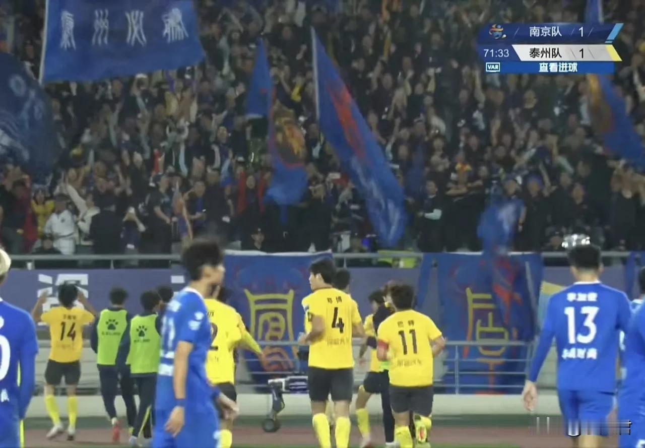泰州果然扳平了比分,南京危矣。下半场在落后一球的情况下,泰州队加快了自己的节奏,不断的冲击南京队的球门。终于,泰州队凭借角球,扳平了比分。 而且从气势上看,泰州已经起势了。再随着体能的消耗,更年轻的泰州优势明显。如果在南京队不自己犯错误的情况下,预计本场要踢到点球大战。