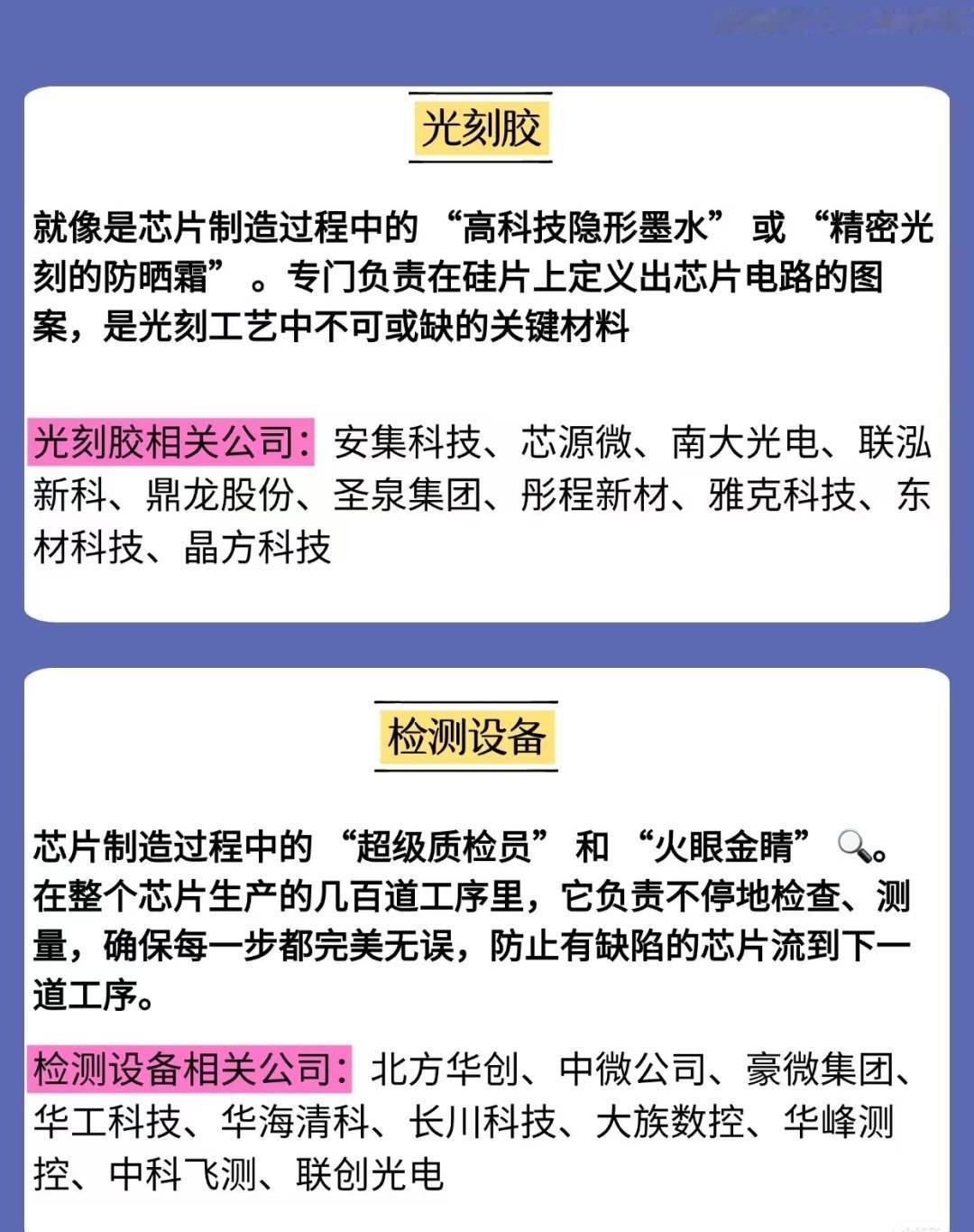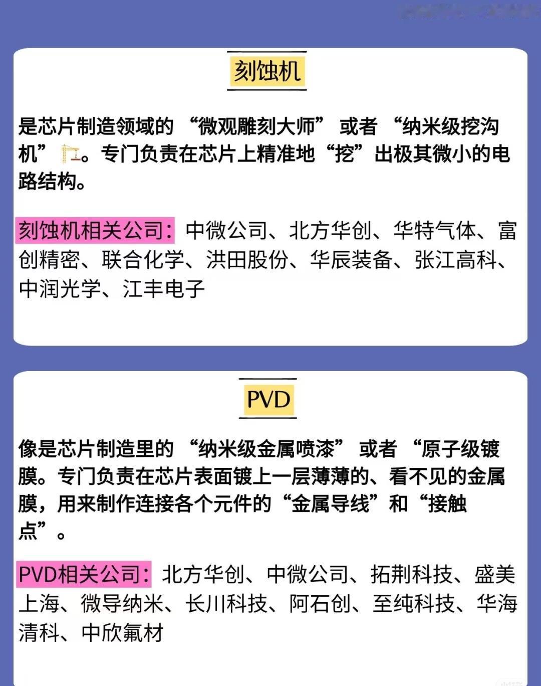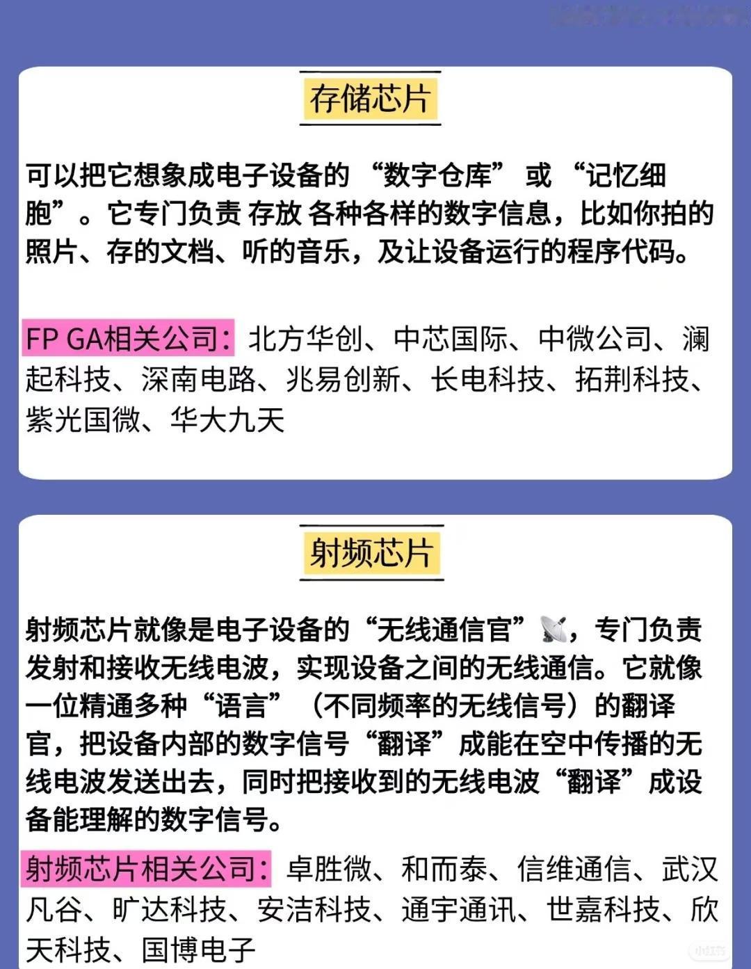 半导体产业的多个关键赛道和核心组件,共涵盖了14个领域,并列出了相关的主要企业。 1. CPU(中央处理器):被比喻为“数字加工厂”,是计算机的核心,负责按照“读取-解码-执行-写回”的流程处理指令,主要企业包括中芯国际、寒武纪、海光信息、龙芯中科等。 2. GPU(图形处理器):像是处理“画面”和“大规模简单计算”的超级帮手,与CPU分工协作,主要厂商有海光信息、景嘉微、芯原股份、龙芯中科等。 3. FPGA(现场可编程门阵列):被称为“电子乐高”,由基础逻辑单元构成,可根据需求编程配置成不同数字电路,相关公司包括聚辰股份、中科蓝讯、芯原股份等。 4. 摄像头芯片:是电子设备的“眼睛”和“视觉大脑”,负责成像与图像处理,主要企业有豪威集团、思特威、富瀚微、联创电子等。 5. 存储芯片:如同电子设备的“数字仓库”或“记忆细胞”,用于存储照片、文档、程序等数据,相关公司如兆易创新、澜起科技、长电科技、紫光国微等。 6. 射频芯片:是设备的“无线通信官”和“翻译官”,负责收发无线电波,实现无线通信,主要厂商包括卓胜微、和而泰、信维通信、通宇通讯等。 7. 数字芯片:被描述为“数字世界总指挥”,负责处理数字信号、逻辑运算和数据存储,相关企业有纳芯微、赛微微电、杰华特、圣邦股份等(但第4图中误将该描述用于模拟芯片)。 8. 模拟芯片:第4图中文字有误,重复了数字芯片的描述,实际应负责处理连续信号(如声音、光线等),但图中仍列出数字芯片相关公司。 9. 功率芯片:被比喻为“数字世界总指挥”(描述重复),实际上负责电能转换与控制,相关公司包括中芯国际、澜起科技、华虹公司等。 10. 封测(封装与测试):是芯片制造后期的“精致包装”和“严格质检”环节,确保芯片性能与可靠性,相关企业有长电科技、通富微电、华天科技、甬矽电子等。 11. 刻蚀机:是芯片制造中的“微观雕刻大师”,负责在芯片材料上精准刻画电路结构,相关公司包括中微公司、北方华创、华特气体、江丰电子等。 12. PVD(物理气相沉积):像是芯片制造的“纳米级金属喷漆”,用于在芯片表面镀金属膜,形成电路连接,相关企业有北方华创、拓荆科技、中微公司等。 13. 光刻胶:是光刻工艺中的“高科技隐形墨水”或“精密光刻的防晒霜”,用于定义芯片上的微细电路图案,相关公司包括安集科技、南大光电、雅克科技、晶方科技等。 14. 检测设备:被称为芯片生产中的“超级质检员”和“火眼金睛”,用于全程监控与检测芯片制造质量,相关企业有北方华创、中微公司、华峰测控、长川科技等。