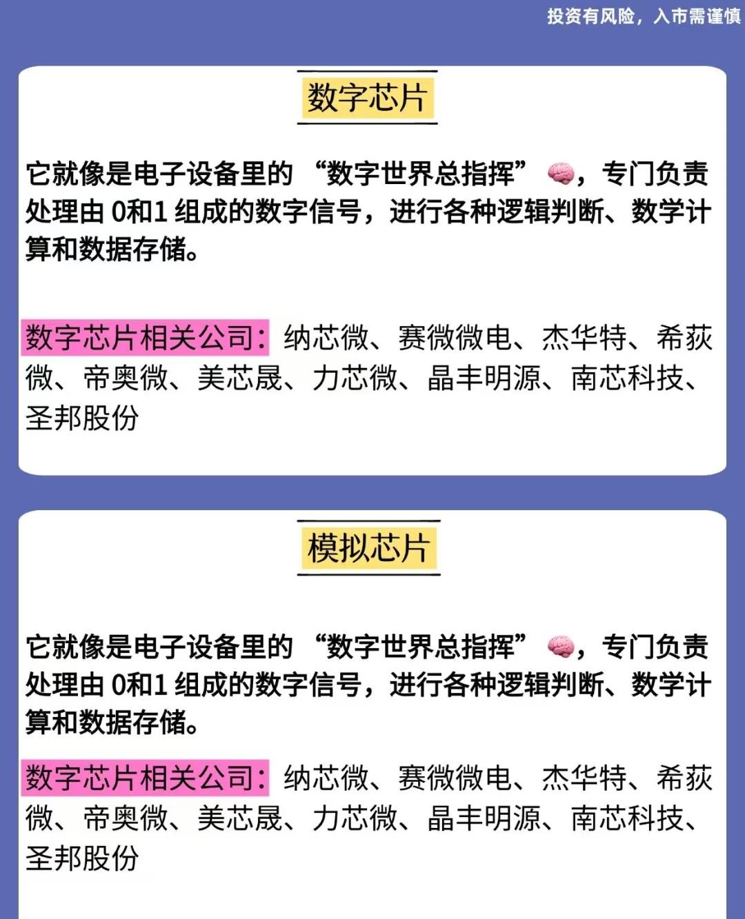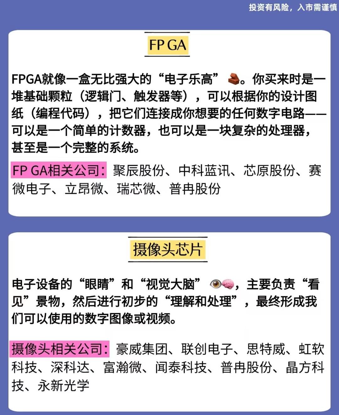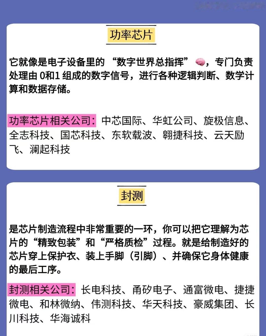半导体产业的多个关键赛道和核心组件,共涵盖了14个领域,并列出了相关的主要企业。 1. CPU(中央处理器):被比喻为“数字加工厂”,是计算机的核心,负责按照“读取-解码-执行-写回”的流程处理指令,主要企业包括中芯国际、寒武纪、海光信息、龙芯中科等。 2. GPU(图形处理器):像是处理“画面”和“大规模简单计算”的超级帮手,与CPU分工协作,主要厂商有海光信息、景嘉微、芯原股份、龙芯中科等。 3. FPGA(现场可编程门阵列):被称为“电子乐高”,由基础逻辑单元构成,可根据需求编程配置成不同数字电路,相关公司包括聚辰股份、中科蓝讯、芯原股份等。 4. 摄像头芯片:是电子设备的“眼睛”和“视觉大脑”,负责成像与图像处理,主要企业有豪威集团、思特威、富瀚微、联创电子等。 5. 存储芯片:如同电子设备的“数字仓库”或“记忆细胞”,用于存储照片、文档、程序等数据,相关公司如兆易创新、澜起科技、长电科技、紫光国微等。 6. 射频芯片:是设备的“无线通信官”和“翻译官”,负责收发无线电波,实现无线通信,主要厂商包括卓胜微、和而泰、信维通信、通宇通讯等。 7. 数字芯片:被描述为“数字世界总指挥”,负责处理数字信号、逻辑运算和数据存储,相关企业有纳芯微、赛微微电、杰华特、圣邦股份等(但第4图中误将该描述用于模拟芯片)。 8. 模拟芯片:第4图中文字有误,重复了数字芯片的描述,实际应负责处理连续信号(如声音、光线等),但图中仍列出数字芯片相关公司。 9. 功率芯片:被比喻为“数字世界总指挥”(描述重复),实际上负责电能转换与控制,相关公司包括中芯国际、澜起科技、华虹公司等。 10. 封测(封装与测试):是芯片制造后期的“精致包装”和“严格质检”环节,确保芯片性能与可靠性,相关企业有长电科技、通富微电、华天科技、甬矽电子等。 11. 刻蚀机:是芯片制造中的“微观雕刻大师”,负责在芯片材料上精准刻画电路结构,相关公司包括中微公司、北方华创、华特气体、江丰电子等。 12. PVD(物理气相沉积):像是芯片制造的“纳米级金属喷漆”,用于在芯片表面镀金属膜,形成电路连接,相关企业有北方华创、拓荆科技、中微公司等。 13. 光刻胶:是光刻工艺中的“高科技隐形墨水”或“精密光刻的防晒霜”,用于定义芯片上的微细电路图案,相关公司包括安集科技、南大光电、雅克科技、晶方科技等。 14. 检测设备:被称为芯片生产中的“超级质检员”和“火眼金睛”,用于全程监控与检测芯片制造质量,相关企业有北方华创、中微公司、华峰测控、长川科技等。