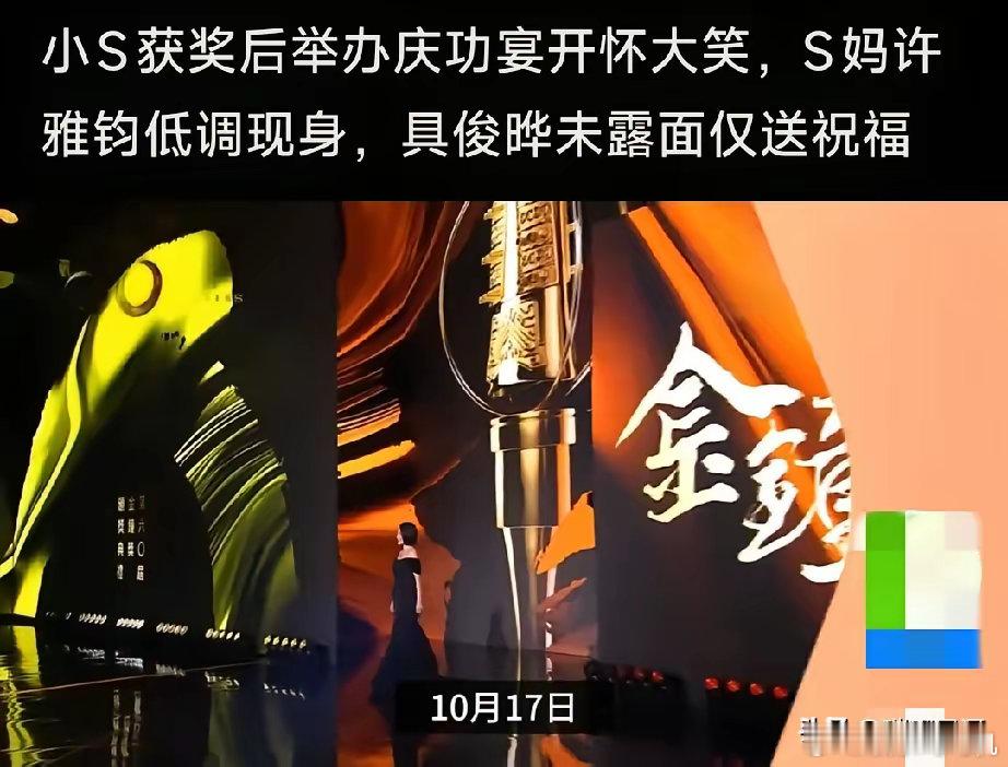 S妈称心里破的洞已经被小S的金钟奖补上。小S大摆庆功宴开怀大笑。S妈和许雅钧都现身庆祝。具俊晔第一时间发信息送上祝福。并称小S最美。在后台小S遇到陈汉典和LuLu夫妇,小S问LuLu“陈汉典的老 二 大不大”,再现综艺女王的风采。