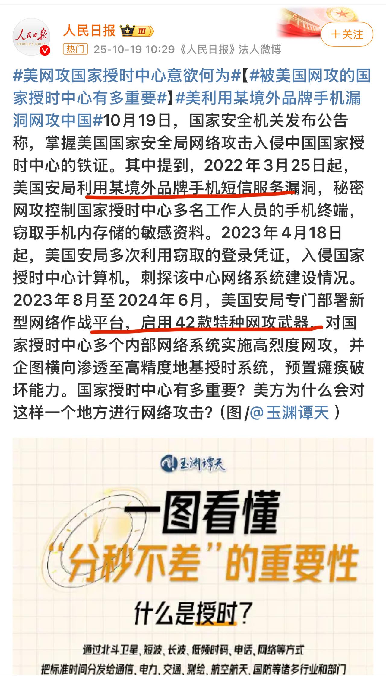 部署新型作战平台,激活42款特种武器,对我发起网攻! 根据多家媒体报道,2023年8月至2024年6月,美方专门部署新型网络作战平台,启用42款特种网攻武器,对授时中心多个内部网络系统,高烈度攻击! 这是19日刚刚爆出来的消息! 而之前,美方是怎么开始的?2022年起,首先利用外国某品牌手机的漏洞,直接窃取了工作人员的资料,然后使用这些登录凭证进入网络! 美方这次算不算玩了一波狠的?授时中心为关键领域提供的是纳秒级(10亿分之一秒)授时服务,有多金贵?若遭破坏,将导致电网瘫痪、金融交易混乱、航天发射失败等连锁灾难。 专家说,就算只差一毫秒,变电站就会时序混乱,大面积的停电。差一皮秒(10万亿分之一秒)可能造成“嫦娥”无法成功返回。 黎巴嫩寻呼机事件后,伊朗将军被精确定位后,网络上说手机也可以,所以,为什么要禁止某手机,某新能源汽车,进入的原因,很清楚了吧?你们就是不相信!