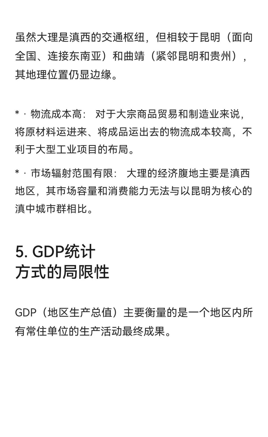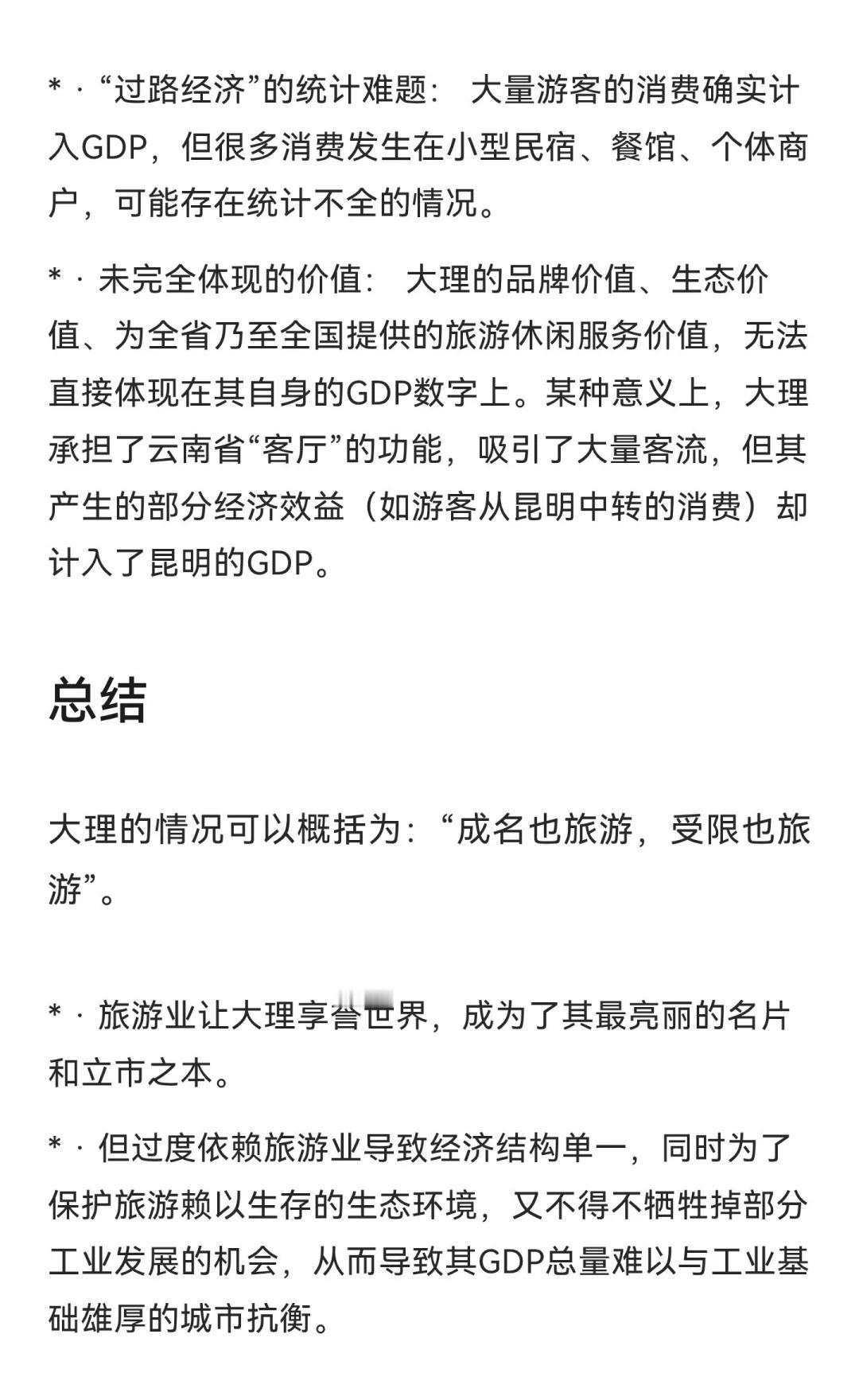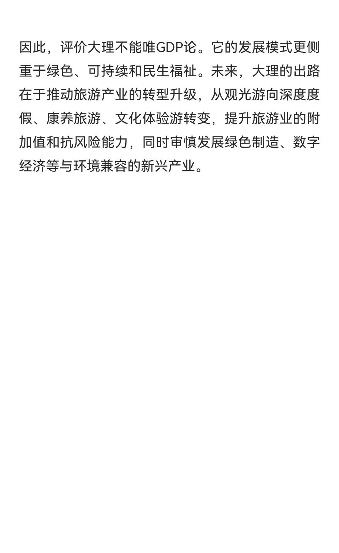 大理名声大旅游业发达,为什么GDP在省内排 大理虽以旅游业闻名,但GDP在云南省内排名靠后,主要因经济结构单一、工业基础薄弱及环保限制。旅游业虽带动就业,但抗风险能力弱,GDP附加值低。未来需推动旅游产业升级,发展绿色制造和数字经济,实现可持续发展。