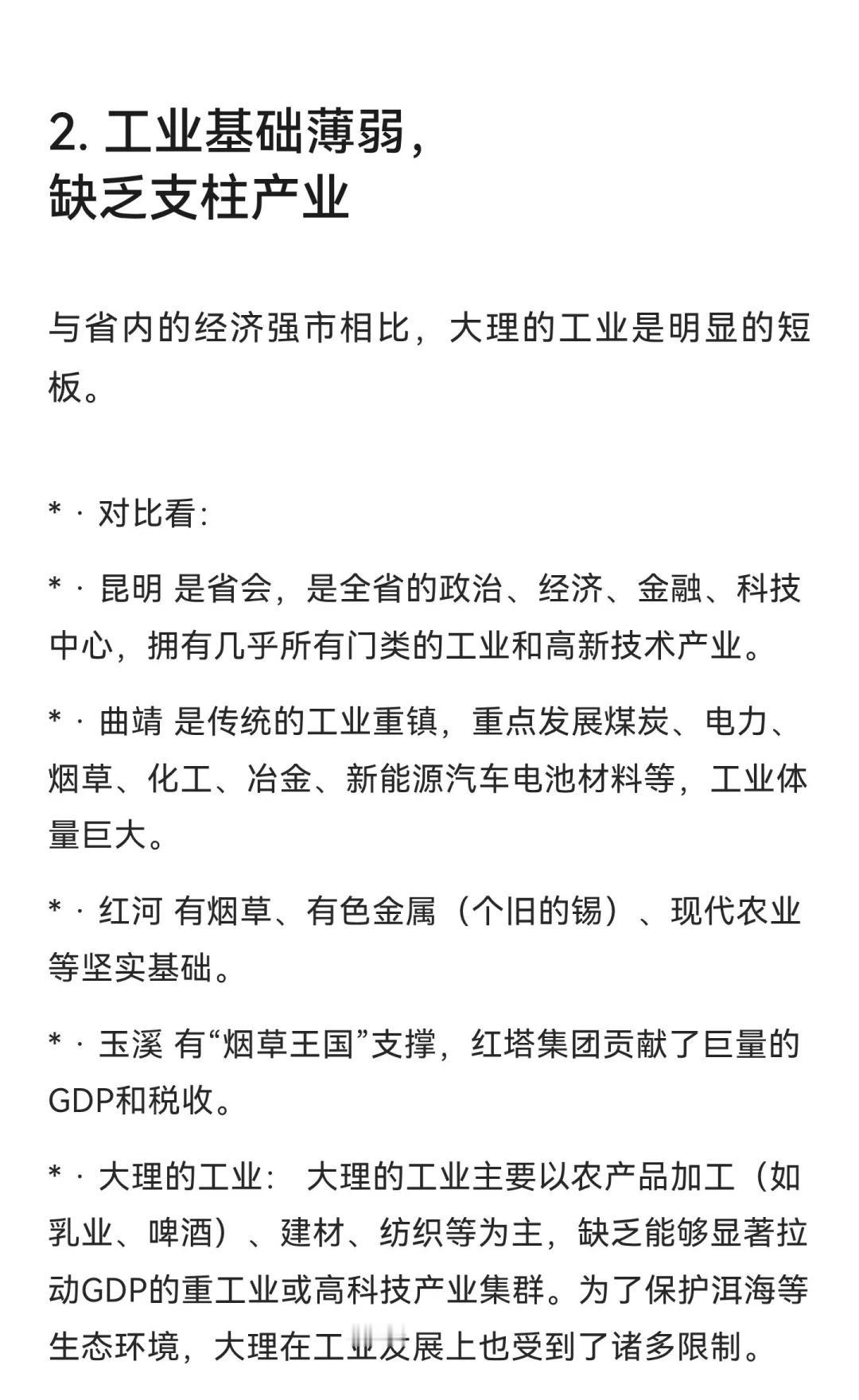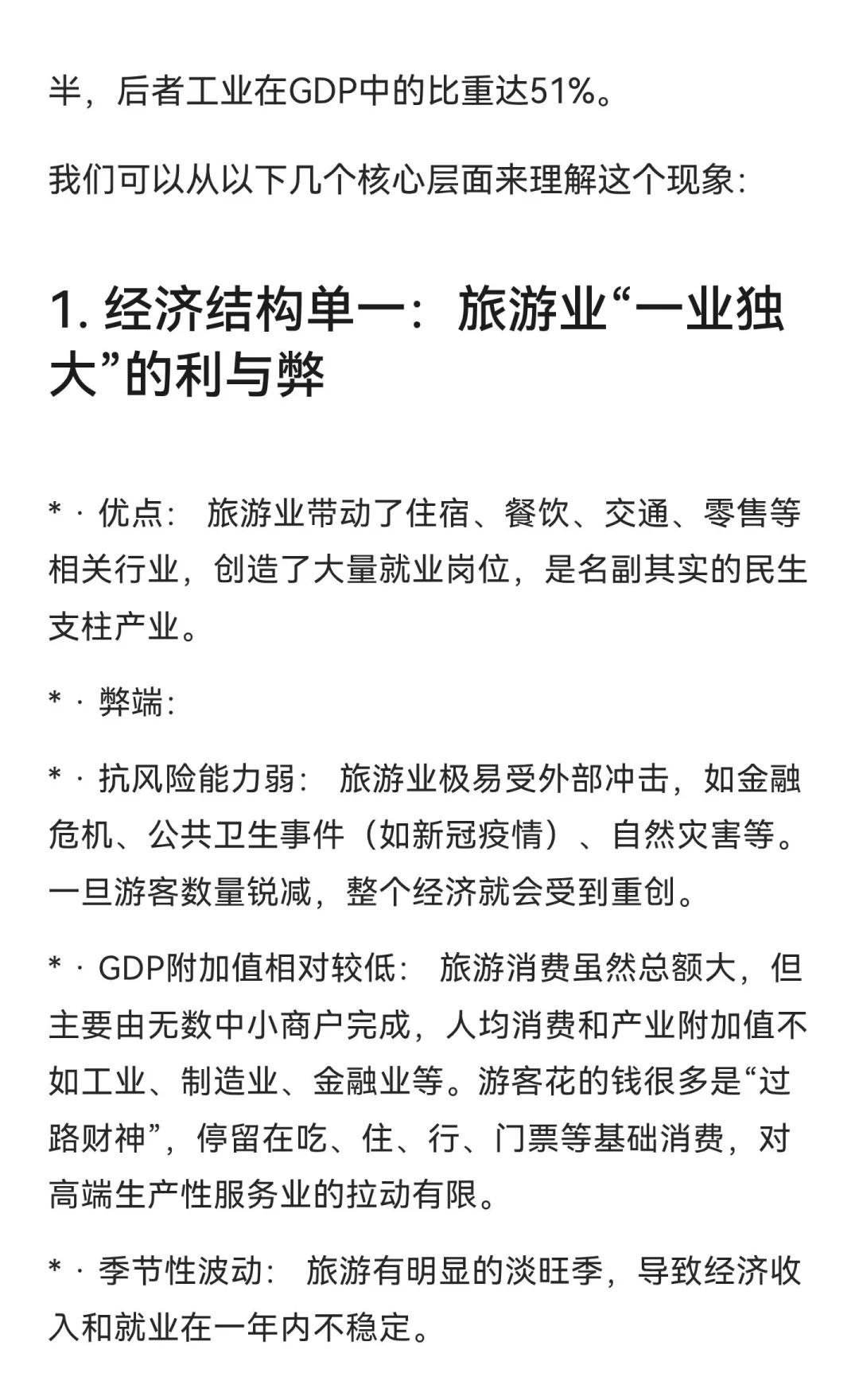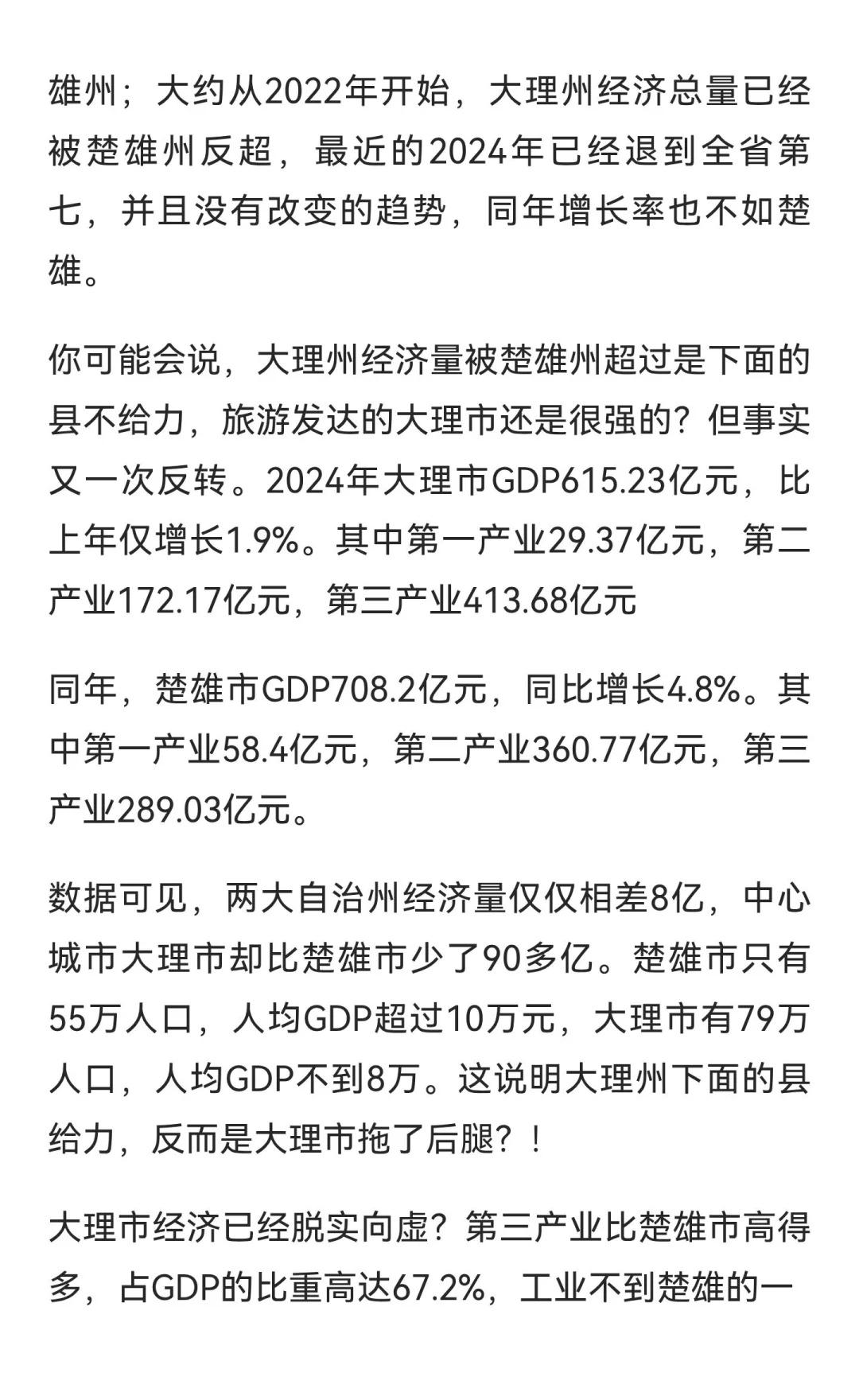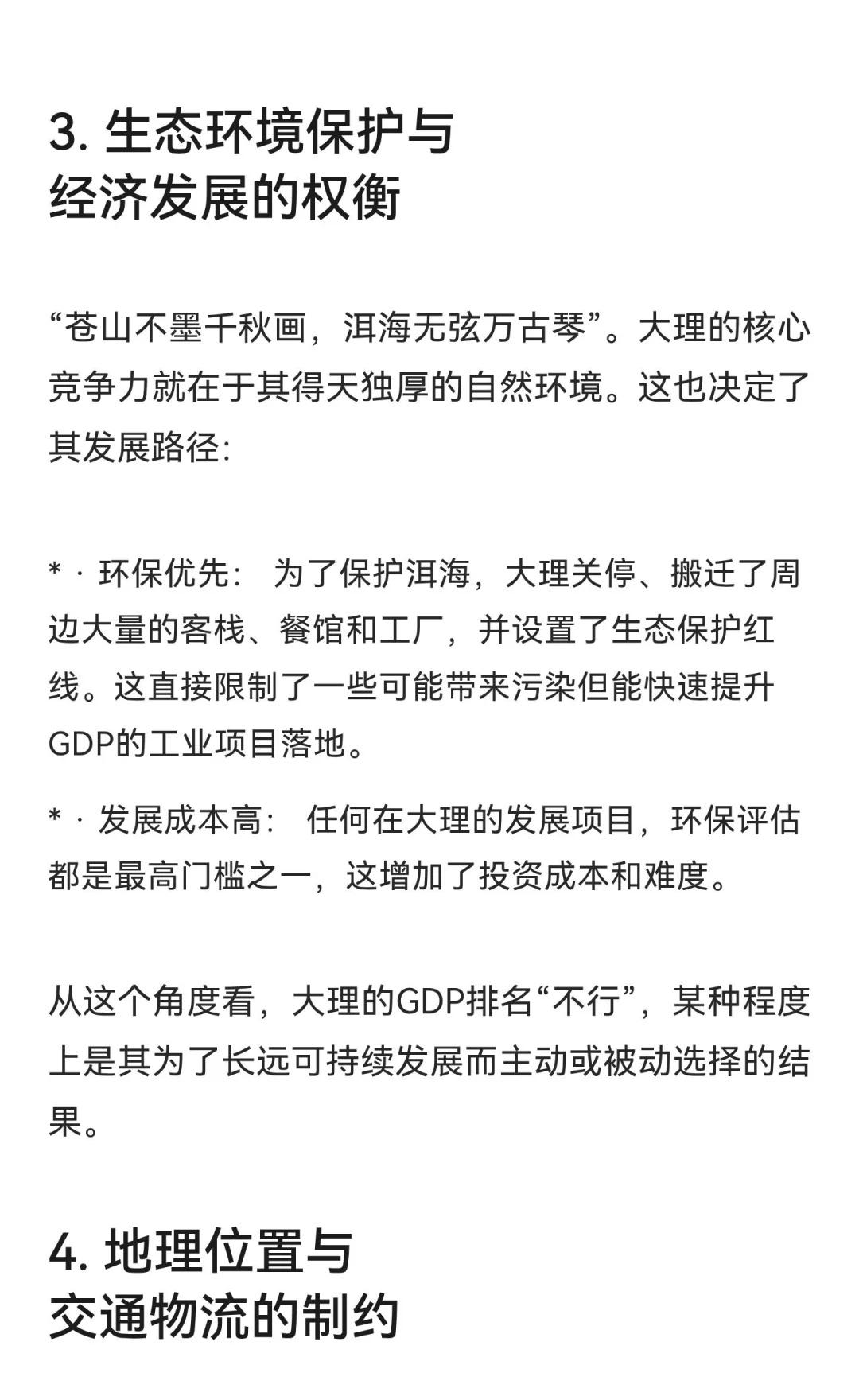 大理名声大旅游业发达,为什么GDP在省内排 大理虽以旅游业闻名,但GDP在云南省内排名靠后,主要因经济结构单一、工业基础薄弱及环保限制。旅游业虽带动就业,但抗风险能力弱,GDP附加值低。未来需推动旅游产业升级,发展绿色制造和数字经济,实现可持续发展。