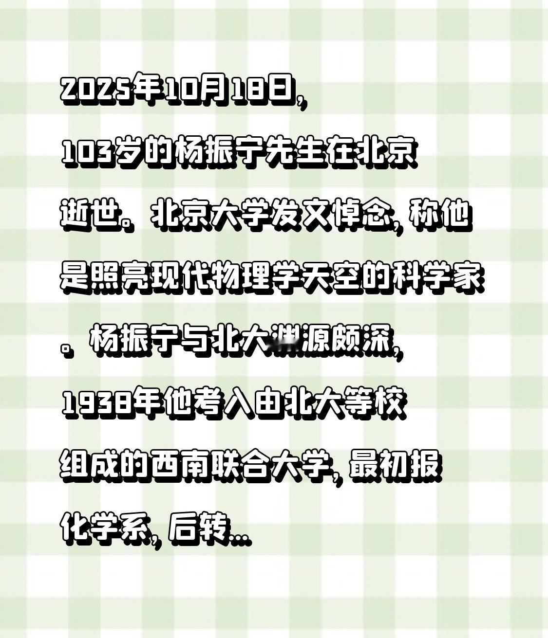 2025年10月18日,103岁的杨振宁先生在北京逝世。北京大学发文悼念,称他是照亮现代物理学天空的科学家。 杨振宁与北大渊源颇深,1938年他考入由北大等校组成的西南联合大学,最初报化学系,后转物理系。1984年底,他被授予北大名誉教授称号。 他是20世纪最伟大的物理学家之一,1957年35岁的他就与李政道同获诺贝尔奖。他为现代物理学发展和祖国科教事业贡献卓越。如今先生已逝,但他的贡献如同夜空中的星,永远闪耀。