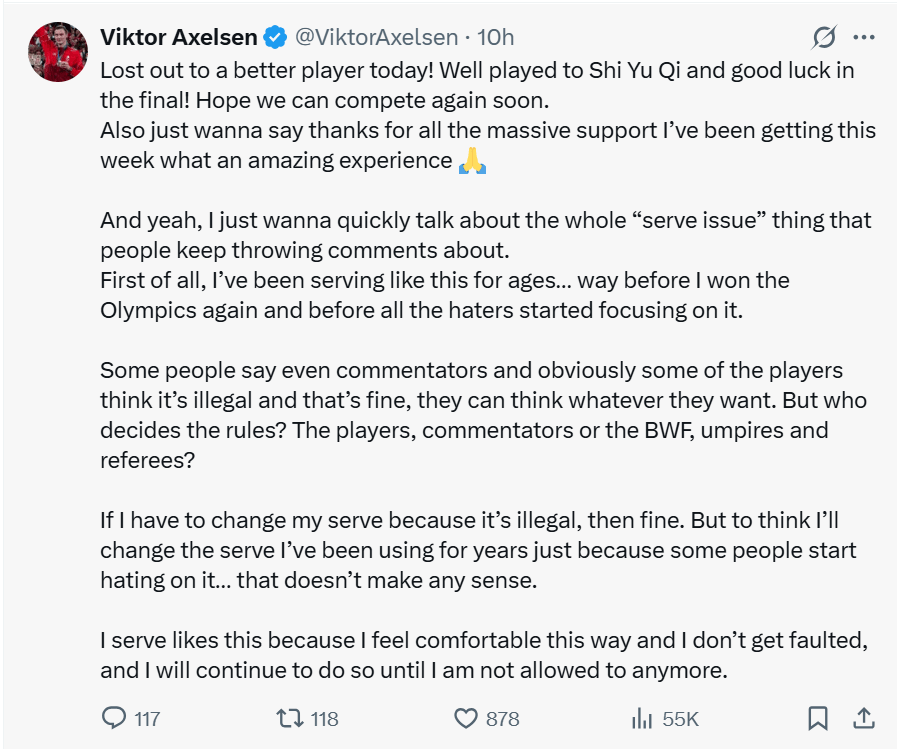 “甚至连解说员,显然还有一些选手,都认为我的发球违规。这没关系,他们怎么想都可以。但问题是,规则该由谁来定?是选手、解说员,还是世界羽联、裁判和司线员?”