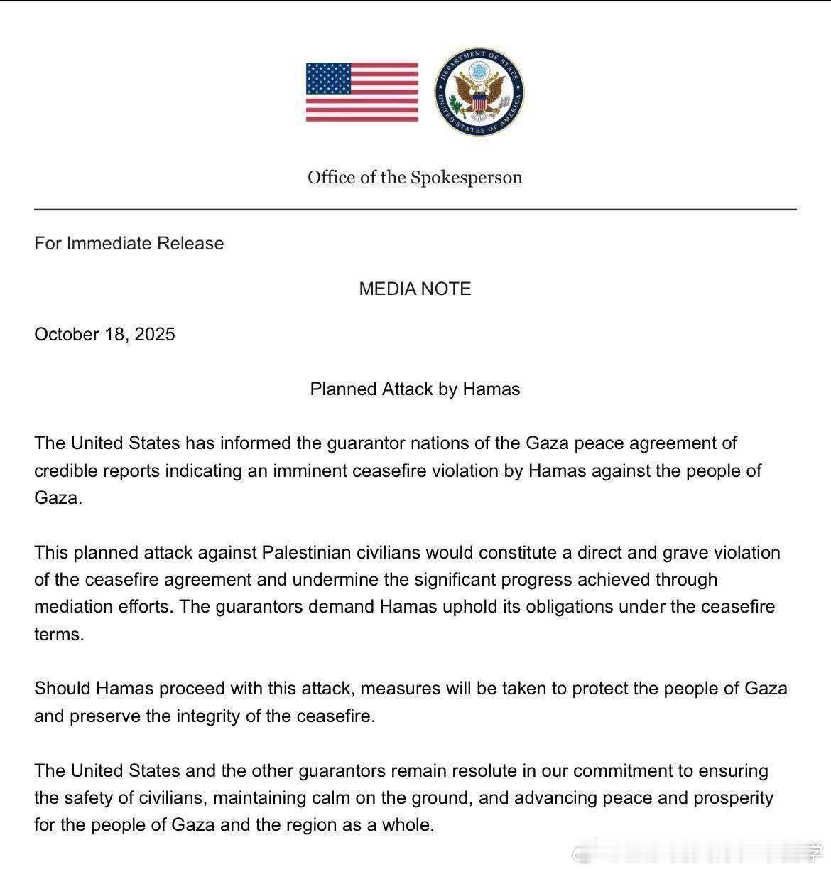 如果哈马斯采取这一行动,我们将采取措施保护加沙居民并维护停火。