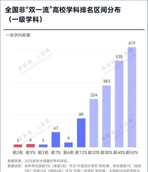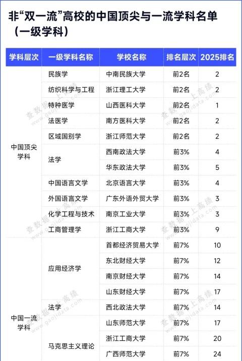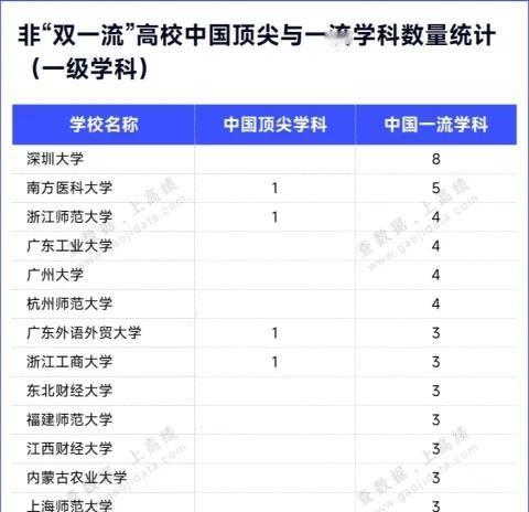 冲击下一轮“双一流”!这些高校,接近100%达标! 冲击下一轮“双一流”!这些高校,接近100%达标! 101所非“双一流”高校,拥有中国一流学科!非“双一流”高校中,一级学科排名层次达到中国顶尖学科水平的共有11所高校,达到中国一流学科水平的共有101所高校。 在一流学科方面,深圳大学数量最多,共计8个;南方医科大学紧随其后,共计5个;浙江师范大学、广东工业大学、广州大学和杭州师范大学,各拥有4个。 在顶尖学科方面,南方医科大学、浙江师范大学、广东外语外贸大学、浙江工商大学等11所高校,各拥有1个顶尖学科,展现了强劲的学科建设实力! 11所非“双一流”高校的一级学科,位列2025软科中国最好学科排名前3%或前2名,是非“双一流”高校当之无愧的“学科之王”。 山西医科大学的特种医学,凭借其扎实的学科实力稳居全国第1名;中南民族大学的民族学、浙江理工大学的纺织科学与工程、南方医科大学的法医学、浙江师范大学的区域国别学,位居全国第2名,展现了强大的学科竞争力。 西南政法大学和华东政法大学的法学,位列全国前3%,是非“双一流”高校法学学科建设的翘楚。北京语言大学的中国语言文学、广东外语外贸大学的外国语言文学,位列全国前3%,充分发挥文学学科优势。南京工业大学的化学工程与技术,浙江工商大学的工商管理学,同样位列顶尖学科之列。