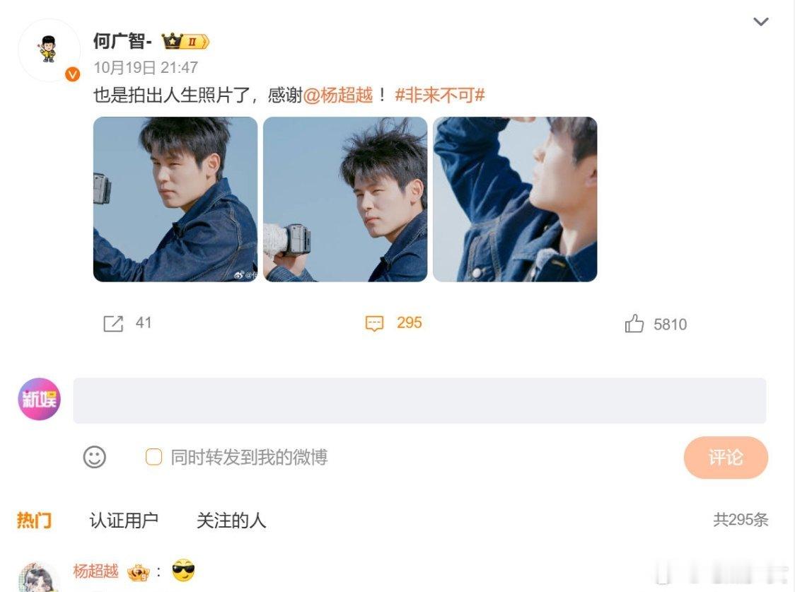 杨超越给何广智拍出人生照片何广智在微博晒出这组“人生照片”,并调侃感谢杨老师让他