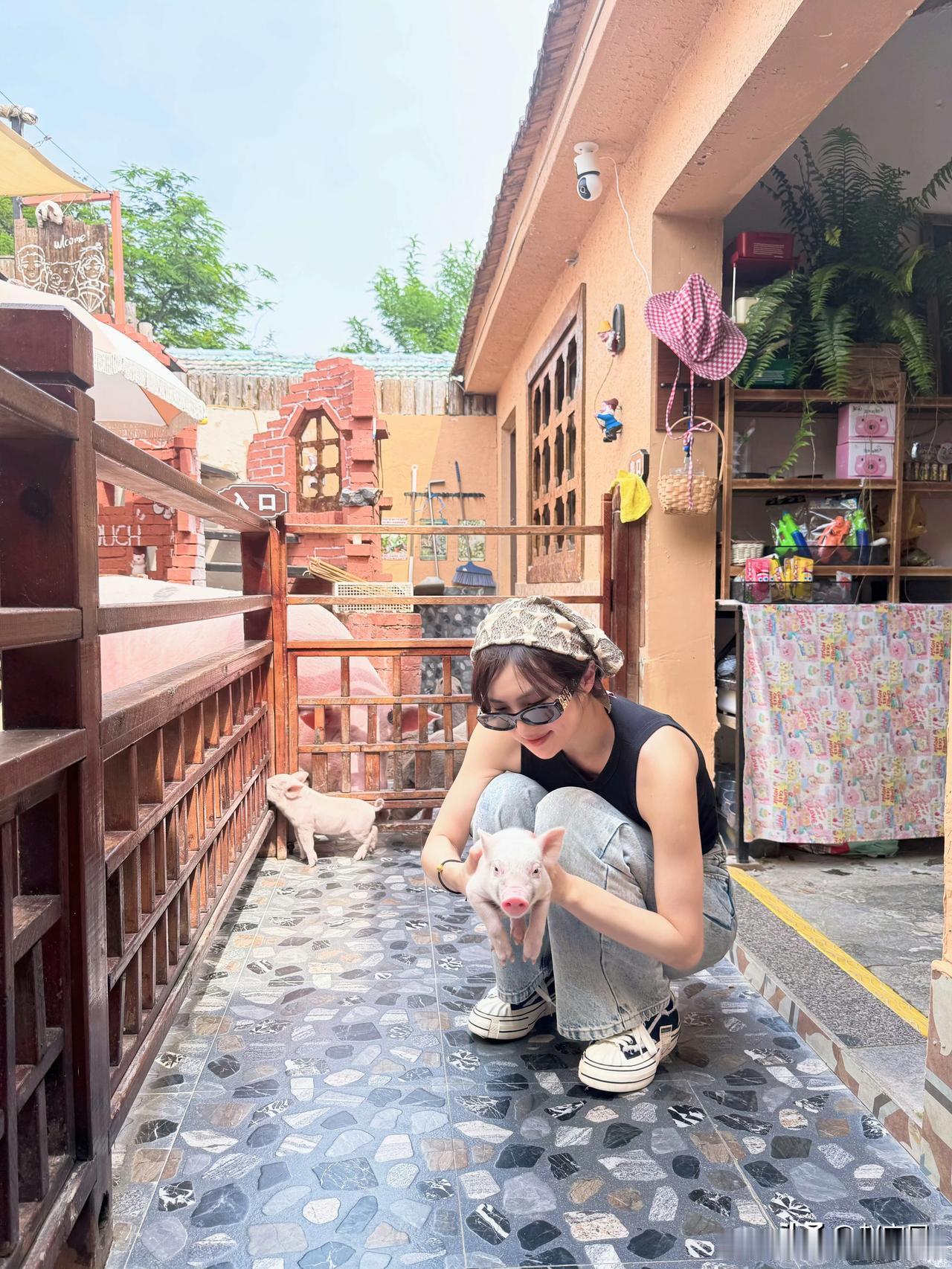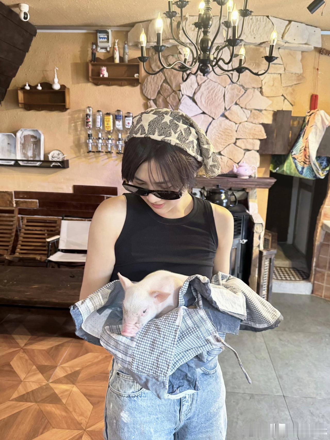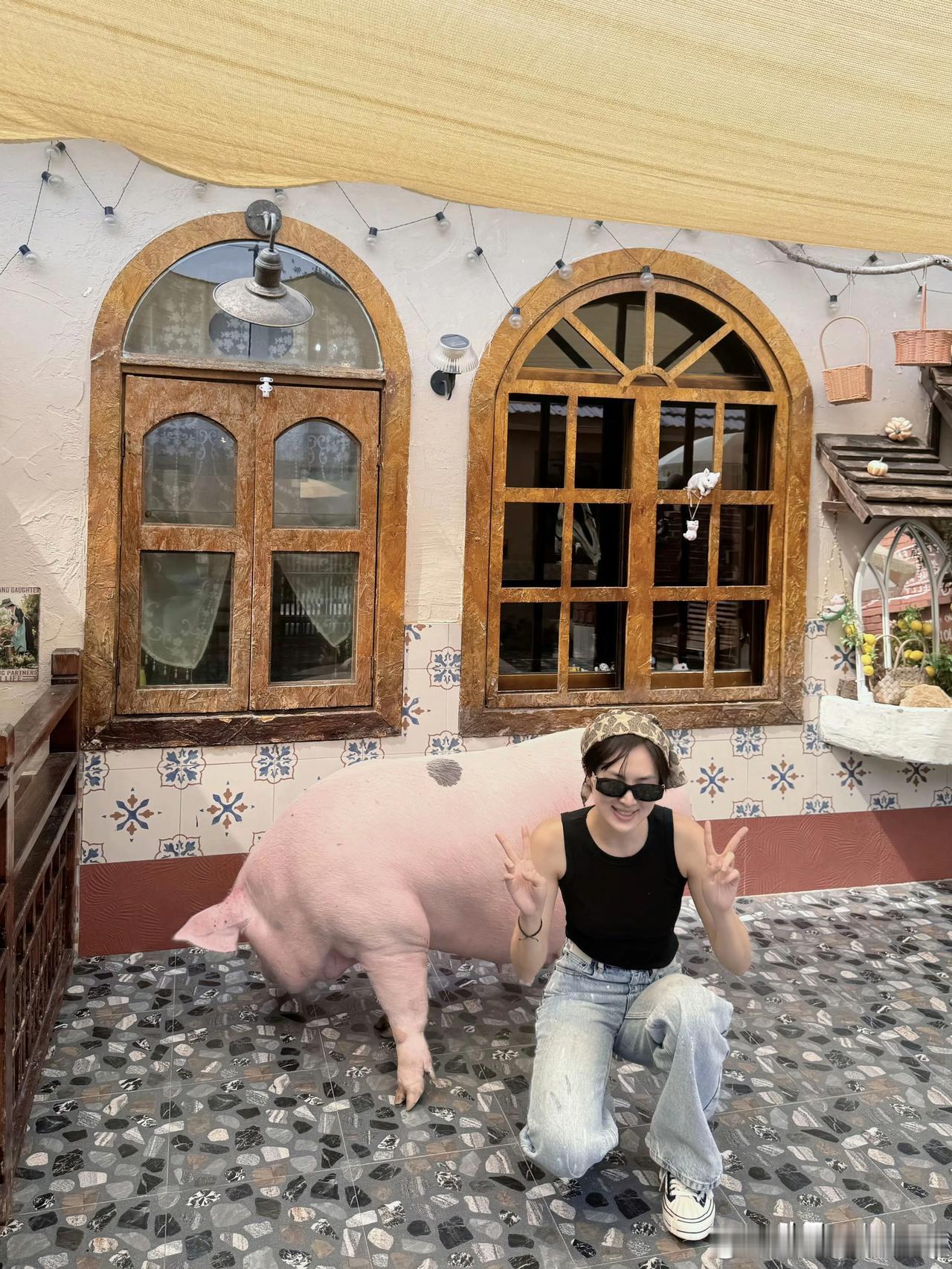 知名艺人姚安娜和宠物猪拍照合影。#姚安娜#
