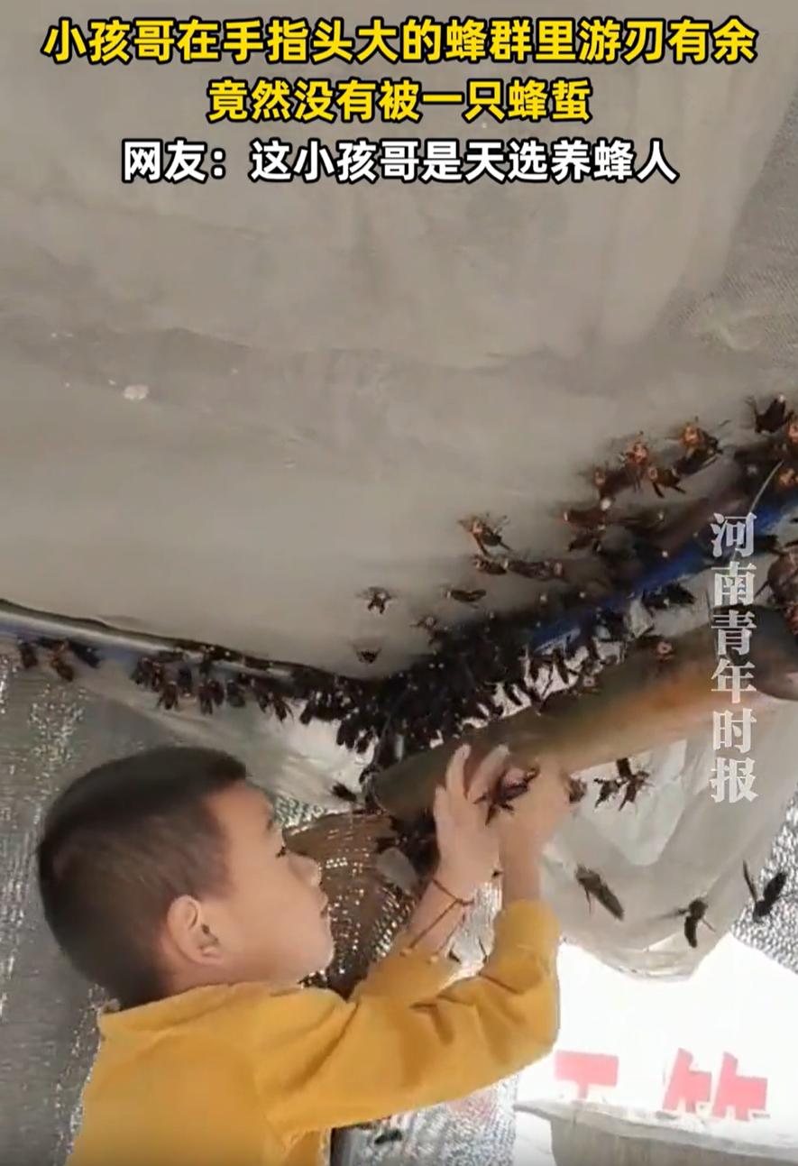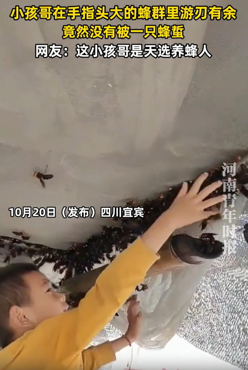 “这下解释不清了!”四川宜宾,一男子发视频,一位小孩哥在蜂群里面用手抓蜂,但让人意外的是,任凭他怎么抓,都没有一只蜂蛰他,网友:这绝对是天选养蜂人! 视频中,小孩年纪不大,顶多四五岁,却一点不怵那些嗡嗡乱飞的蜂,伸手抓、随手放,整个人淡定得像在玩沙子。更离谱的是,那些蜂居然一个都没蛰他,围着他转来转去,像是认主一样 对此,有网友第一反应是不敢相信,觉得这怎么可能:他为什么不怕蜂蛰他,它为什么又不蛰他,这是AI的吧 但也有网友表示:这蜂分公母,应该全都是雄蜂 仔细想想,这事儿也不完全没道理。蜂类其实很有规律,它们在不同阶段的性别和职责不一样。如果视频里那一窝主要是雄蜂,那确实不太会蛰人 雄蜂没有毒刺,主要任务是交配,平时脾气也温顺。而工蜂才是真正的“战斗蜂”,一旦觉得巢被威胁,才会集体出击。也就是说,这小孩可能正好遇上了一群没什么攻击性的蜂 而且在世代养蜂的人家。不少孩子从小跟着大人摆弄蜂箱,身上沾着蜂王浆的气息,蜜蜂早已把他们当作自家人。这孩子说不定就是这样的环境里长大的,蜜蜂熟悉他的气味,把他当成蜂巢的一部分