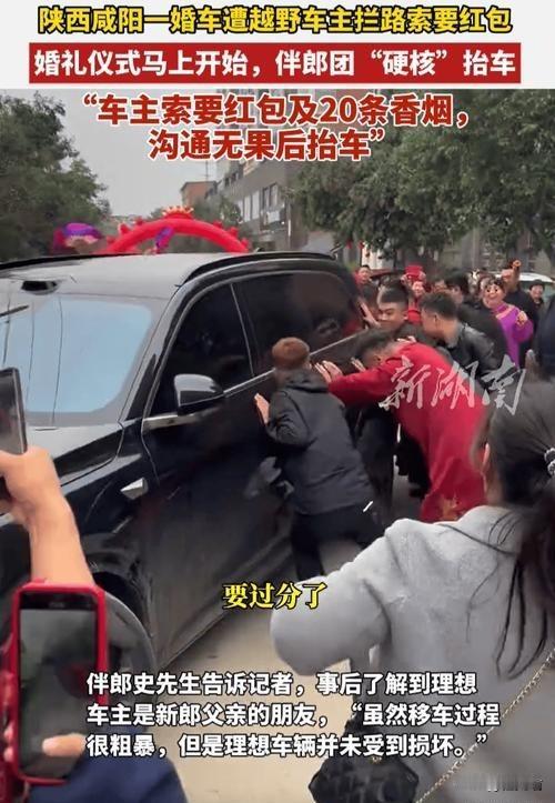 陕西,迎亲车队去新郎家的路上被一辆越野车拦住,车主开口就要红包,还要20条中华,不然就不让走。更离谱的是,拦路的车主还是熟人。 按市场价,20条硬中华差不多要9000块钱,相当于整场婚宴的喜烟预算了。新郎这边多次商量,想给点喜糖、小红包意思一下,但车主态度很强硬,说不满足要求就别想过去。 现场气氛越来越僵,新郎都差点想报警了。眼看婚礼吉时快到了,伴郎们急了,有人大喊:“兄弟们,下来抬车!” 十几名伴郎立刻冲上去,有的托底盘,有的扶车身,一起用力,很快就把越野车抬到了马路边上,婚车队伍才顺利通过。 后来大家才知道,这个拦路的车主,竟然是新郎父亲的朋友,本应该是来道贺的熟人,结果搞出这么一出,让人寒心,也觉得讽刺。 网友觉得觉得伴郎们干得漂亮,既没伤人,也没让婚礼耽误,还抵制了不良风气。拦婚车本来是图个热闹,现在却成了借机敲竹杠,这种变味的习俗该改改了。 也有人提醒,虽然支持抵制陋习,但抬车这种方式还是要注意安全。 婚礼的核心是真诚祝福,而非借机要钱。无论是熟人还是陌生人,都不该用拦车这种方式破坏别人的好日子。
