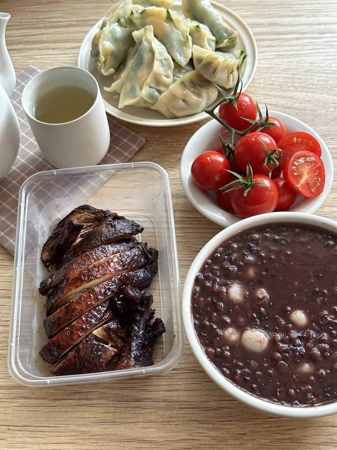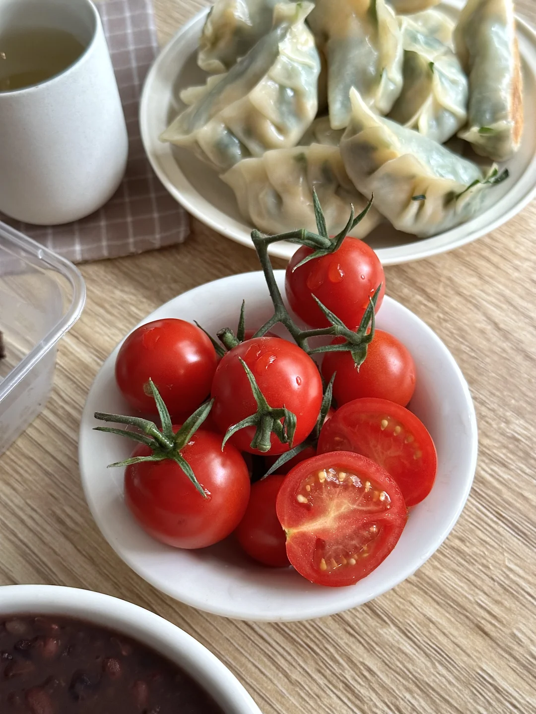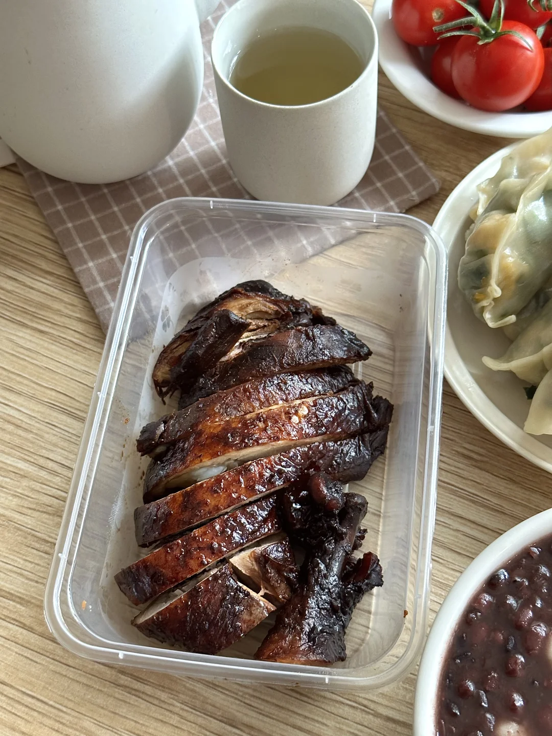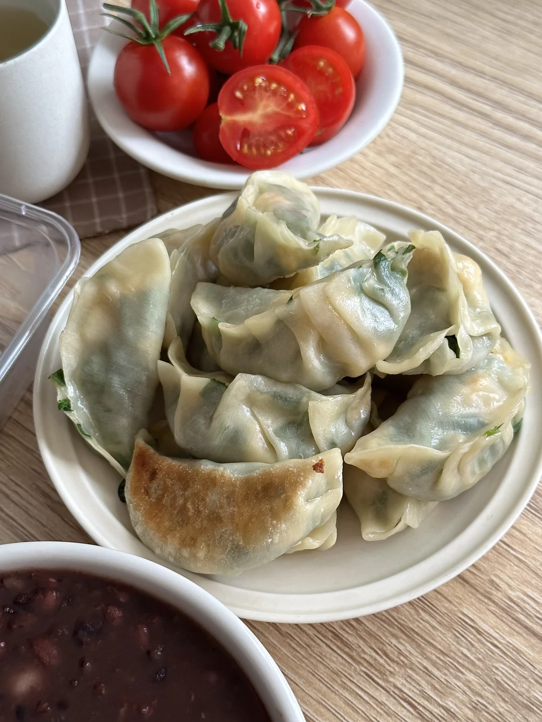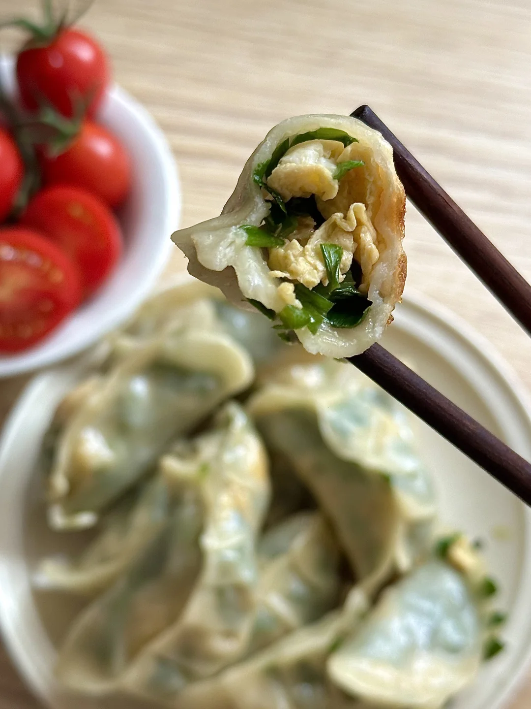 搭配底部煎的焦脆的韭菜鸡蛋饺和卤香大鸡腿,太幸福了!再来几颗小番茄,清爽解腻。