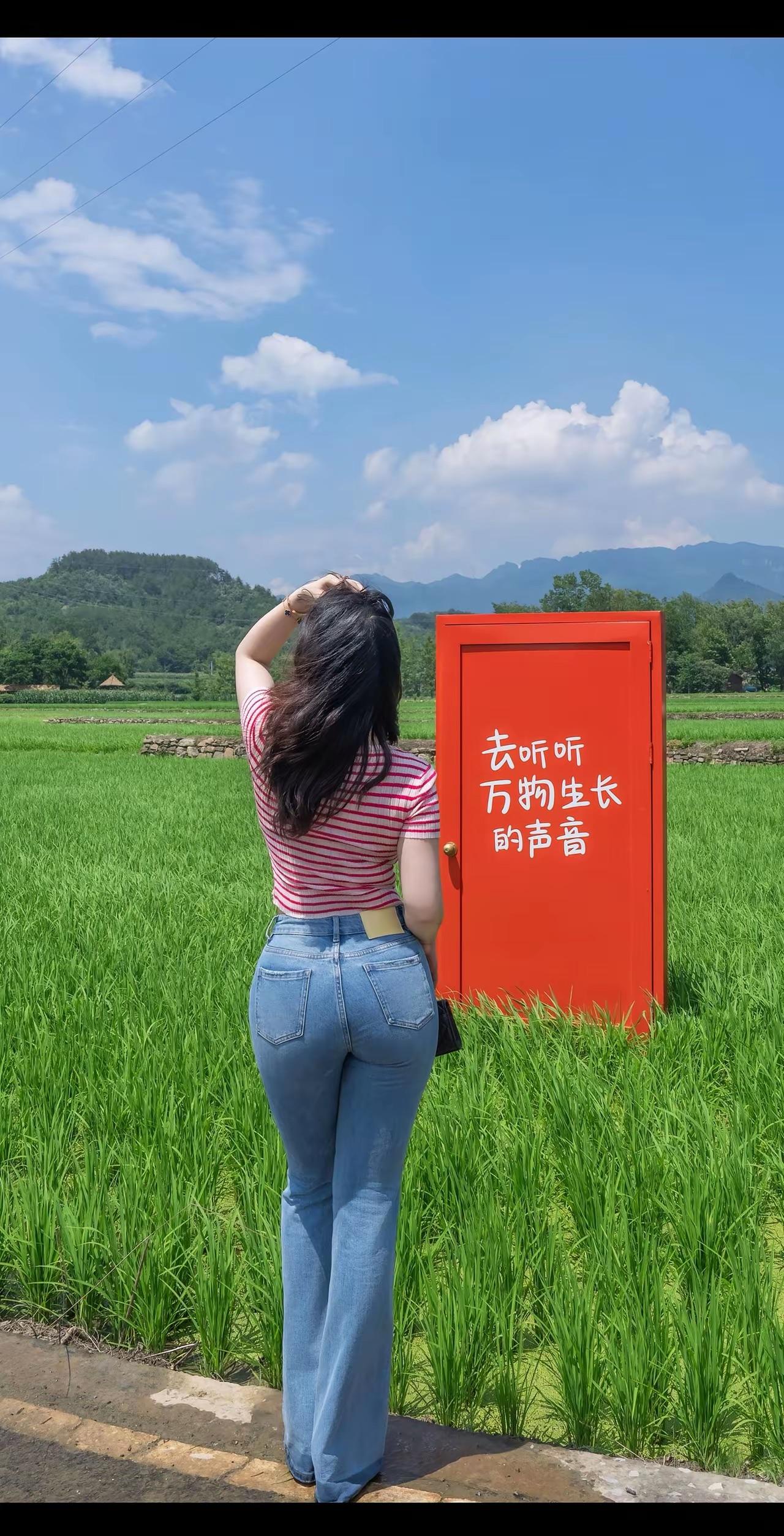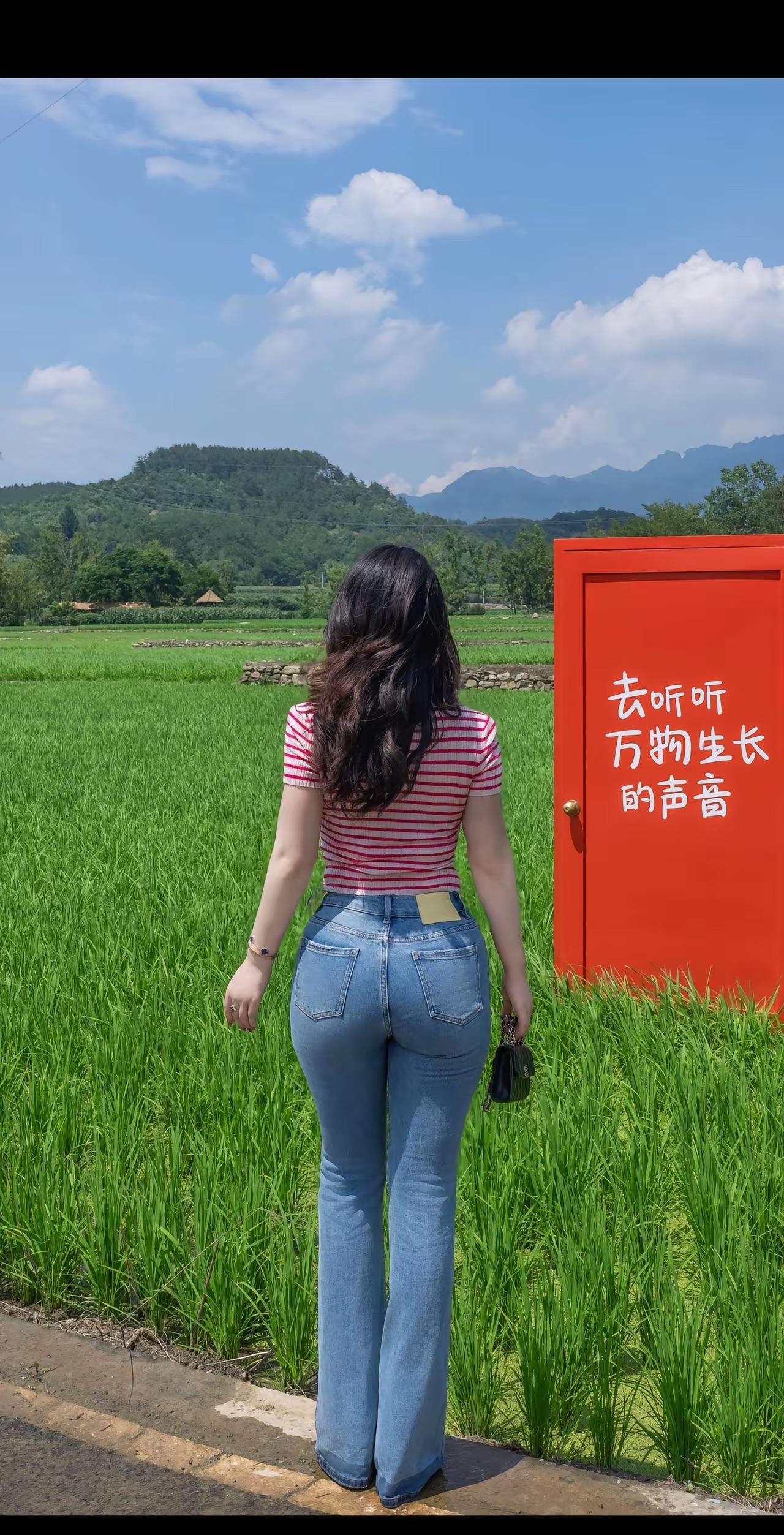 下联:有请🤝🤝🌹🌹 友友请根据图片展示下联 翠绿的稻田边,远山如黛。我身着红条牛仔装,在田埂旁驻足。指尖轻触衣料的质感,空气中弥漫着田园与活力的交融气息。偶尔抬眼望望红色装置与稻浪起伏,思绪也随之鲜活。这样的时光,没有喧嚣,只有穿搭与田园的交融,每一刻都透着田园与知性,仿佛生活的所有褶皱都被这田园魅抚平,只留下满心的惬意与满足。