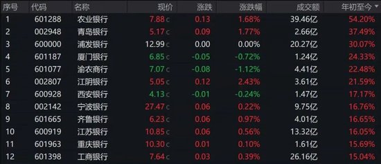 Wind数据显示,从整个银行板块来看,年初至今银行板块整体涨幅为11.50%,除农行外,青岛银行、浦发银行、厦门银行、渝农商行、江阴银行的股价涨幅也超过20%,分别为37.49%、30.07%、24.33%、22.48%和21.59%。不过,华夏银行、光大银行等5只个股年初至今股价下跌,其中华夏银行跌幅最大,为9.95%。