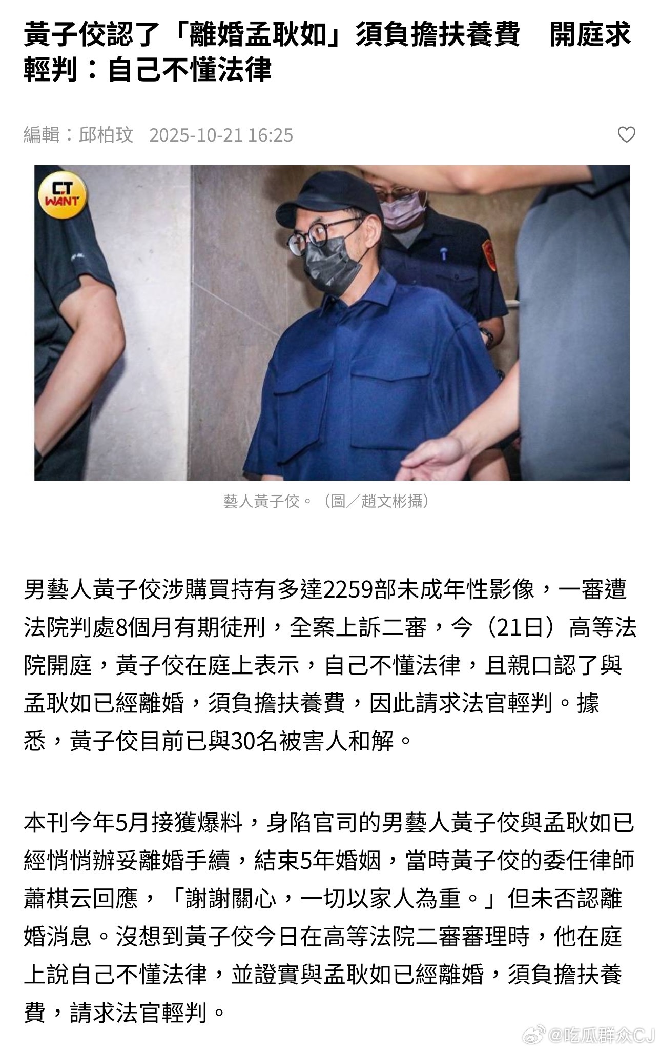 哇,黄子佼的不要脸又到了新高度,自己买未成年性视频被判罚,居然还要上诉,居然还抬出“我离婚了还要给孟耿如付扶养费”当理由求评判……