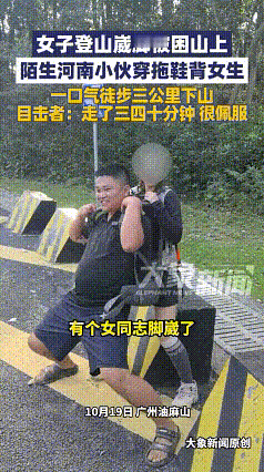广东广州,10月20日报道,一女子登山途中不慎崴脚被困于山间,期间旁人也试图背女子下山,但因女子是个一米七几的大高个,旁人尝试一番后确实也力不从心,正在大伙都犯难之时,一名身材高大,穿着拖鞋的河南小伙由此经过,当河南小伙得知情况后,便立即拿出背带将女子背在背后,一口气徒步三公里耗时四十分,将女子背到了能打车的地方,为此,旁人也对小伙乐于助人的行为,表示敬佩和点赞![紫薇别走] 广州白云山北门附近的山道上,一个女孩单脚靠着树干站立,右脚踝已经肿得像馒头,独自来爬山,结果在一处长满青苔的石阶上脚底一滑,整个人向右侧倒下去,脚踝扭得咔哒一声。 痛得她当场掉了眼泪,手机还有信号,但救护车根本上不来这种山路,她试着挪动,每动一下脚踝就像针扎,只能原地等着。 前后有五六个游客停下来帮忙,一个穿冲锋衣的大哥最先尝试背她,蹲下身让她趴上来,但女孩身高一米七二,体重一百二十多斤,背起来走了不到十米就开始喘,险些脚下一滑两个人一起摔。 “算了算了,太危险,”女孩赶紧让他放下来,又有两个年轻小伙想接力背,但这山路太窄,石阶又陡,背着个人重心不稳,走几步就得停下。 “让让,我来试试,”一个男声从上面传来。人群让开,走过来一个小伙子,个头有一米八,穿着黑T恤和人字拖,背着个灰色登山包,他看起来也就二十六七岁,晒得挺黑。 “你穿拖鞋能行吗?”小伙没多说话,直接蹲下打开背包,掏出一条带扣的宽背带,这种背带户外店有卖,能把重物固定在背上,分散受力点,他熟练地把背带在自己身上绕了一圈,调整好位置,然后冲女孩说:“你趴我背上,我帮你固定好。” 旁边几个人帮忙把女孩扶到他背上,小伙把背带从女孩腿下穿过去,在胸前打了个结,他站起来试了试重心,又调整了一下背带长度。 下山的路全是石阶,又窄又陡,有些地方只能容一个人通过,小伙穿着拖鞋,脚趾直接抓着石头边缘,一步一步往下挪,女孩趴在他背上,能感觉到他每一步都很稳,但背部的肌肉越来越紧绷。 走了大概十分钟,小伙的T恤后背已经湿透了,他在一个稍微宽敞的平台停下来,调整了一下背带,喘了几口气,要不要休息一会儿?她看到小伙的脖子上汗水一滴滴往下掉。 不用,一口气背下去比较快,后面跟着的几个游客想帮忙接手,小伙摆摆手:“我对这山路比较熟,知道哪里能踩哪里不能踩,换人反而容易出事。” 越往下走坡度越陡,小伙放慢了速度,左手扶着旁边的护栏,右手从背后托着女孩的腿,侧着身子一级一级往下蹭,女孩能听到他粗重的喘息声,手心都是汗。 小伙背着女孩一直走到停车场边上,才慢慢蹲下来,让旁人帮忙解开背带,他自己直接坐到地上,T恤湿得能拧出水来,脸涨得通红,喘了好一会儿才缓过来。 “大哥,留个联系方式吧,改天请你吃饭,”小伙站起来拍拍身上的土:“不用不用,举手之劳,”他收好背带塞回包里,冲大家挥挥手,转身又往山上走了。 女孩被送到医院,诊断是右脚踝韧带撕裂,需要打石膏休养一个月,她后来在朋友圈发了条状态,说今天遇到贵人了,可惜连名字都不知道。 网友热评: “看看人家这退伍军人的身体素质,穿拖鞋都能稳如泰山,佩服!” “为什么总有人用自己狭隘的心理去度量别人的善良?” “帮忙光有心还不够,得像这样有智慧、有方法,才能真的帮到位又不给自己惹麻烦。” “我们不能让无端的网络暴力寒了做好事者的心。” 如果您在路上遇到类似需要帮助的情况,您会上前帮忙吗?为什么?欢迎在评论区分享您的看法和经历! 信源:大象新闻