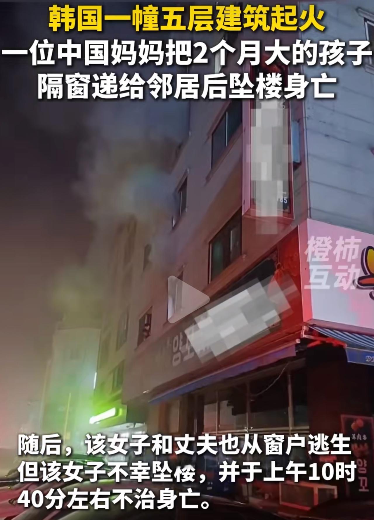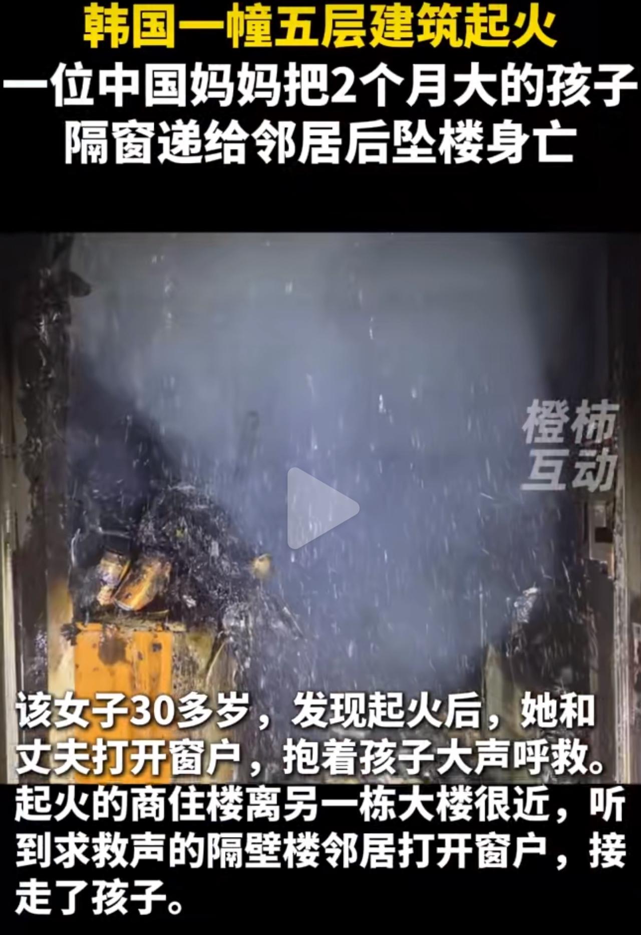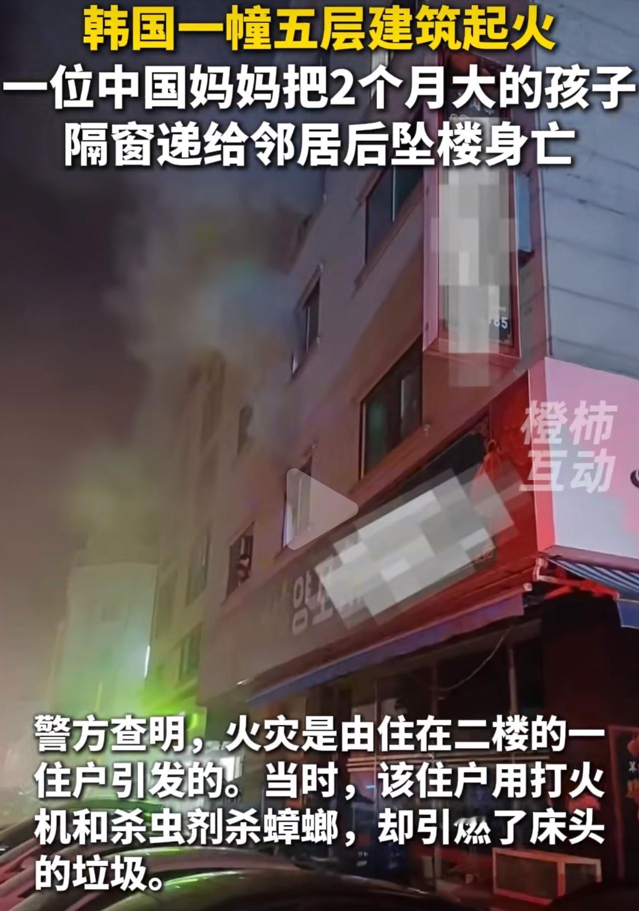 30岁中国妈妈隔窗递出2个月大的娃,自己却从5楼掉下去了…谁能想到啊,就因为有人想灭个蟑螂,结果愣是让一位中国妈妈,再也见不着刚满月的孩子了! 2025年10月20日凌晨五点多,韩国乌山市那栋五层的商住楼,好端端的突然就冒起火来,一点儿征兆都没有!三十来岁的她,怀里抱着才俩月大的宝宝,在五楼窗户边急得眼泪都快掉下来了,手都忍不住有点抖。整栋楼32户人家全慌了神,火窜得比谁想的都快,浓烟没一会儿就把楼道堵得严严实实。 还好隔壁楼离得近,俩楼之间不到1米,有人敢冒险开窗喊:“把孩子先递过来!”她啥也没多想,先小心翼翼把宝宝送了过去,她老公跟着就翻窗逃到隔壁了。可轮到她的时候,不知道是没力气了,还是被浓烟呛得没站稳,身子一滑,就从楼上摔下去了。 到了上午10点40分,医院那边传来信儿——她没救过来。后来才搞清楚,这场火居然是二楼有人用打火机配杀虫剂灭蟑螂,没留神点着了床头堆的垃圾引起来的。还有8个邻居因为吸了浓烟受伤,32户人家的家全烧没了。 看新闻里说,她最后那几秒还死死护着孩子呢。她当时心里指定就一个念头:只要娃能安全,我咋样都无所谓。可谁能想到,她连再抱一回宝宝的机会都没有了啊!要是楼间距能宽点儿,说不定还能有别的逃生路呢?要是当初没人在床头堆那些易燃玩意儿,是不是就没这事儿了? 可话又说回来,哪有那么多“要是”啊!事儿都已经这样了,再咋想也没用了。就盼着这事儿能让更多人记牢:家里别堆易燃的玩意儿,用杀虫剂的时候绝对不能碰明火,在国外住更得提前摸清楚消防通道在哪儿。这位妈妈是拿命护住了孩子,这份母爱,真的太让人忍不住掉眼泪了…火灾有多可怕 韩国大火中国妈妈隔窗送出孩子后坠亡