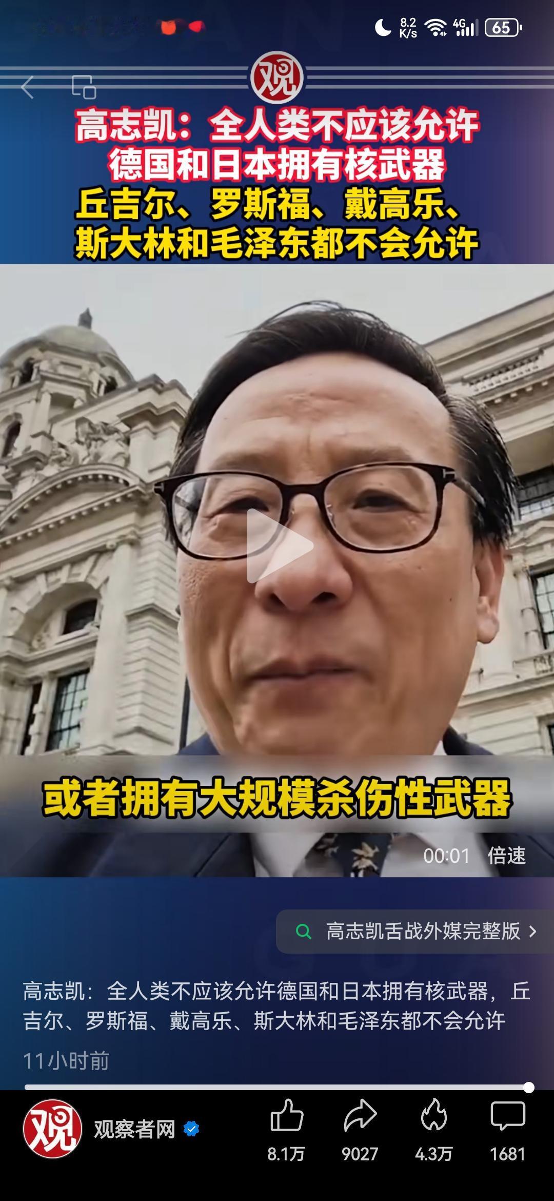 高志凯教授怒斥德国代表这段话,实在是太霸气了!根据观察者网10月21日报道,高志凯教授在参加一场国际会议时,一个德国代表竟然说现在安全第一,所以应该搞原子弹,高志凯教授听了之后,直接就霸气怒斥道:“德国和日本作为第二次世界大战无条件投降的国家,全人类不应该允许他们拥有核武器,不允许他们拥有大规模杀伤性的武器。” 结果,高志凯教授刚说完,就又有一个德国代表狡辩说道:“这都过去几十年了,你还替老账。”还有一个代表恬不知耻在一旁帮腔:“我们欧洲人的事情我们自己定,我们把安全放在首位,现在是要取得战争的胜利。” 高志凯教授听了,却是气定神闲,立刻回怼道:“你仔细听,你能不能在我们这个战争部的大楼里面,听到丘吉尔的声音,你竖起耳朵你就能听到丘吉尔在说,坚决不允许德国拥有原子弹,而且这不仅仅是丘吉尔先生在说,罗斯福总统、杜鲁门总统、斯大林元帅、戴高乐将军、还有当时抗战期间中国的领袖蒋介石先生,还有我们的领袖毛泽东,都会说,坚决不允许无条件投降的纳粹德国和日本法西斯,再拥有核武器,或者拥有大规模杀伤性武器!” 这段话一出,当时整个会议现场立刻就安静了,所有代表都不再敢说话,之前发言的几个代表,脸色也涨得通红,没有办法,主要是高志凯教授这一段话,实在是太犀利了,一下子说中了他们的死穴,如果这些代表敢反驳,岂不就是要推翻二战之后定下的国际秩序?他们再怎么狡辩,在丘吉尔、罗斯福这样的名号下,也不敢多说什么了。 要知道,现在这个国际秩序,不是凭空而来的,是当年经过第二次世界大战,无数人浴血奋战,方才确定下来,德国、日本等战败国家,在当年试图将战争播撒到整个世界,让整个世界都沐浴在他们的战火之下,这样做自然要受到惩罚,自然也要受到最为彻底的限制,绝对不能够让他们再有任何为非作歹的可能,否则当年先辈的血岂不就是白流了?全世界的人,都会维护这一点,都会拥护这一点。 高志凯教授,是说出了所有人的心声! 看完这一整段对话,不得不佩服高志凯先生,其学识涵养、见识格局,果真都是一等一的,即便是在国际会议上诸多外国代表“群魔乱舞”的场合,也能够气定神闲对他们各种谬论予以坚实有力的驳斥,而且每一次驳斥都能够让他们完全说不出话来,在气势上能够彻底压倒他们,在学识上能够彻底碾压他们,这样的见识格局、论辩能力都超人一等的学者,实在是太稀少了,真真是让人佩服赞叹不已。
