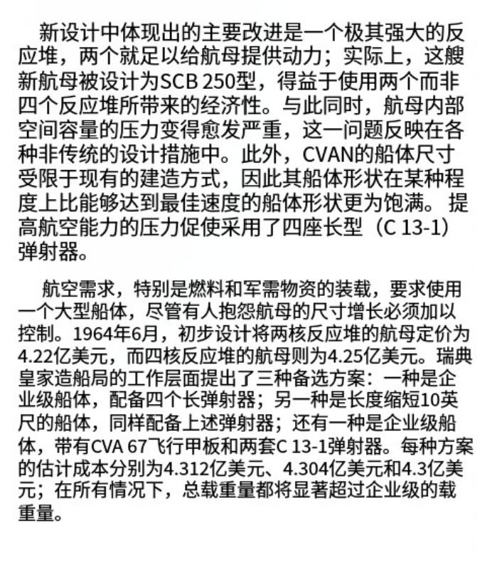 双堆的主要缺点在于主动力系统的理论安全冗余度——2堆意味着仅有航母上仅有2个独立式的反应堆舱段,在作战中只要有一个堆舱受损,全舰动力-电力输出功率将直接减半。而分舱结构与小鹰级有点类似的4堆方案,将设置4个容纳反应堆的动力舱段,任意一个舱段受损时仅会折损25%的动力-电力总功率,理论上安全冗余度更高