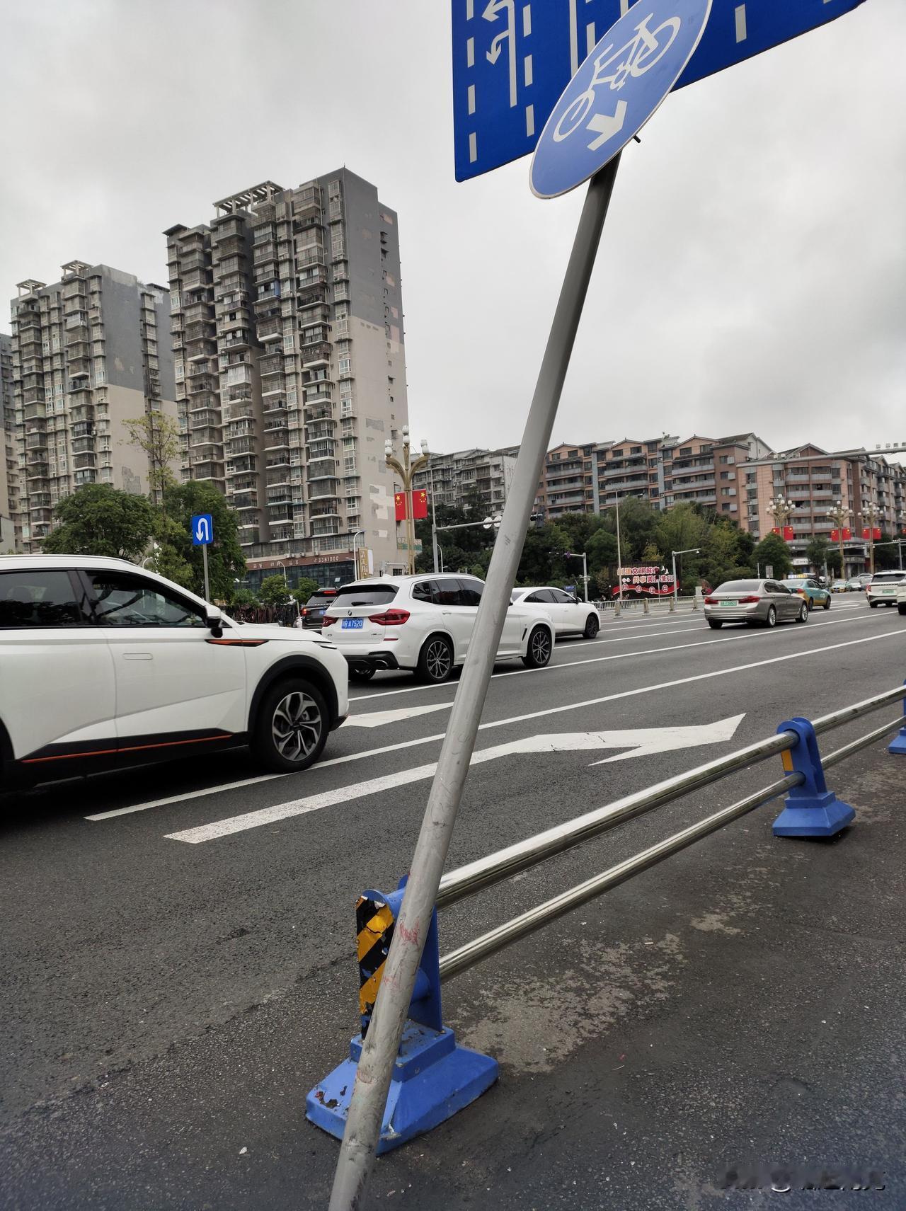 网友爆料称:20日, 在南充市嘉陵江三桥高坪段下桥处看到一路口非机动车道靠右的标志牌向下倾斜有隐患。 “20日,11时许经过看到这个标志牌倾斜角度大且路面混泥土已然松动,像随时都有倒下来的可能骑行的朋友经过该路段时一定要注意多观察、避让等, 同时也希望相关部门能够及时整改, 网友说。”
