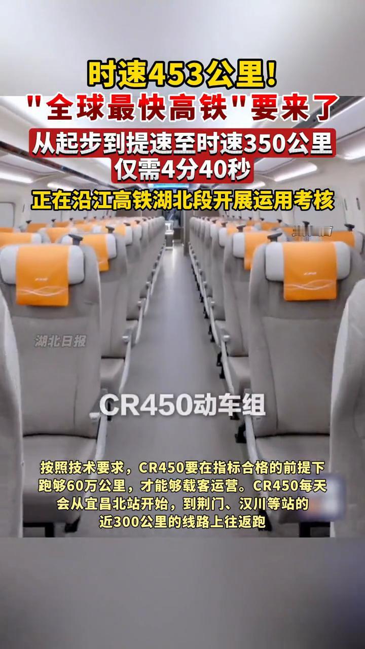 时速453公里!"全球最快高铁"要来了! 从起步到提速至时速350公里仅需4分40秒,正在沿江高铁湖北段开展运用考核。被称作"全球最快高铁"的CR450动车组正在沪渝蓉高铁(沿江高铁)开展运用考核。去年底CR450动车组样车公布后,正在不同速度、不同场景中进行多项试验。试验期间CR450动车组跑出了动车组单列时速453公里,相对交会时速896公里的最新纪录。 CR450动车组车头15米长,比目前时速350公里的复兴号长2.5米,车头更尖更细,阻力更小,整个车身更加紧致,车底部的裙板更低,车轮露出的部分更少,像跑车一样底盘越低跑得越快。按照技术要求,CR450要在指标合格的前提下跑够60万公里才能够载客运营。 CR450每天会从宜昌北站开始,到荆门、汉川等站的近300公里的线路上往返跑。CR450动车组从起步到提速至时速350公里只需要4分40秒,而时速350公里复兴号动车组则是需要6分20秒,这个提速的周期缩短了100秒。 据介绍,CR450动车组明年将会在成渝中线展开更接近运营条件的全面测试。高铁运营效率 高铁上速度 350公里高铁
