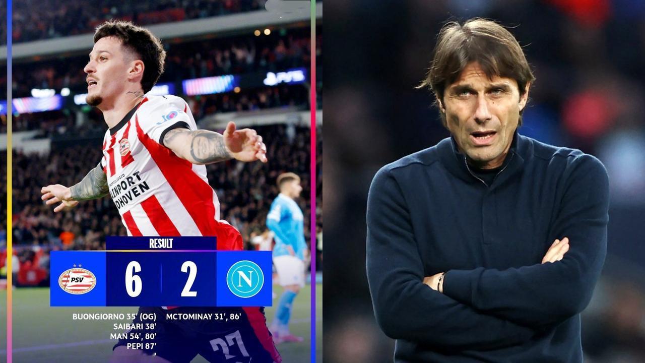 欧冠:十人那不勒斯客场2-6惨败给埃因霍温,孔蒂带队双线作战近5场3负。 麦克托米奈双响,卢卡染红,埃因霍温多点开花。