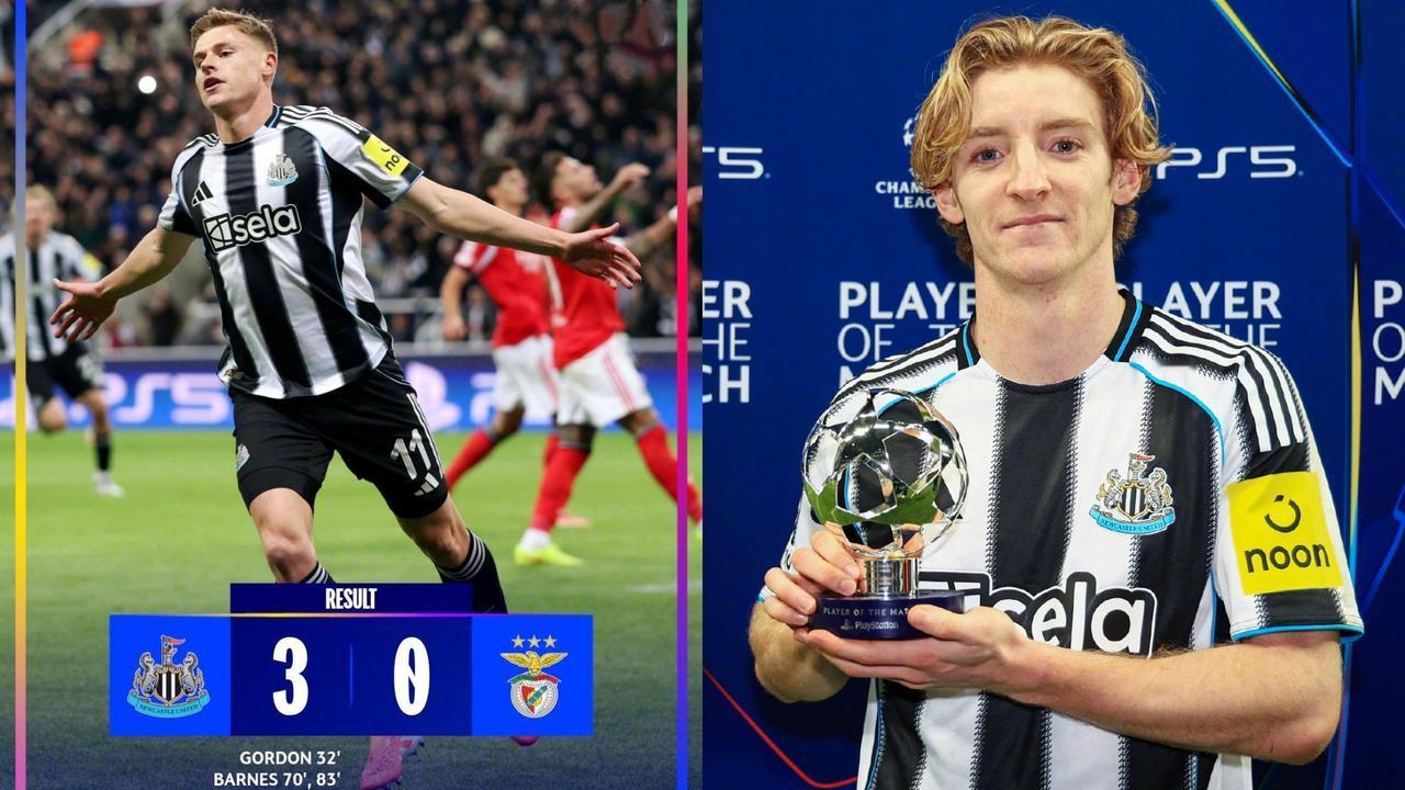 欧冠:纽卡斯尔联主场3-0拿下本菲卡,收获欧冠两连胜。 戈登首开记录,巴恩斯完成双响,本菲卡欧冠遭遇3连败。